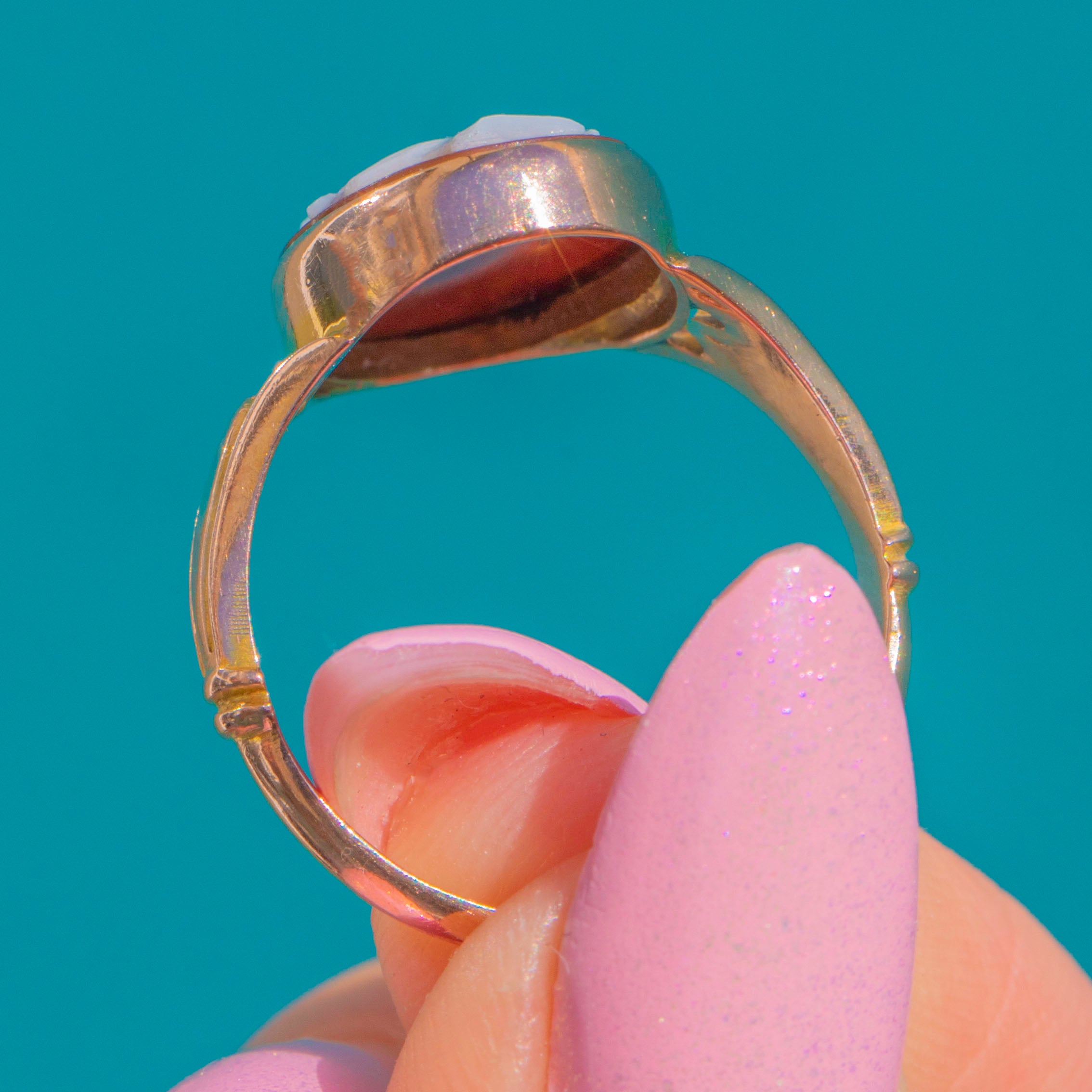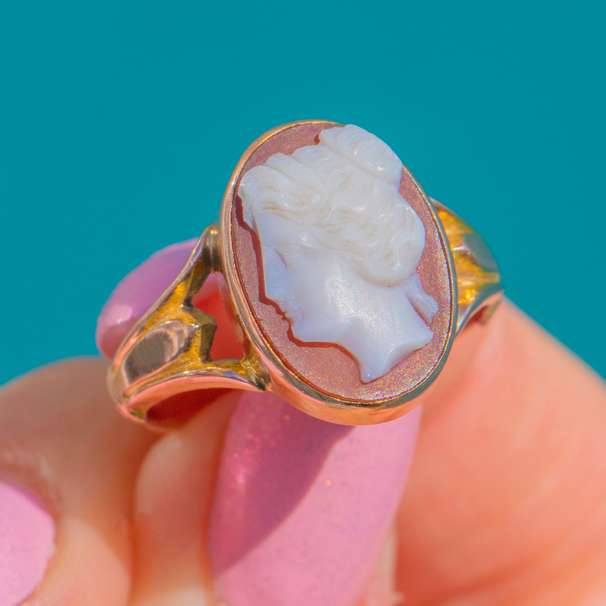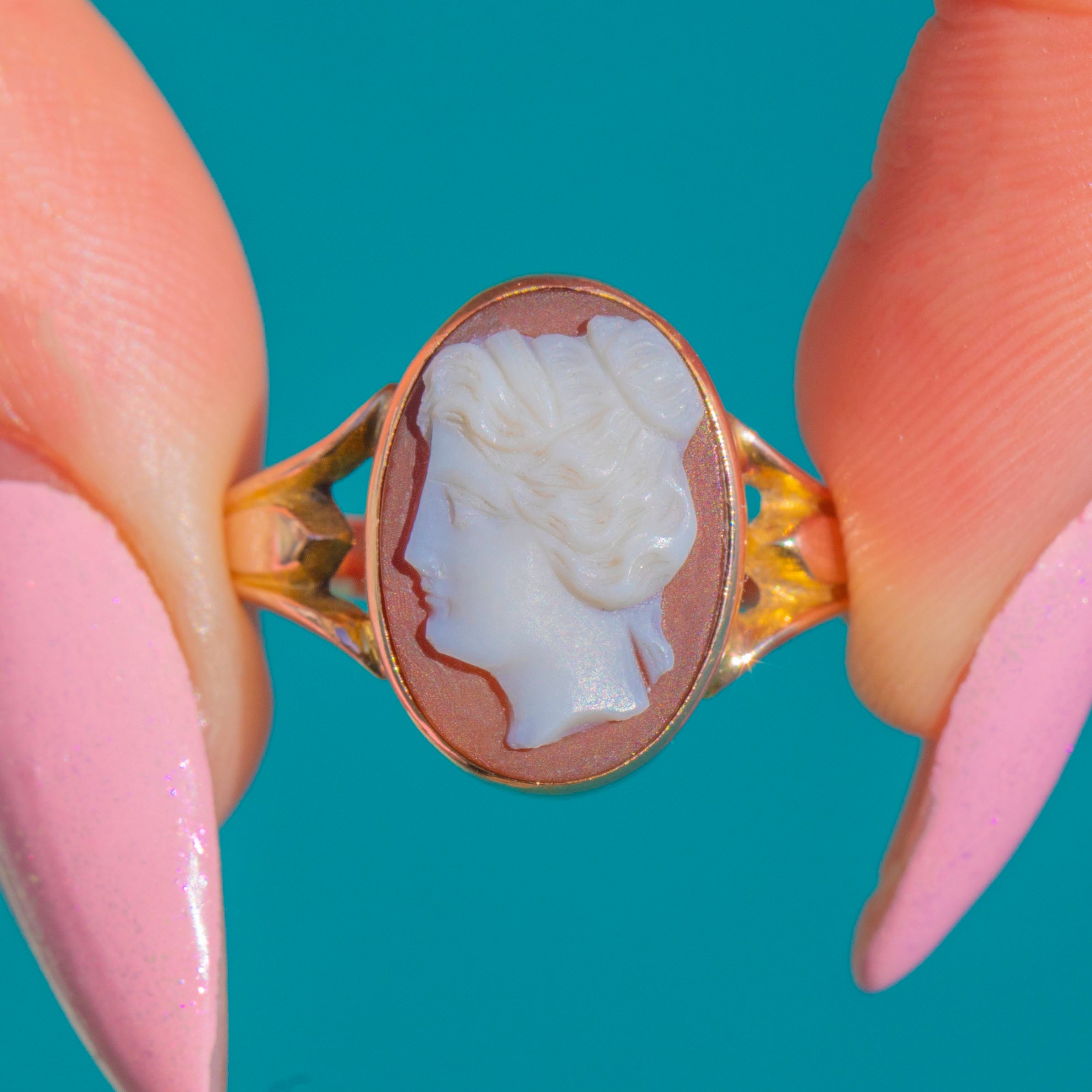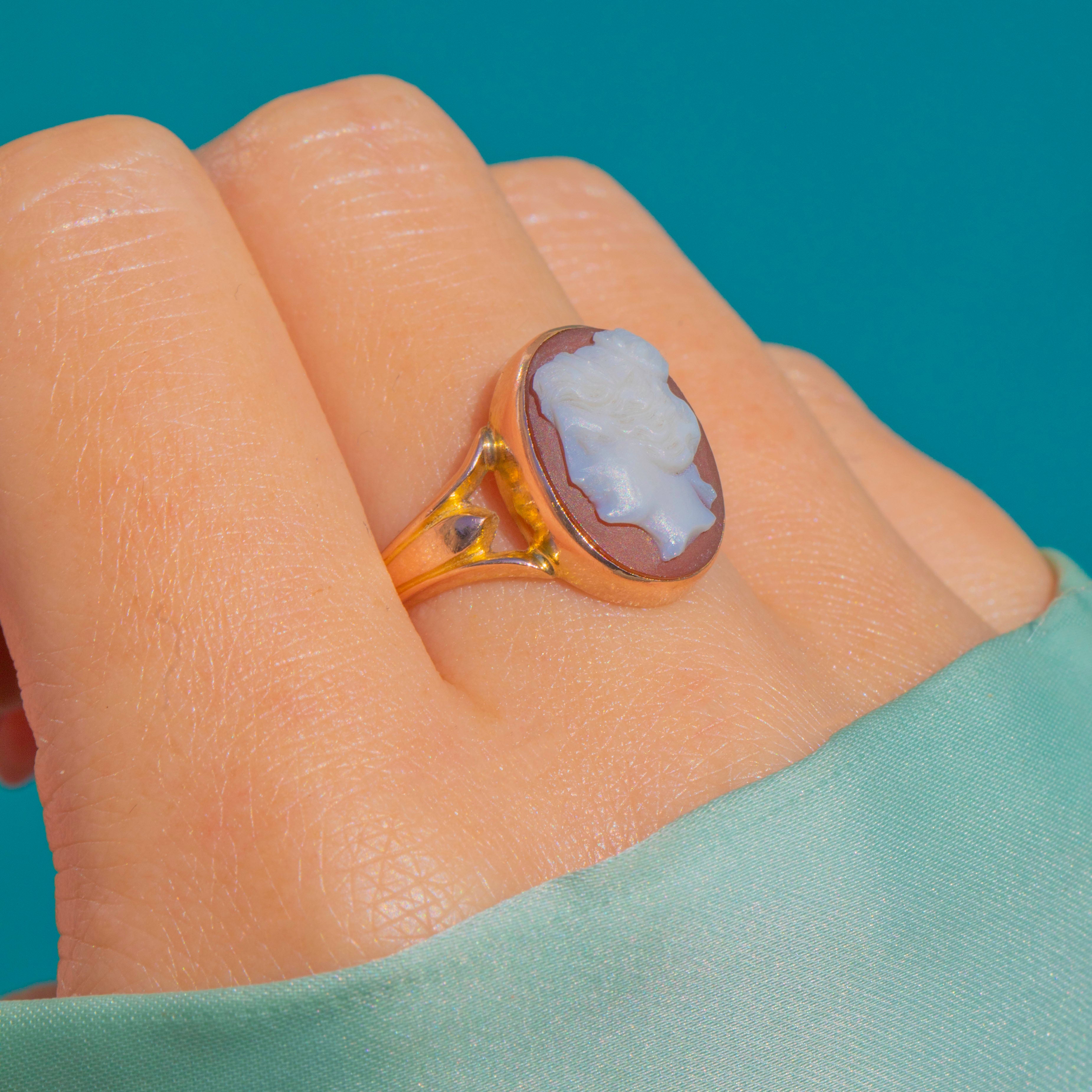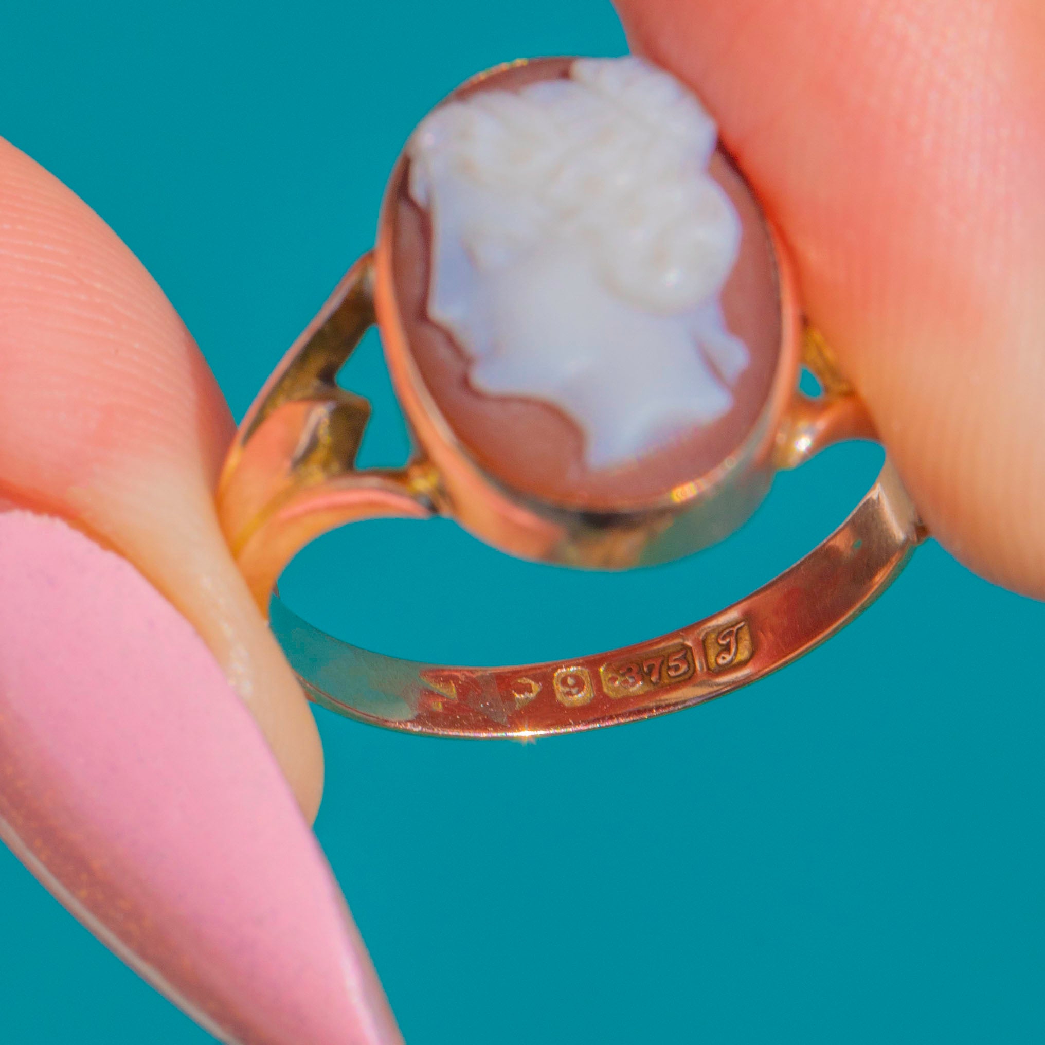 温かみのある9ctゴールドで仕立てられた、20世紀初頭の魅力的なサードオニックスアゲートカメオリングです。鮮やかな白の横顔が、豊かなタンブラウンの地にハイレリーフで彫刻され、繊細なクローズドコレットと優美な透かし入りスプリットショルダーが、洗練されたフェミニンなシルエットを引き立てます。