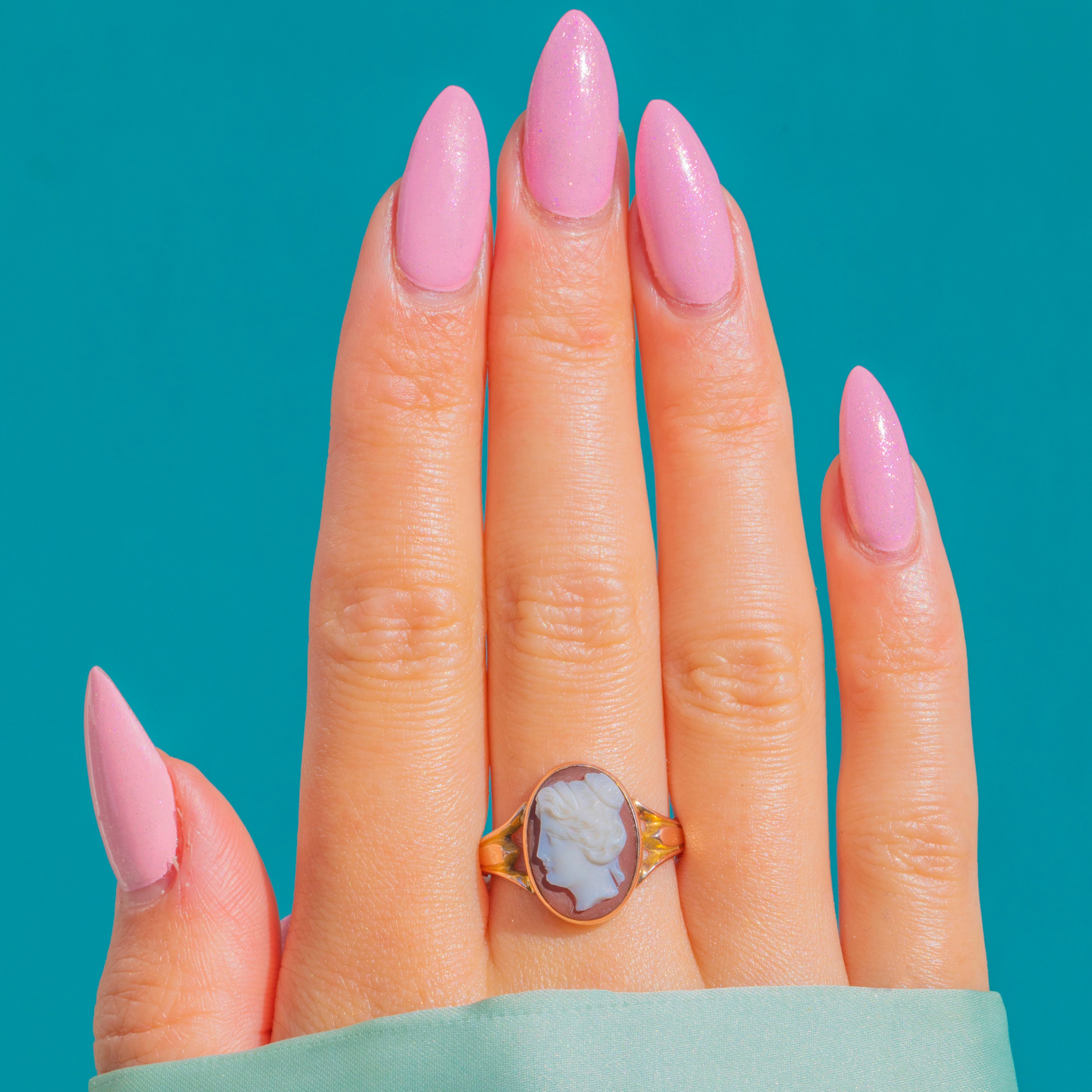エレガントで日常使いにも適したこの1919年製のジュエリーは、古典的なネオクラシカルの芸術性と繊細なゴールドセッティングが融合しています。カメオの彫刻は美しい立体感と質感を持ち、単独でも、リングの重ね付けでも時代を超えたアクセントを添えます。