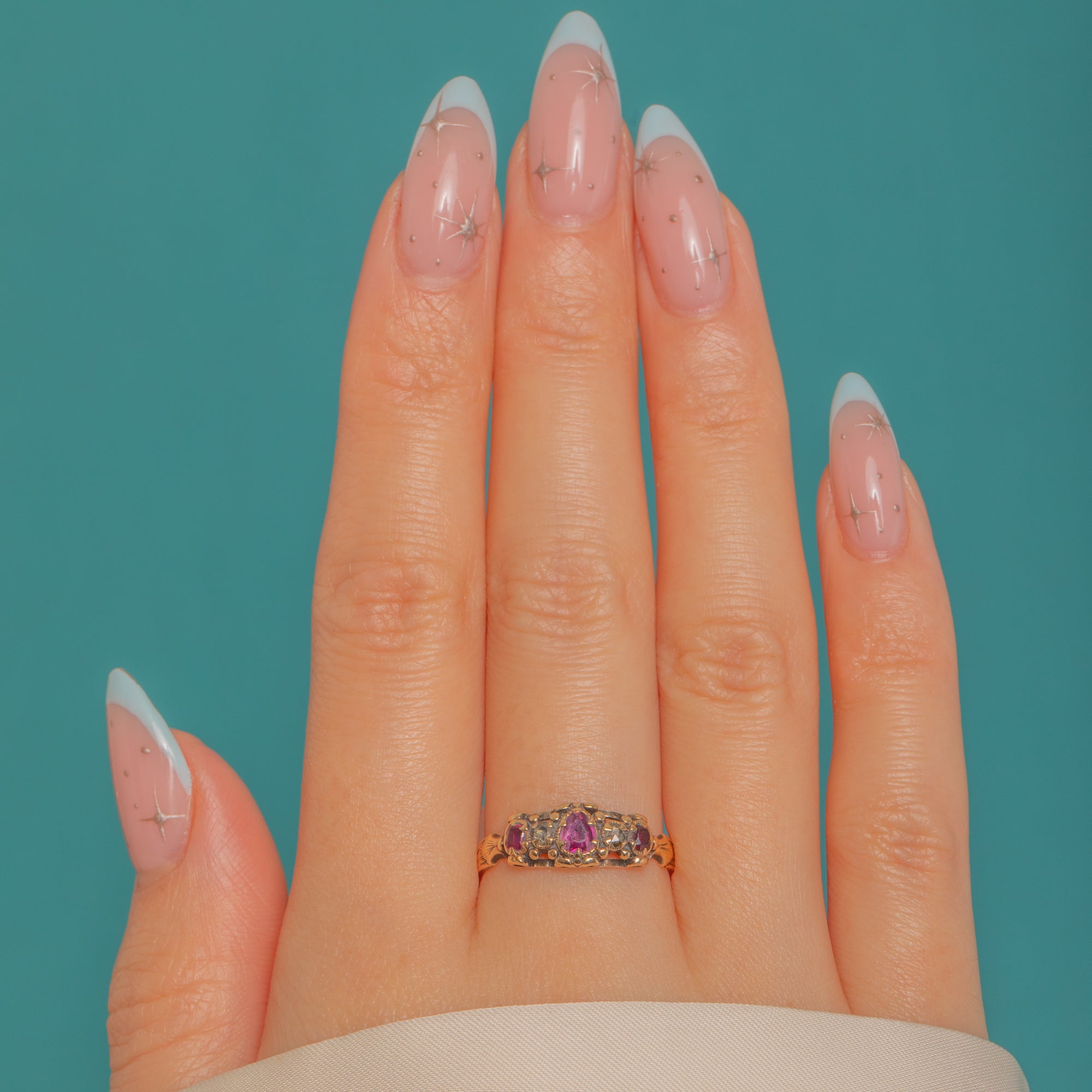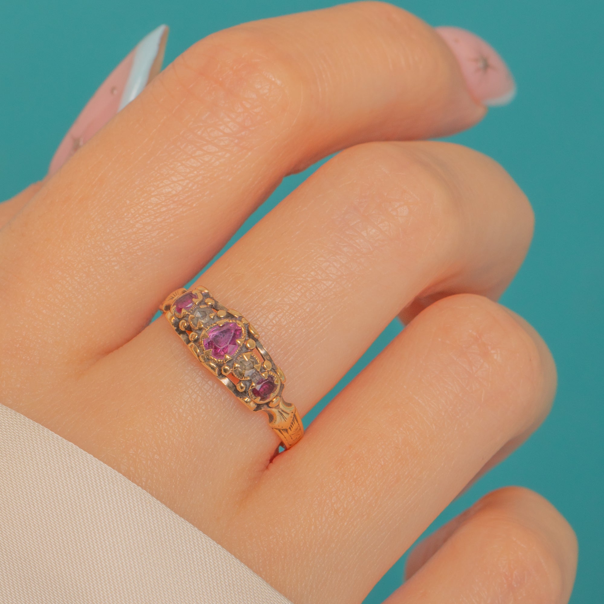 Romantic and exquisitely detailed, this early Victorian five-stone ring captures elegance in a low, boat-shaped cluster. A pear-shaped Ruby glows at the centre, flanked by cushion-cut Rubies and twinkling rose-cut Diamonds for a delicate sparkle. The head sits low and refined with cut-down, pie-crust style settings, while foliate-engraved shoulders and a beautifully pierced under-gallery add artisanal charm.