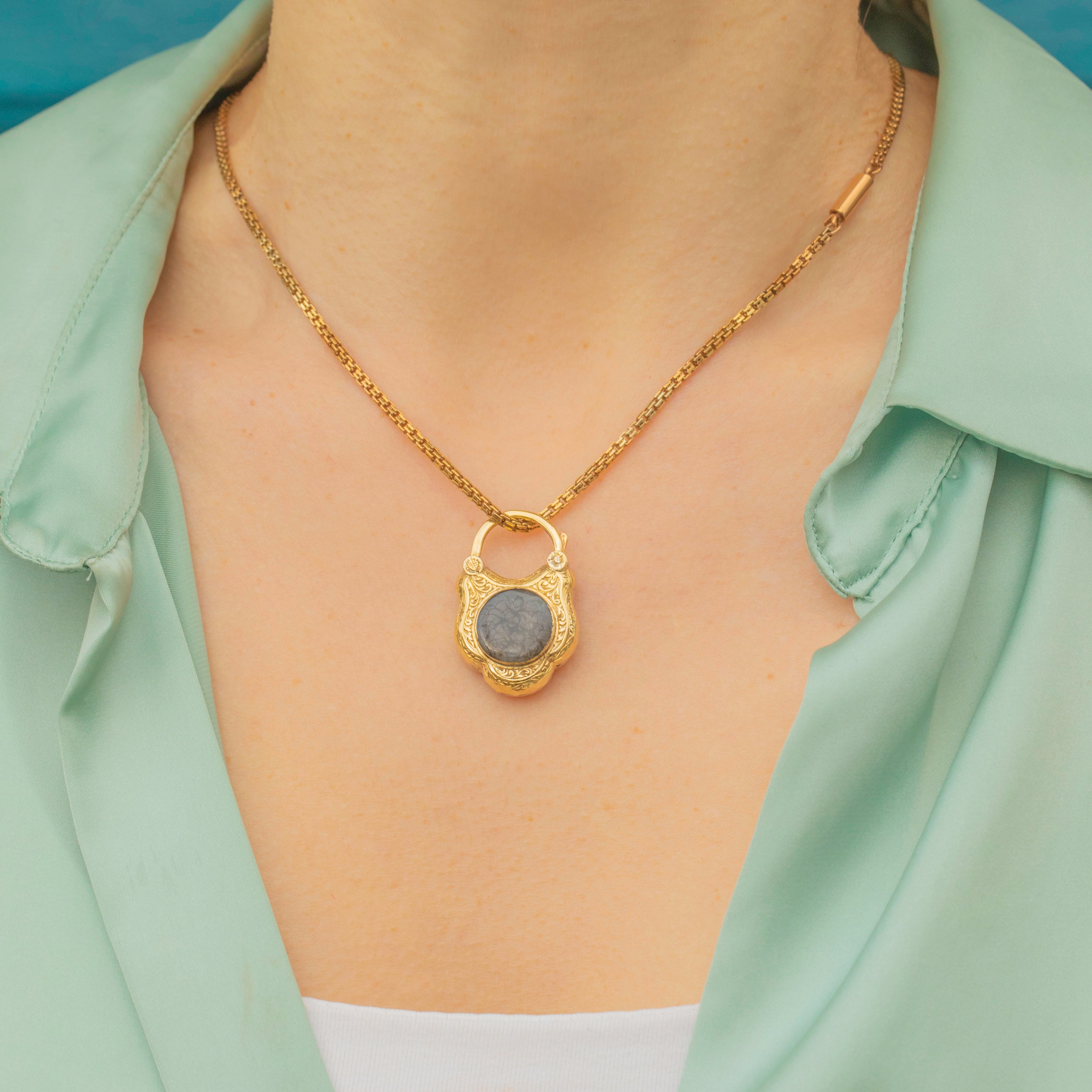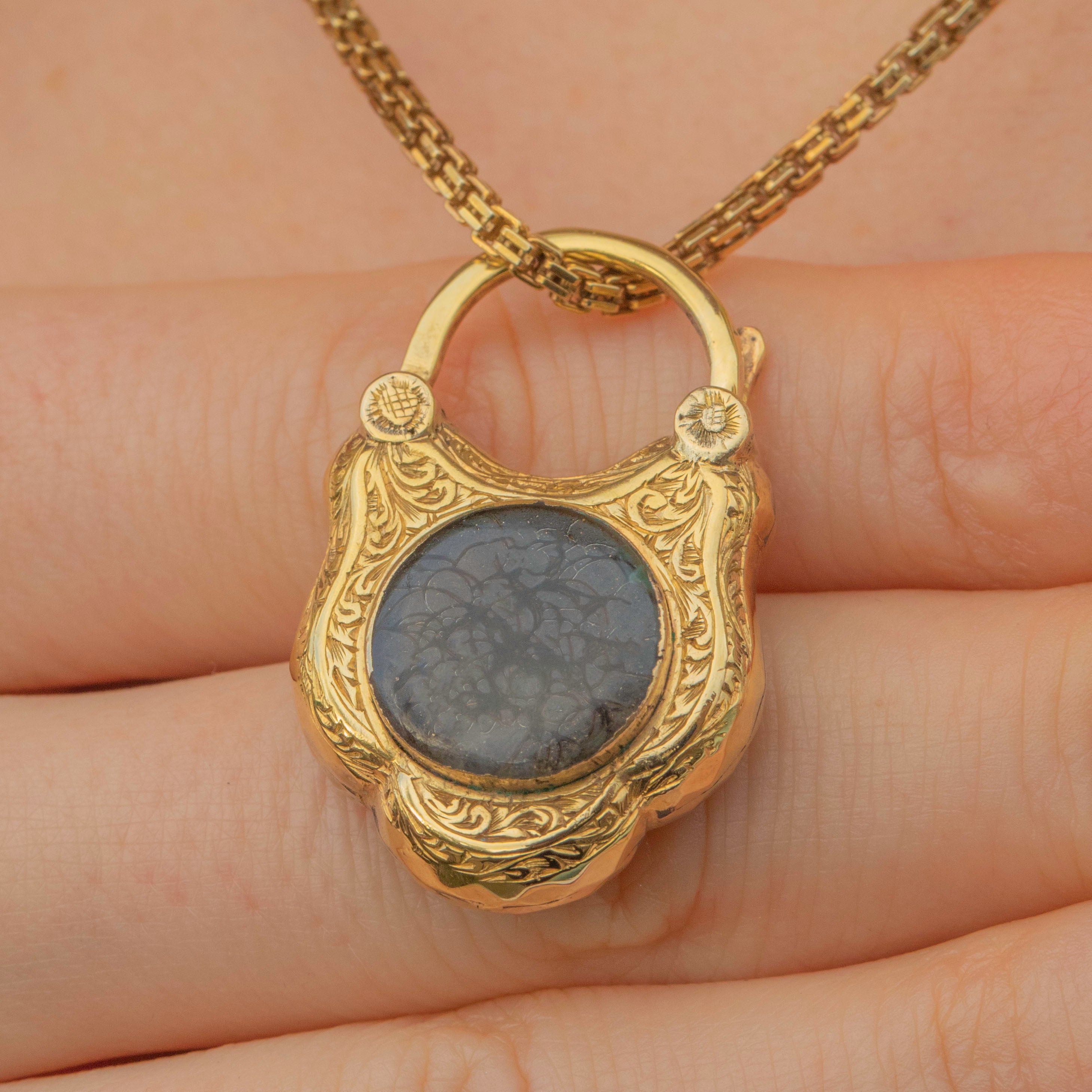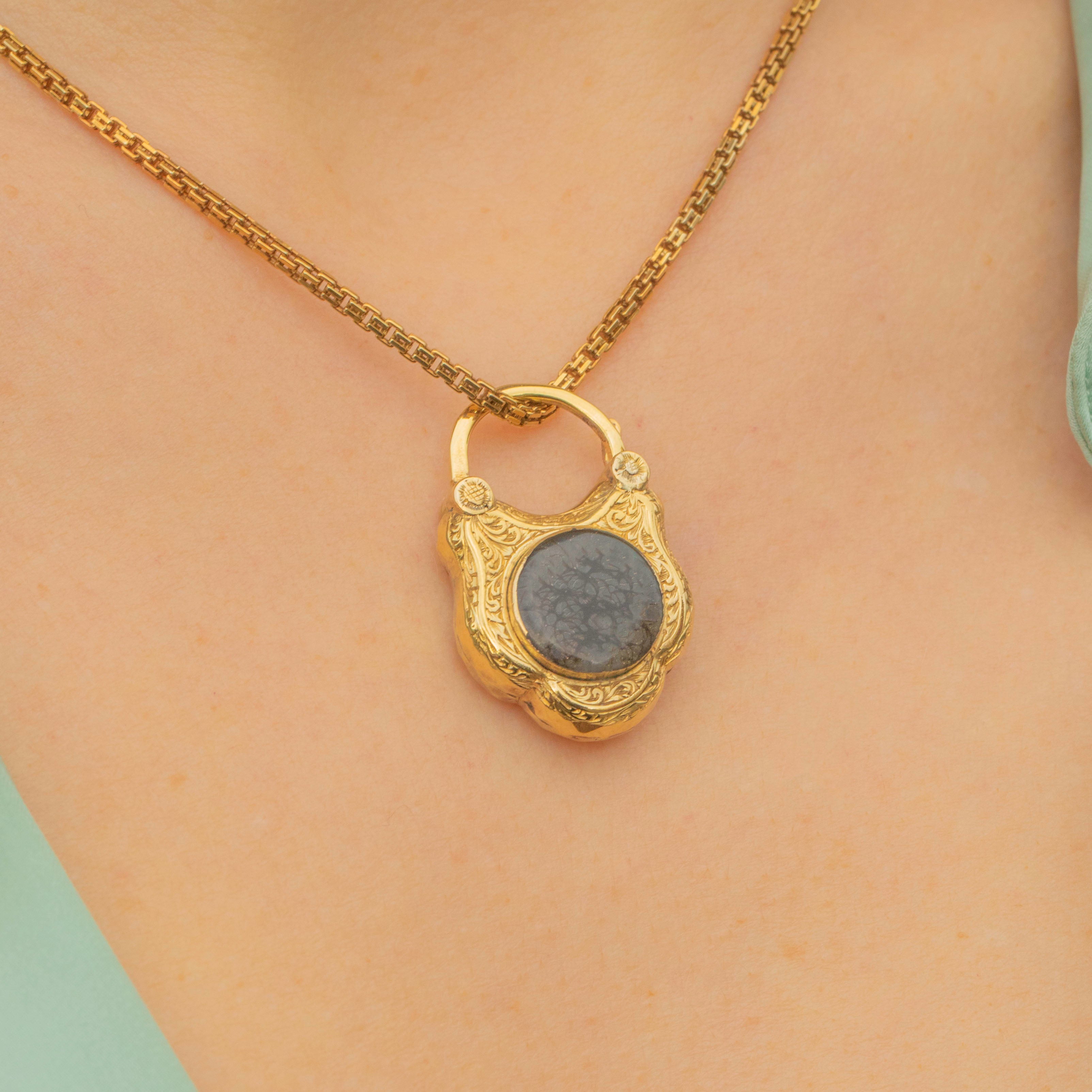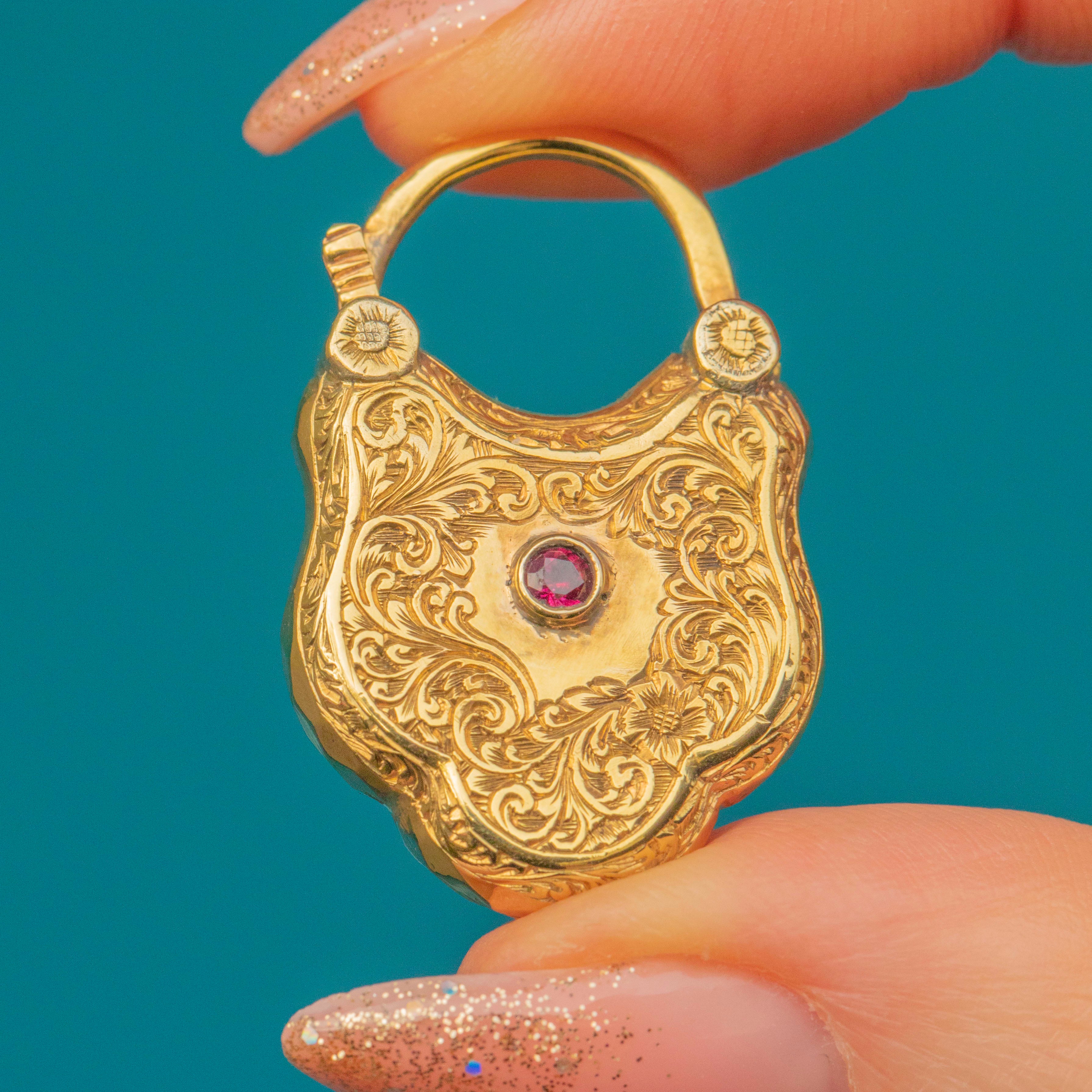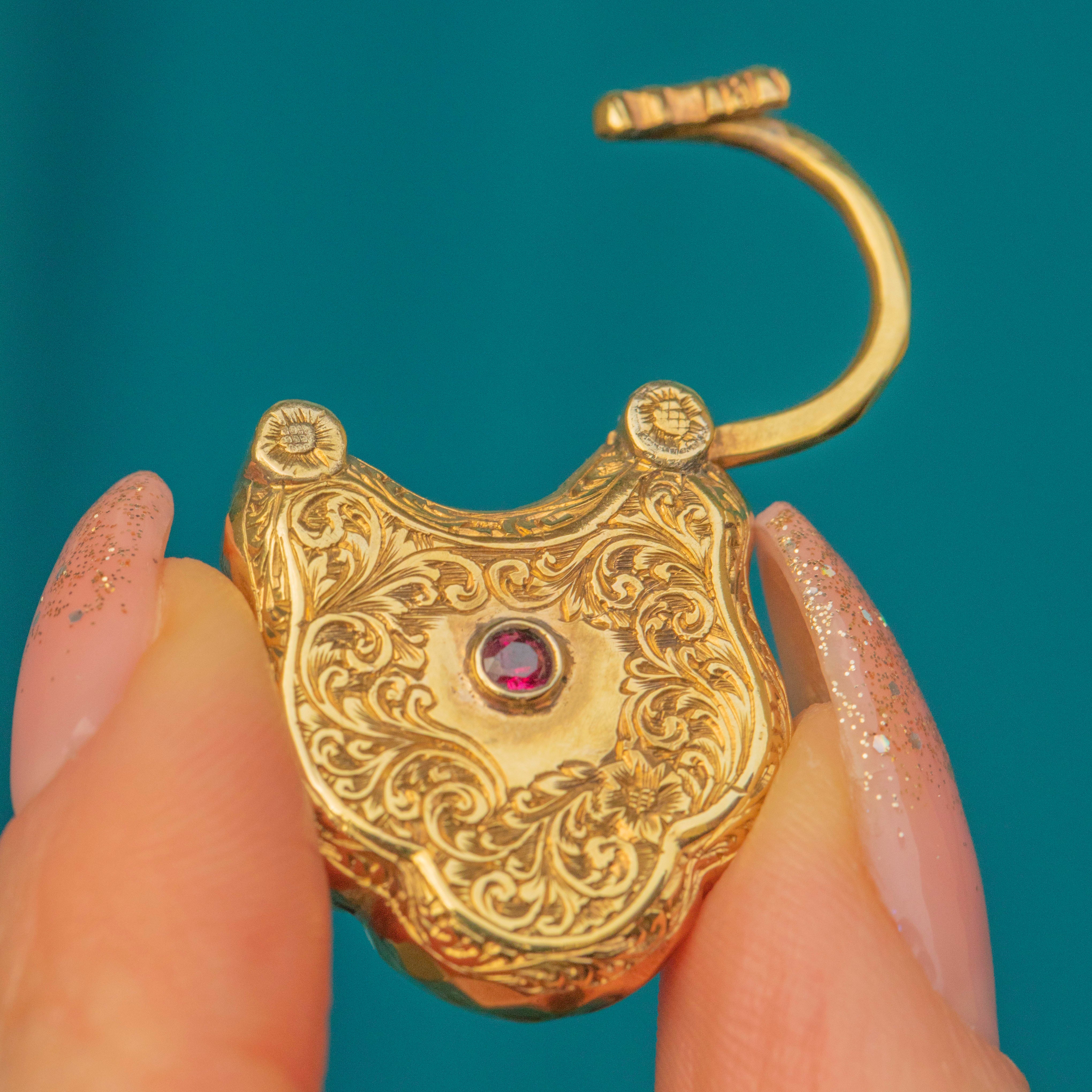 Add a touch of romance to your neck stack with this Early Victorian 9ct Gold engraved Ruby padlock pendant!