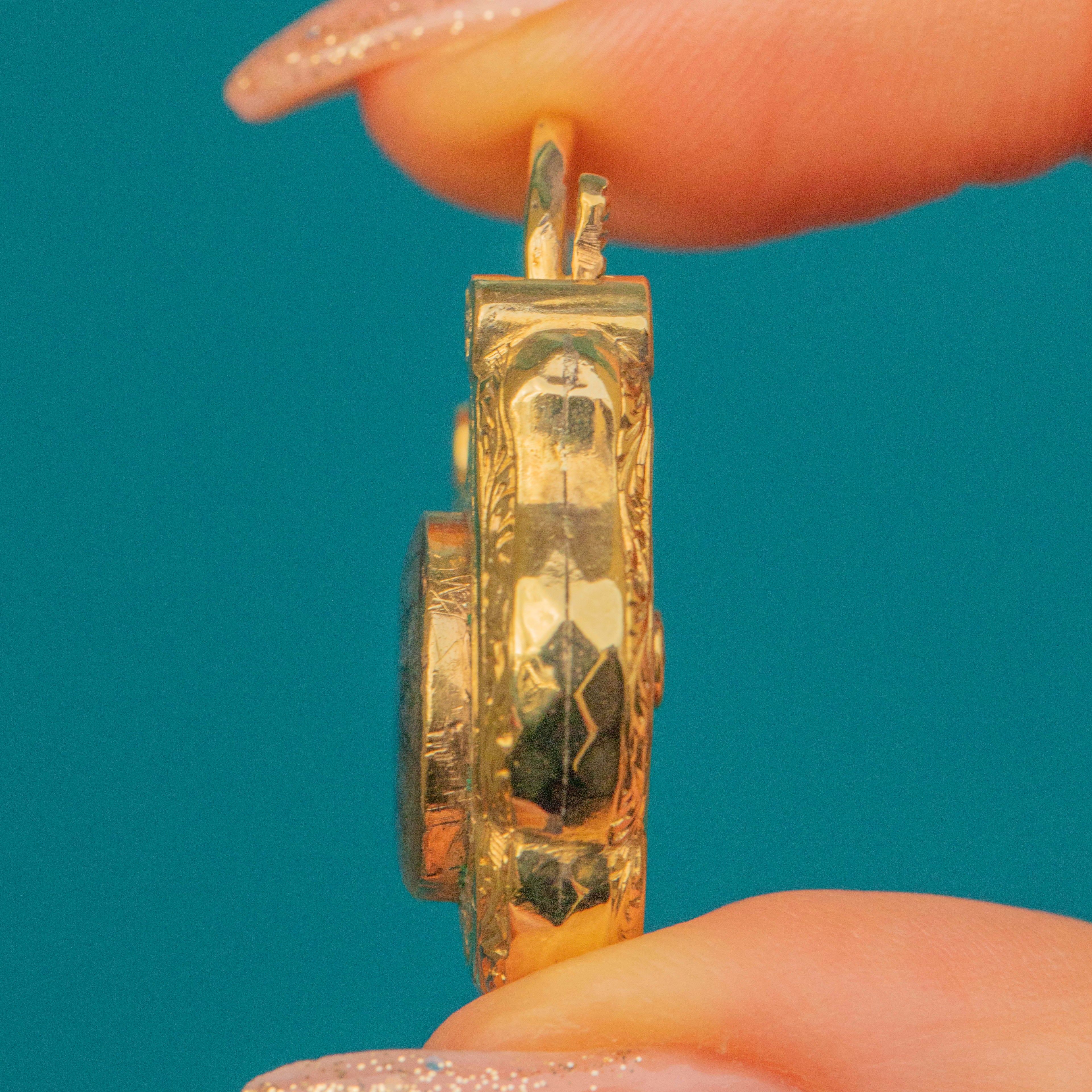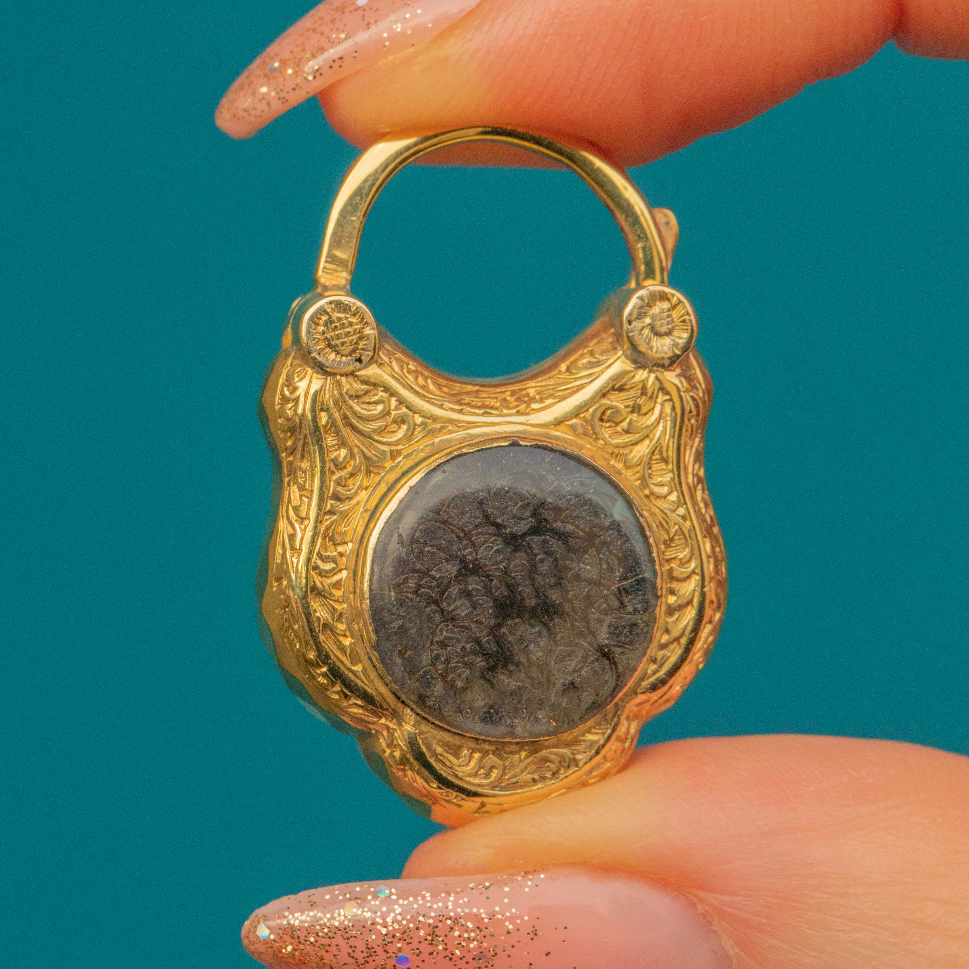 Crafted from buttery 9ct Gold, this antique padlock features beautiful intricate engravings in classic early Victorian style. She is adorned with a stunning crimson Ruby, effortlessly complimented by the warmth of the 9ct Gold. Additionally featuring a glass back with woven hair, this Gold pendant is quintessentially Victorian and a great piece for collectors and romantics alike!
