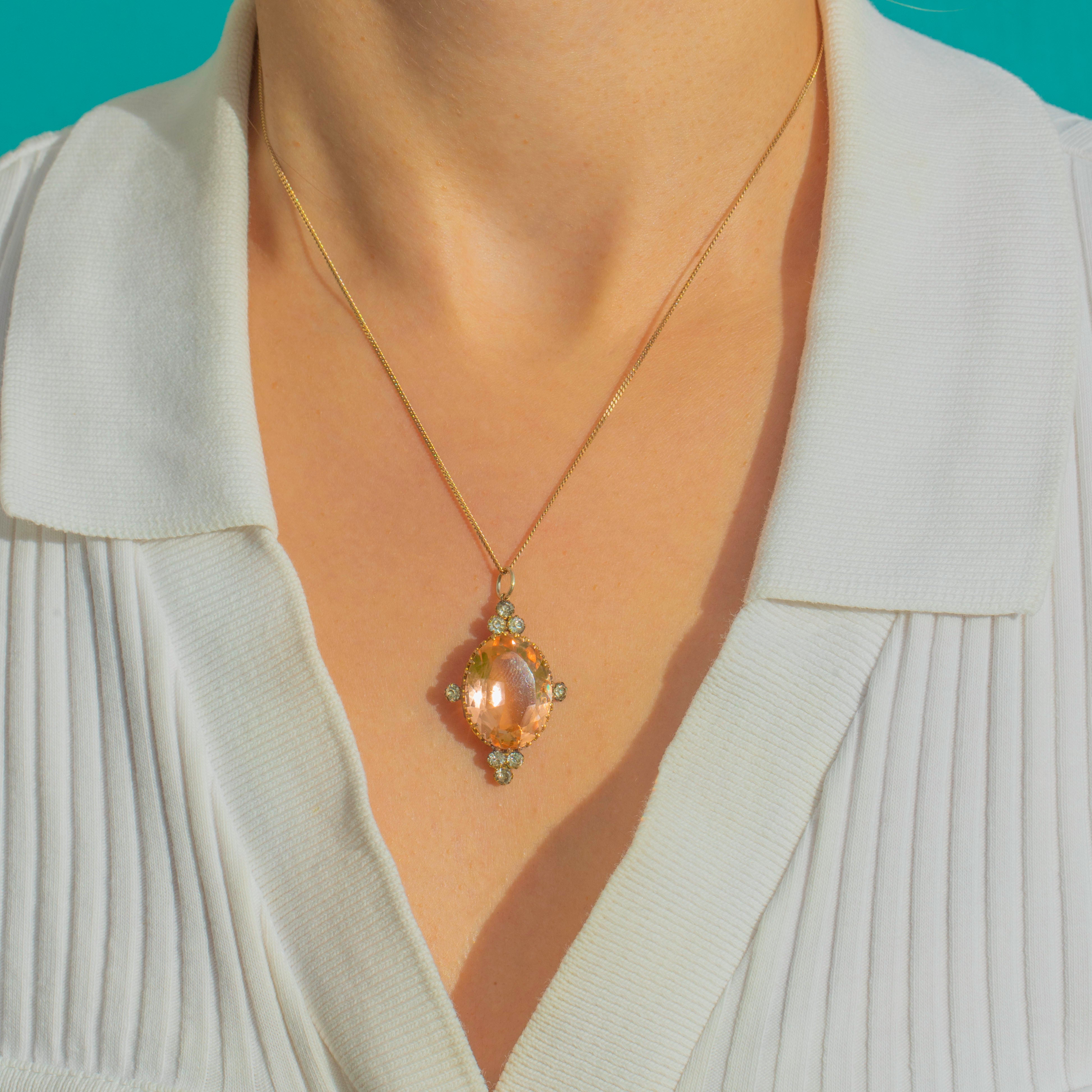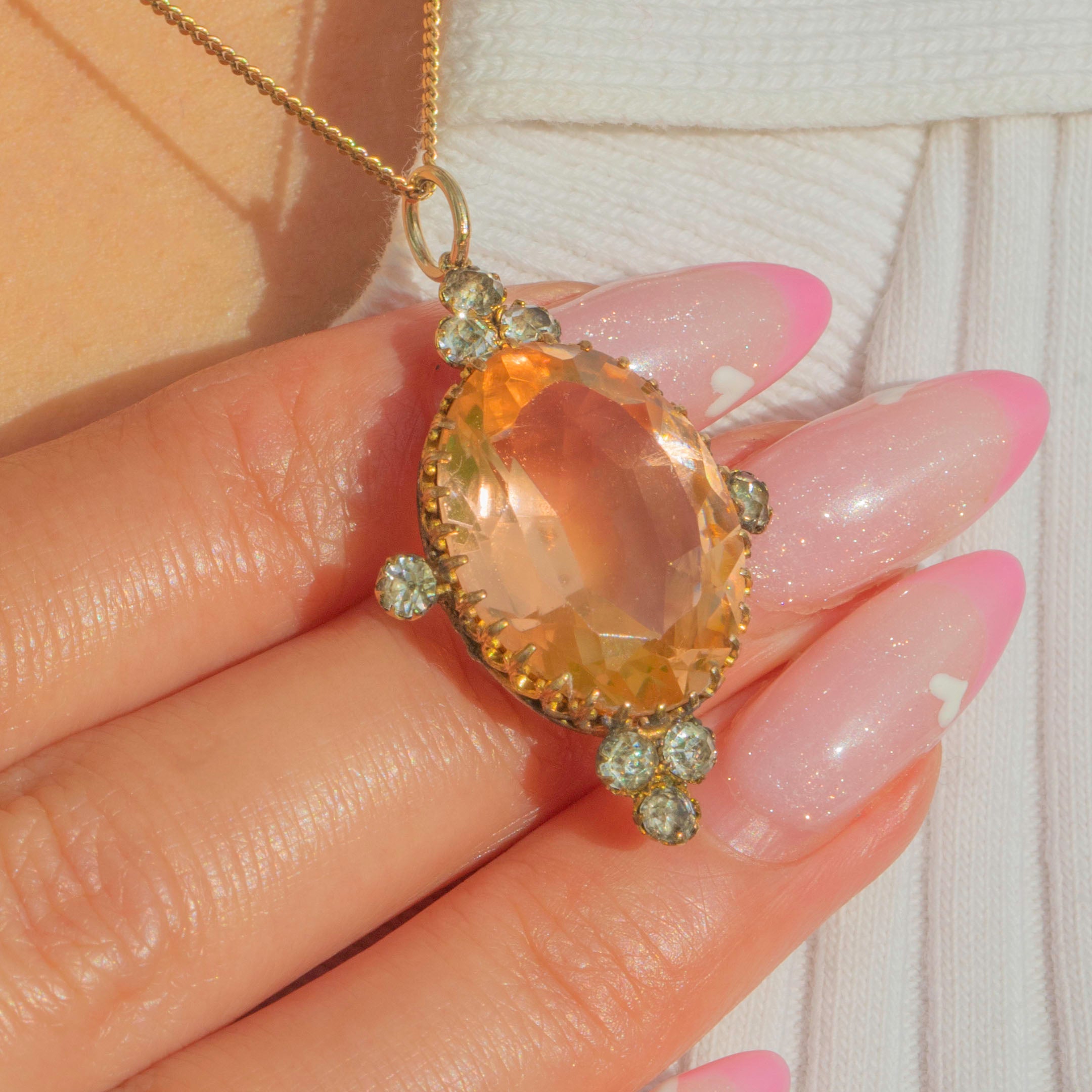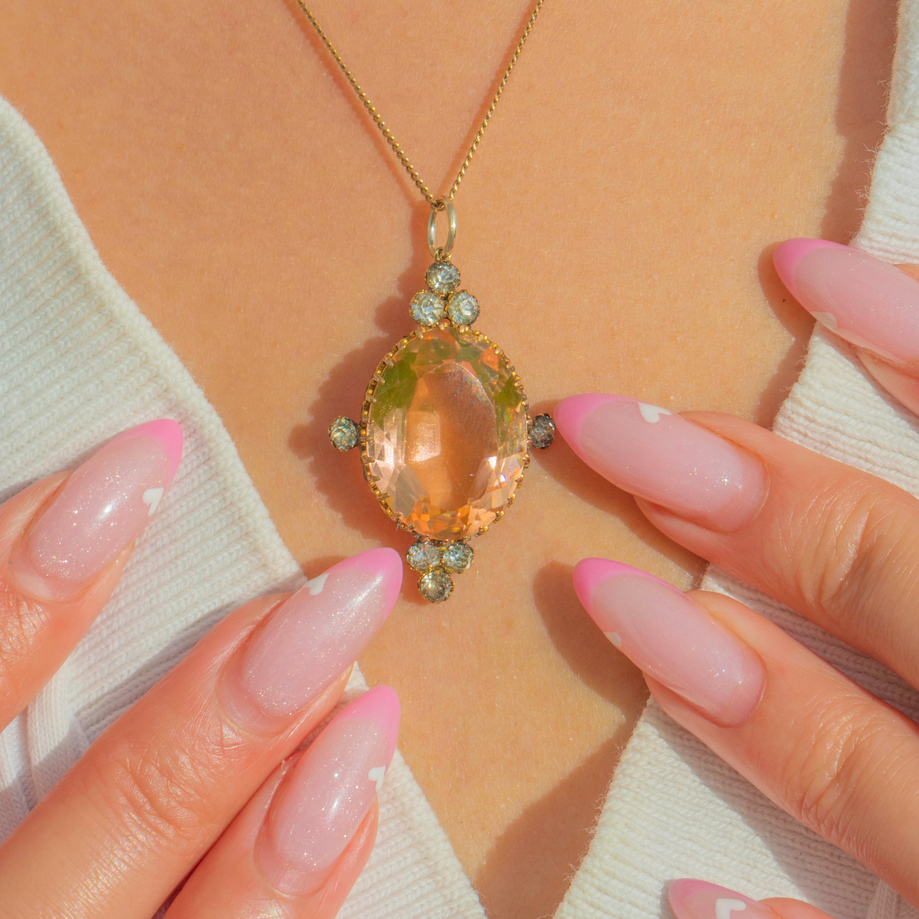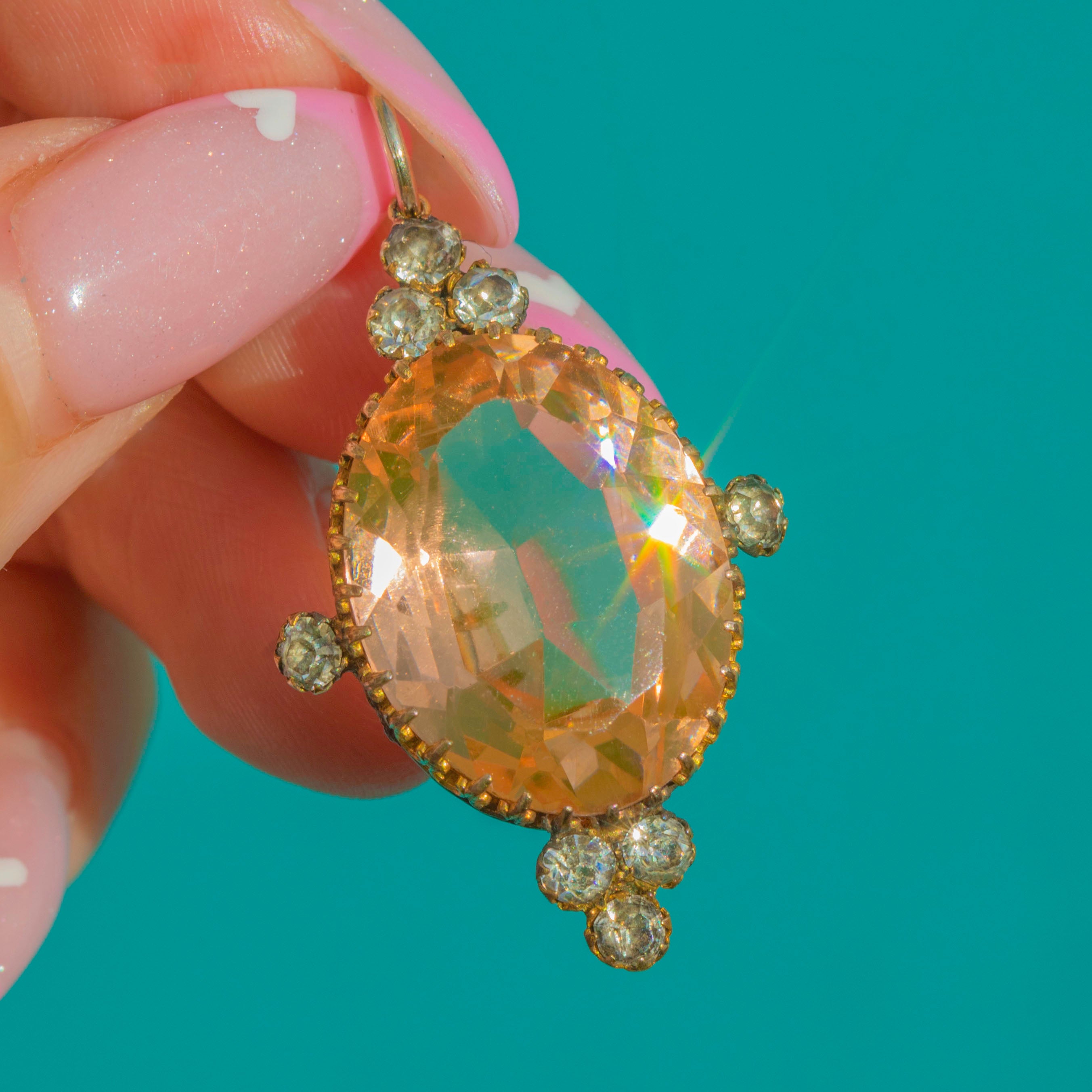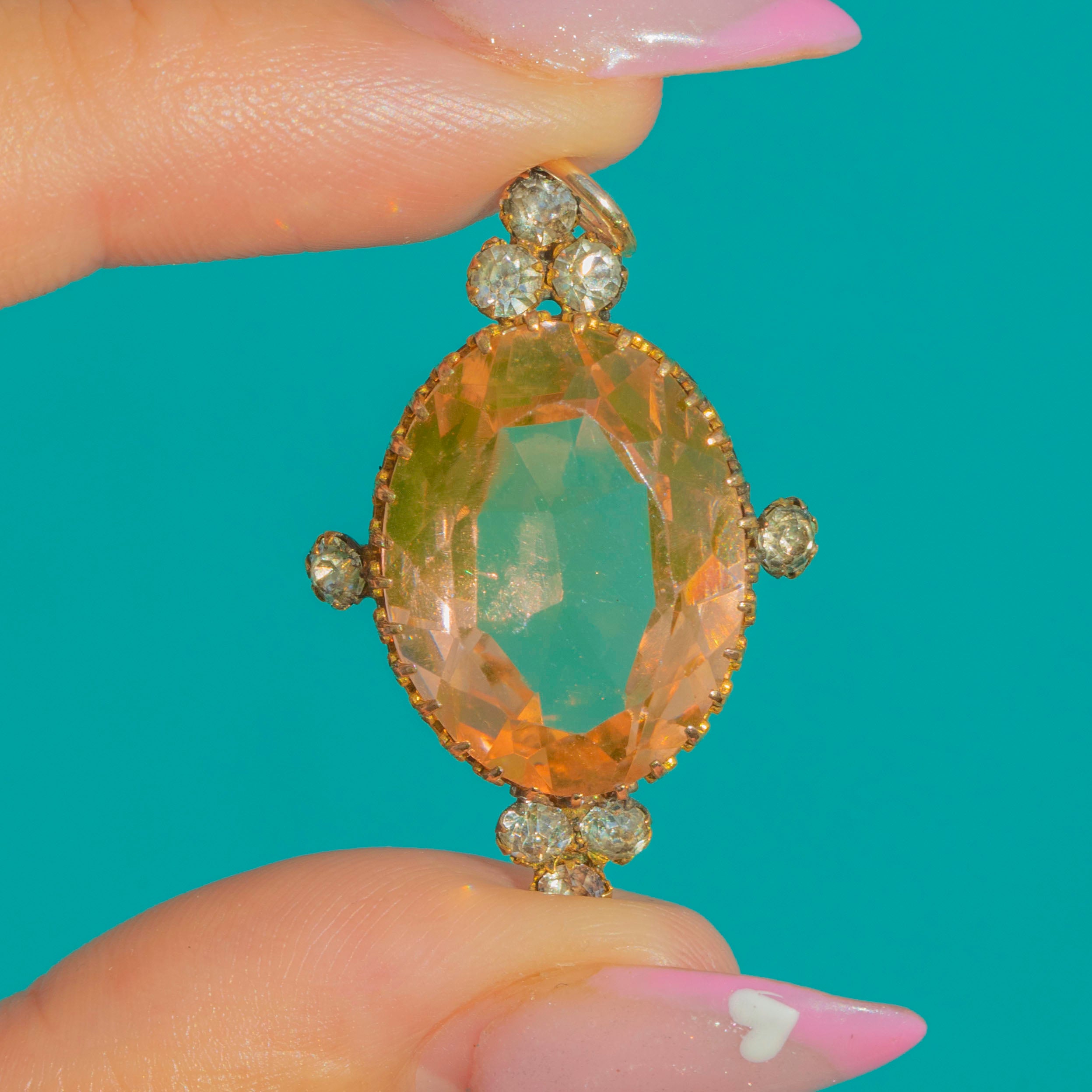 This beautiful early Victorian pendant features a glowing peach-coloured Paste stone framed by sparkling white Paste accents, all set in an ornate antique mount.