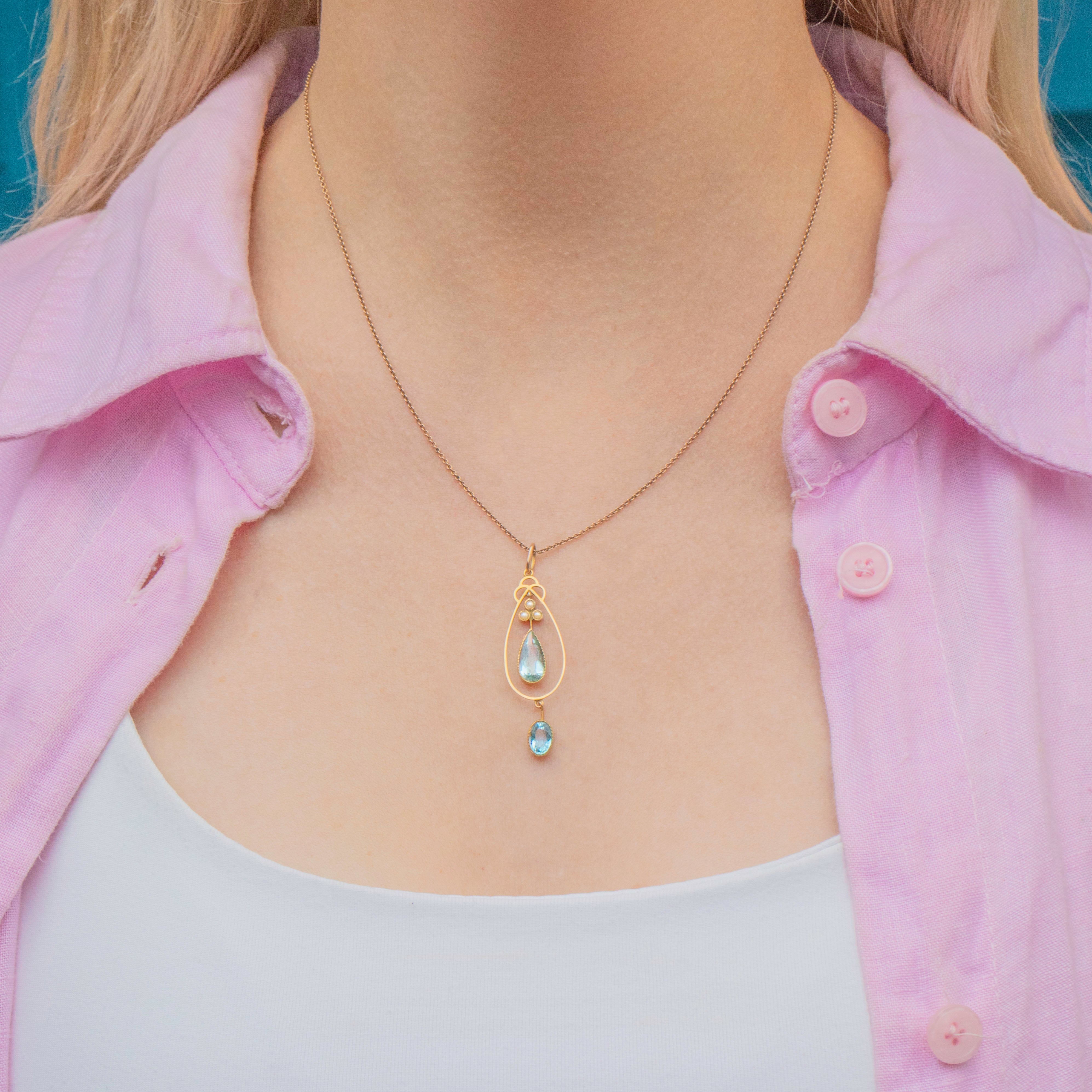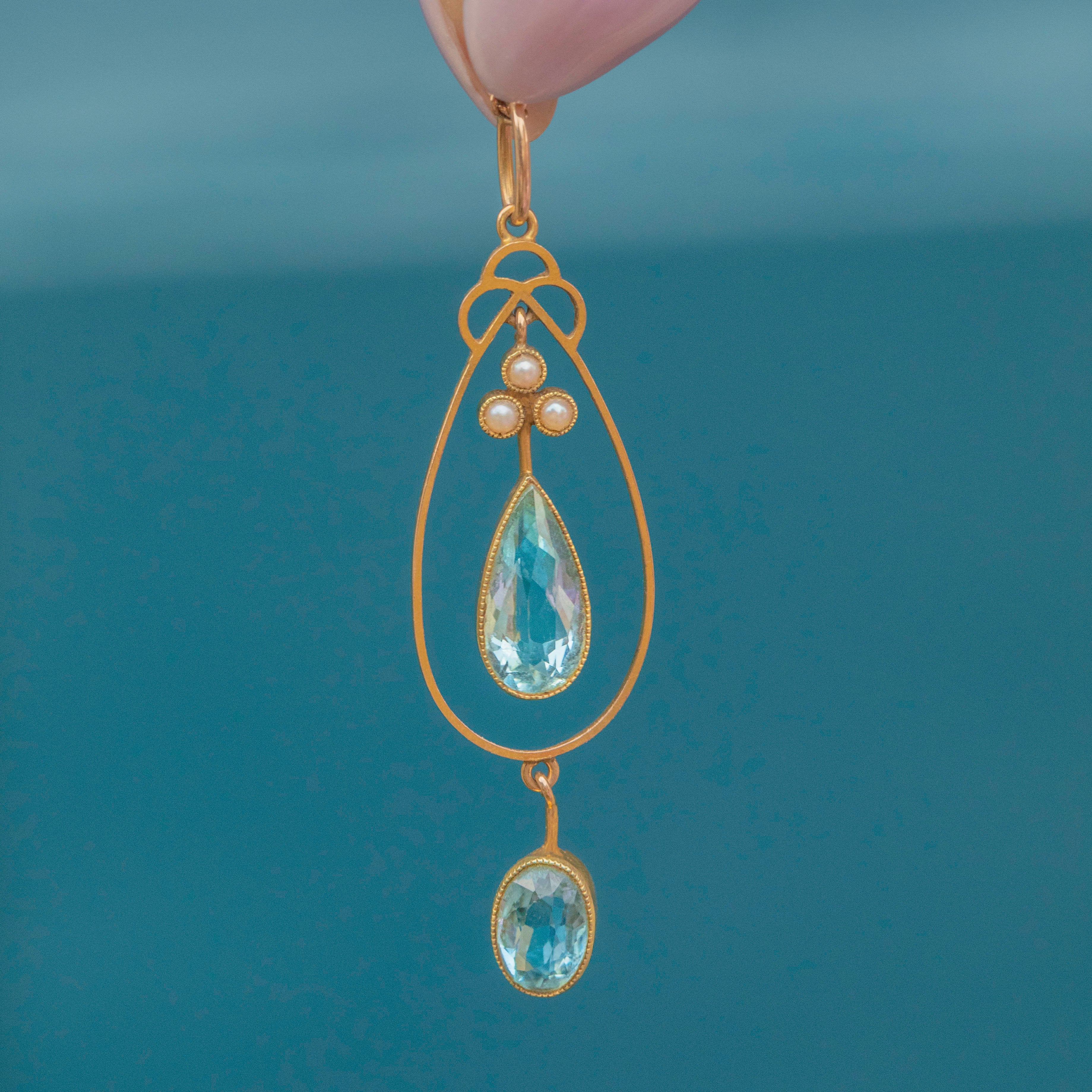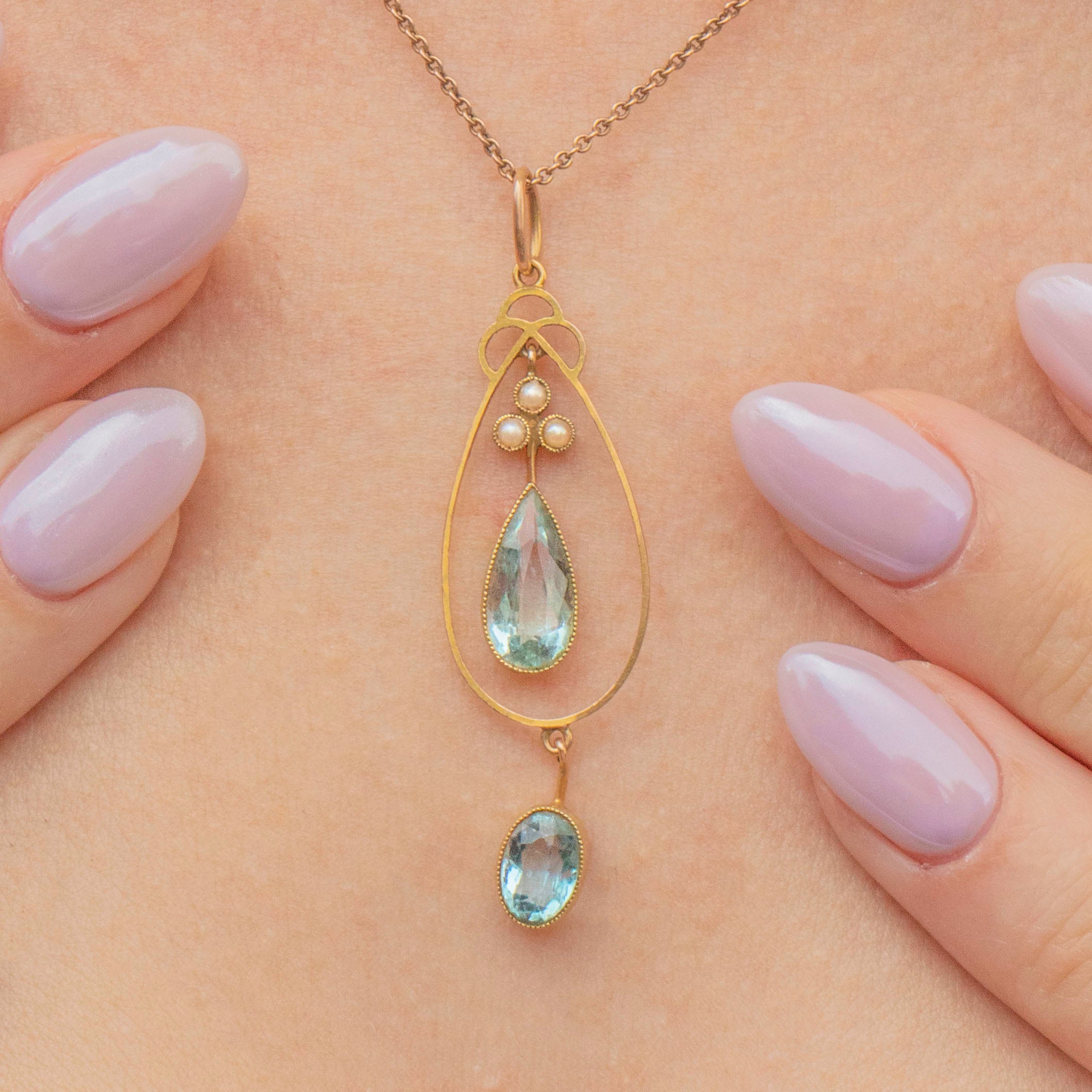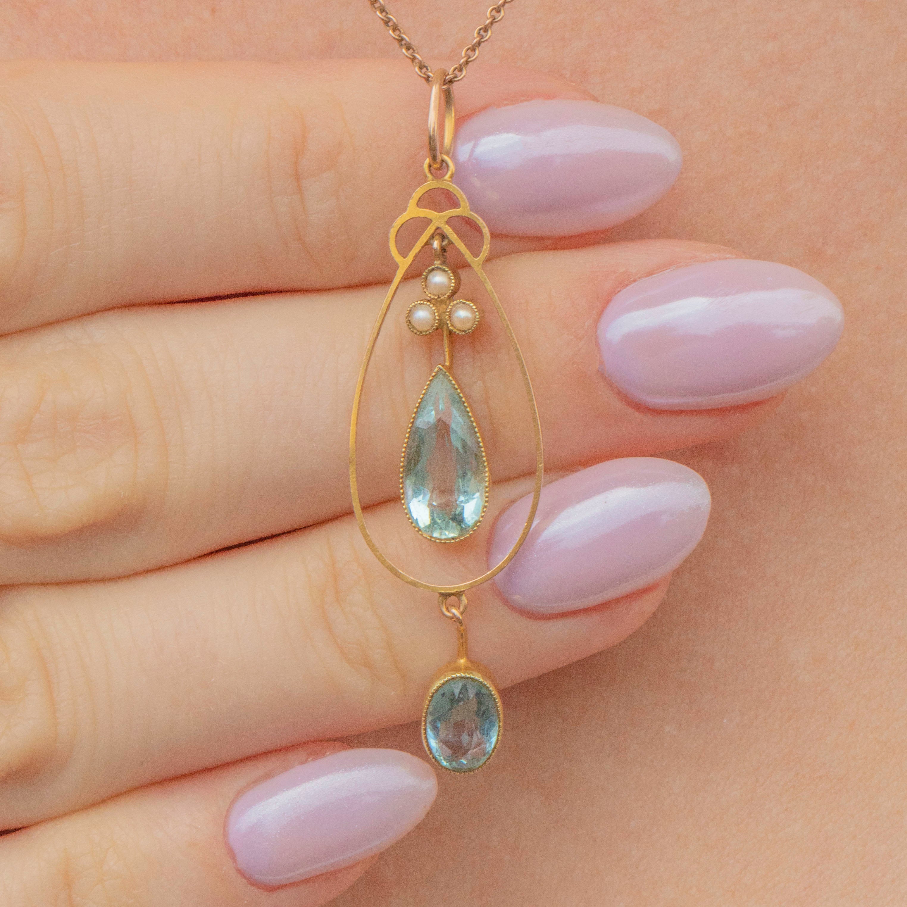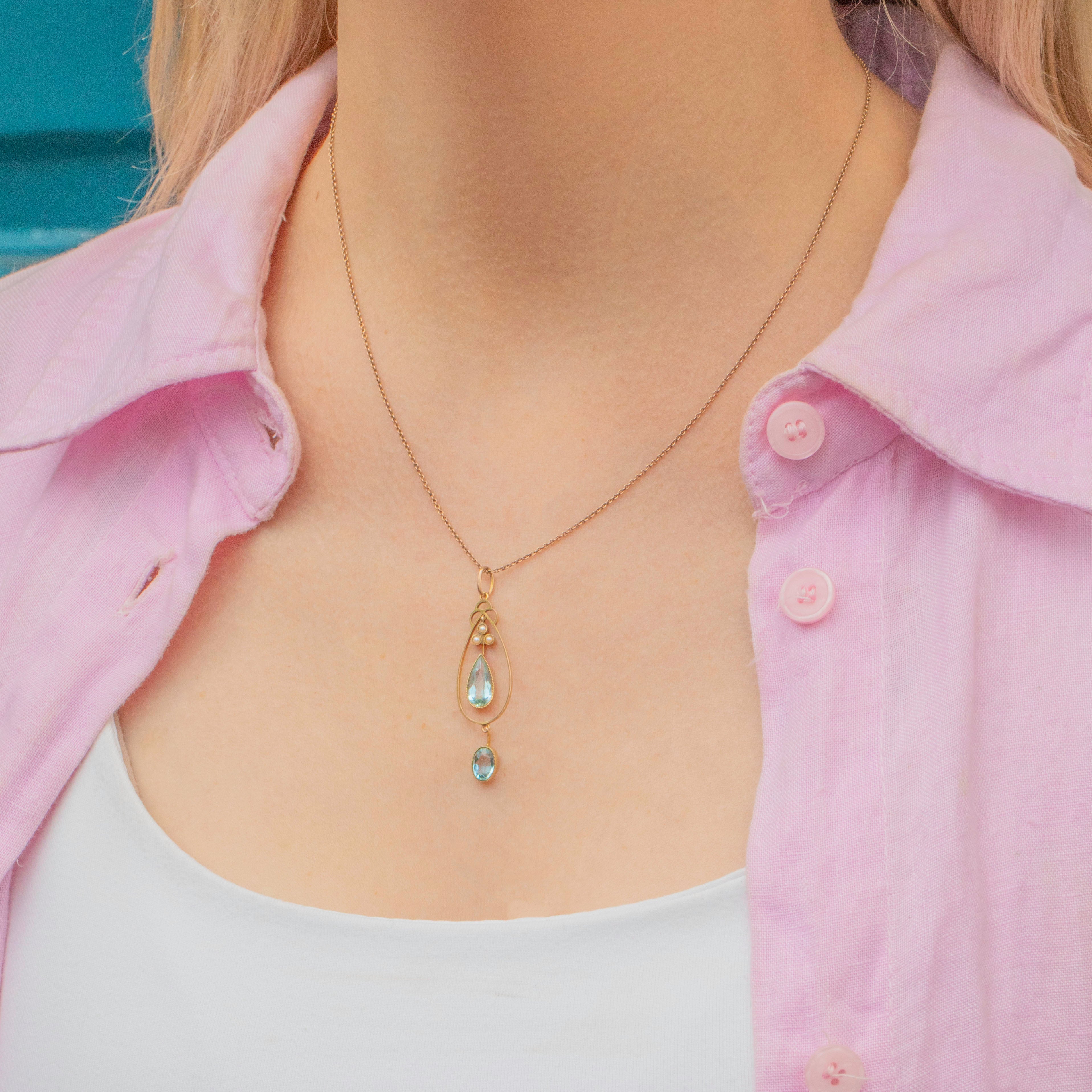 EXCELLENT. We are pleased to present this Edwardian 15ct Gold Aquamarine Pearl drop pendant is in excellnet condition. The Aquamarines and Pearls sit securely and beautifully within the pendant, free from any signs of wear. The chain has a secure set of links, with the bolt ring in perfect working order, providing comfortable and confident wear!