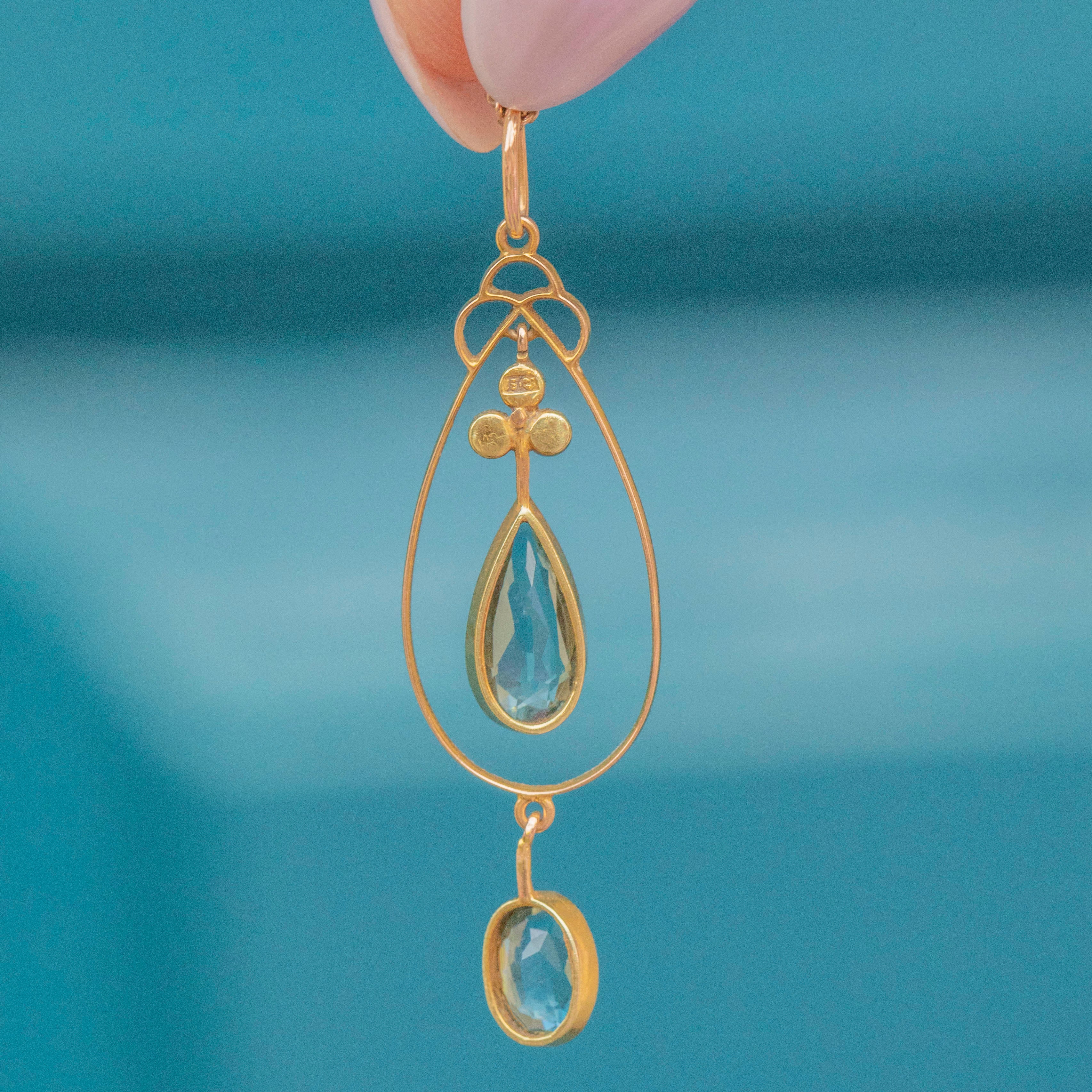 This sophisticated Edwardian 15ct Gold Aquamarine Pearl drop pendant is classy, charming and simply gorgeous! Featuring two Aquamarine drops and a triad of Pearls, she is the perfect piece to add feminine allure to your collection.