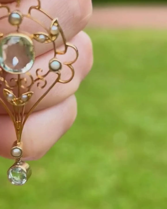 Plucked from the prettiest era, this Edwardian 15ct Gold Aquamarine & Pearl Lavalier pendant boasts delicately sweeping lines set with delectable gemstones creating a truly eye-catching piece!