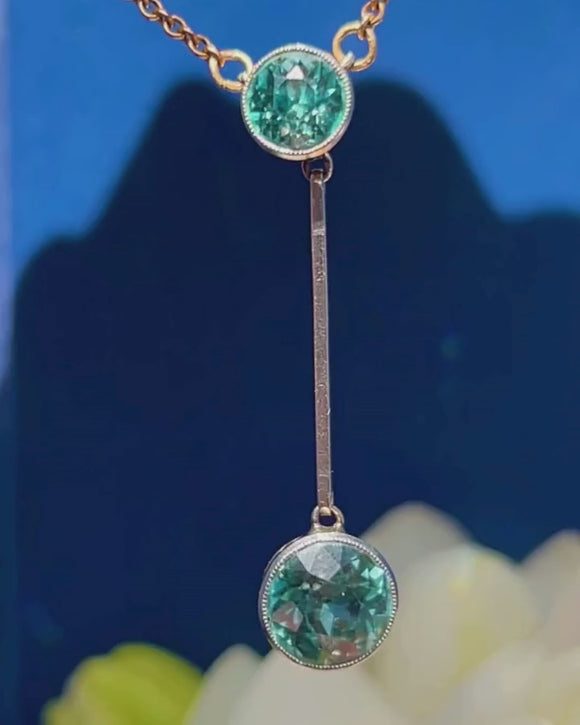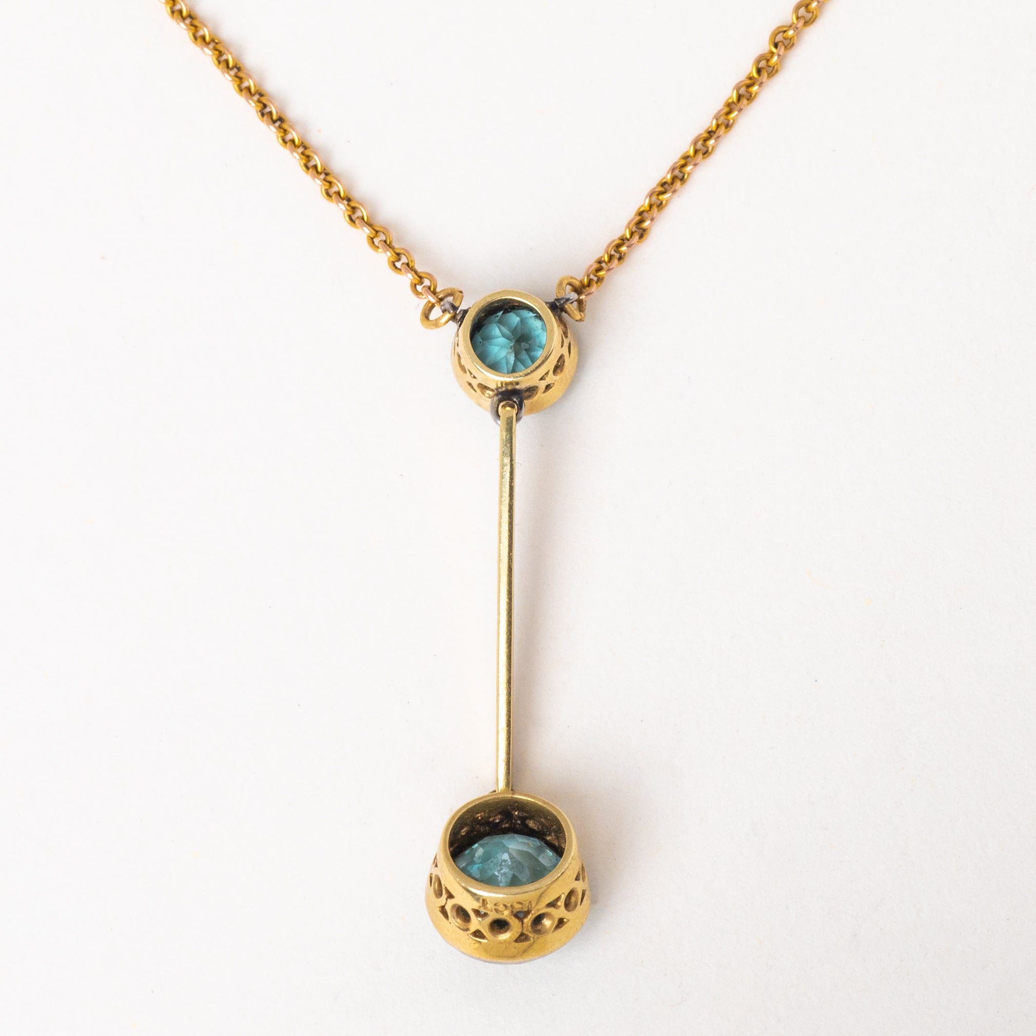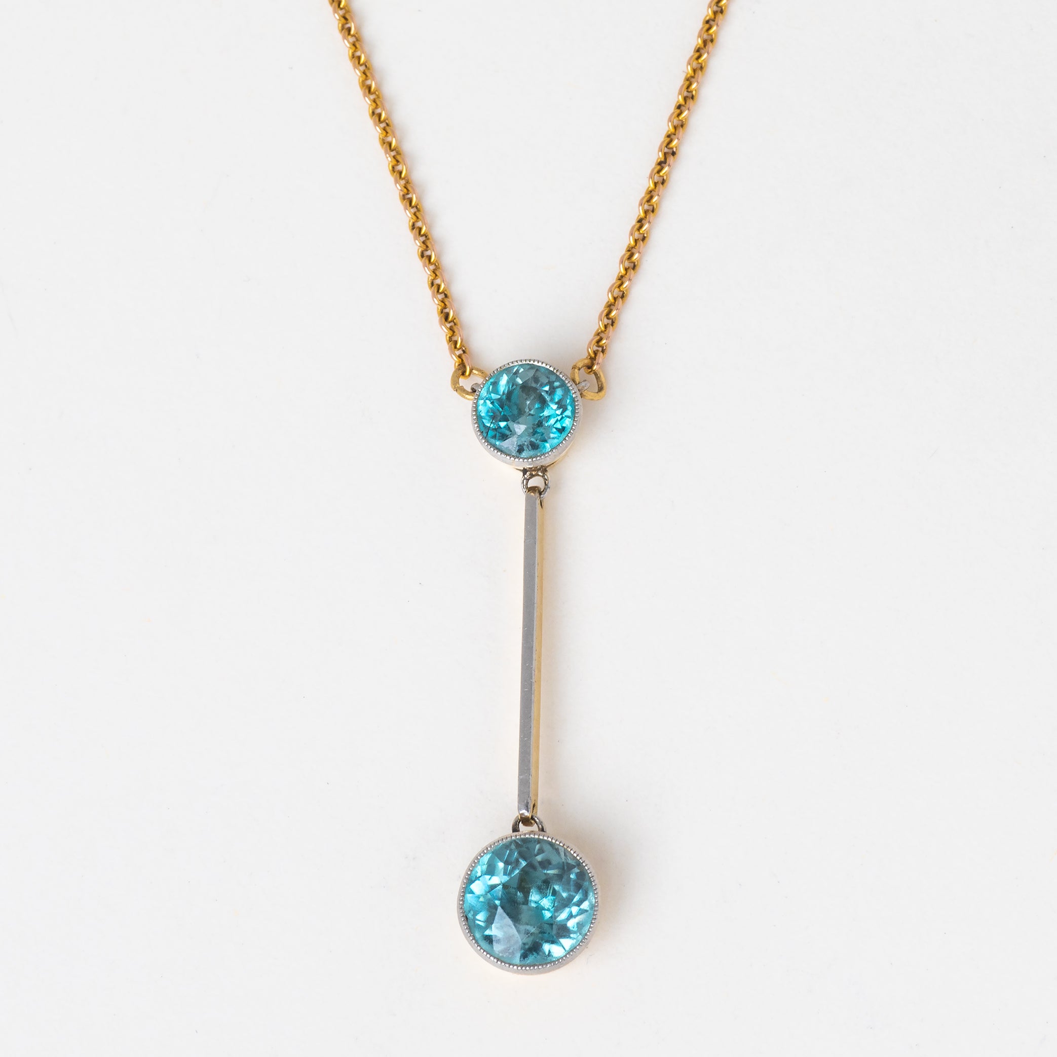 VERY GOOD. This Edwardian 15ct Gold blue Zircon drop necklace is in very good condition. Each component is securely connected with a wonderful fluidity throughout. The Blue Zircon are secure within their settings and although there is some wear to the facets, this cannot be seen through their vivacious blue sparkle. To the Gold bar along the side there is some wear, however this is only noticeable under close inspection. With a securely attached Gold chain and fully functioning bolt-ring, you can wear this Edwardian necklace confidently!
