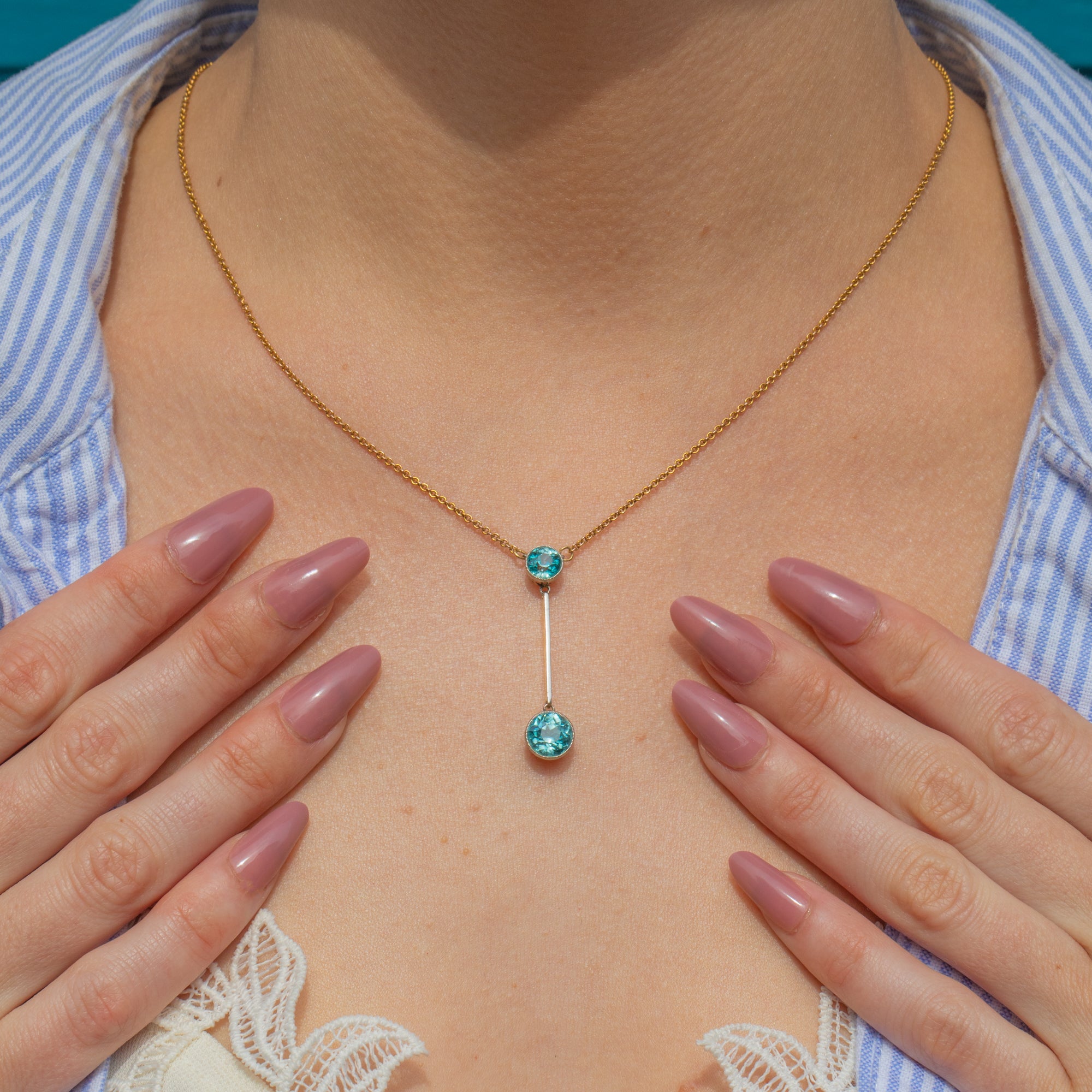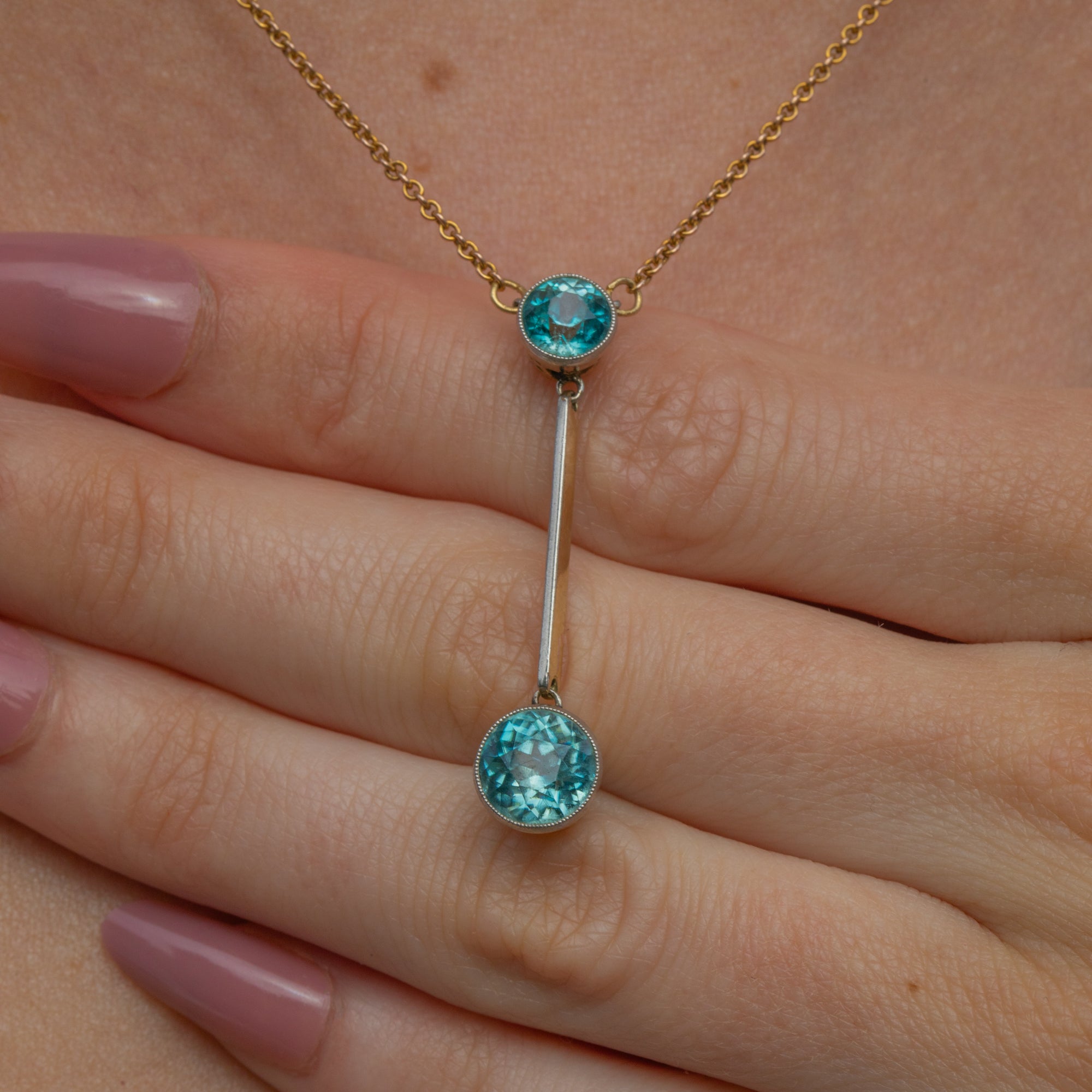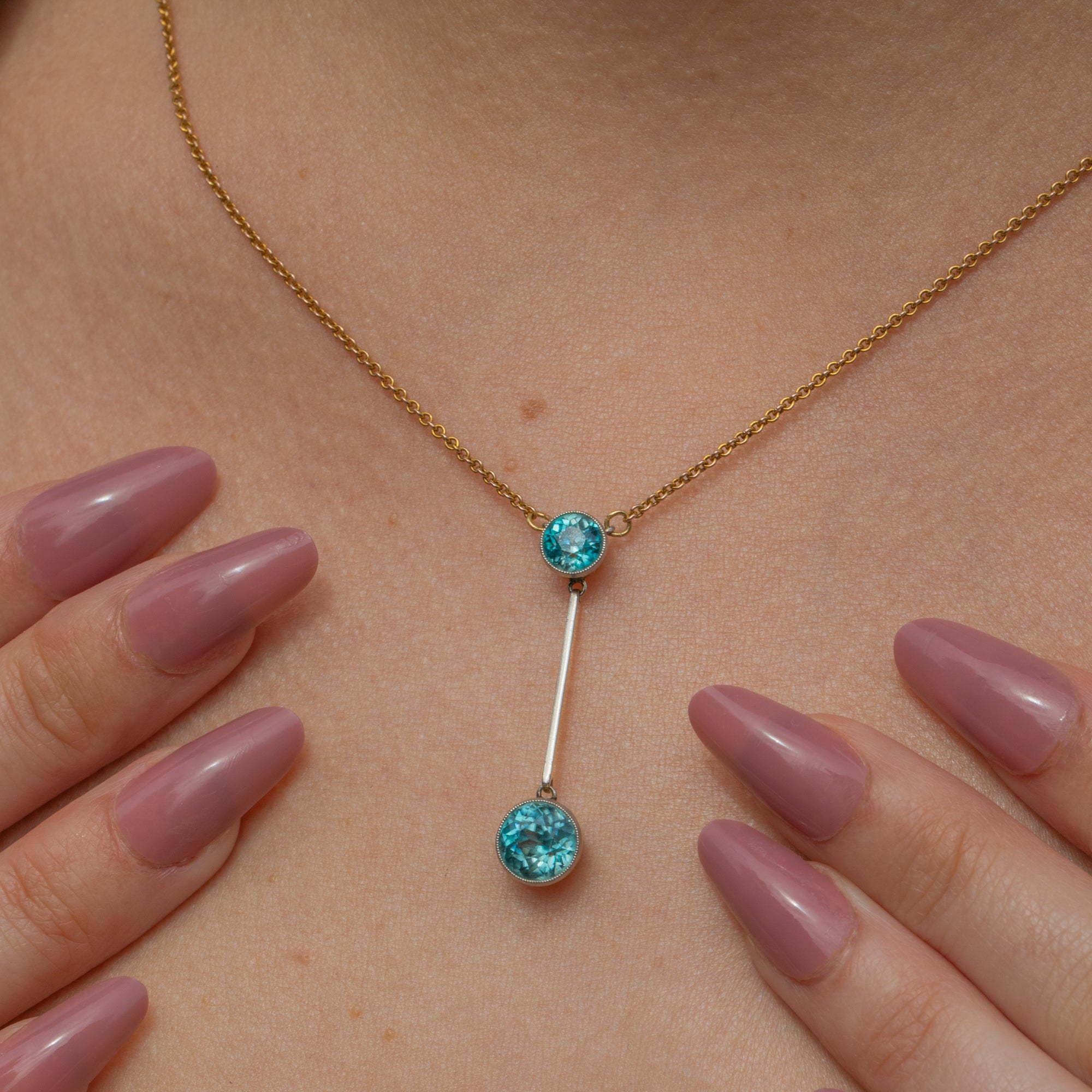 This Edwardian 15ct Gold blue Zircon drop necklace exudes opulent elegance! At 16 inches, her drop falls perfectly between your collar bones, homing two blue Zircon flaunting glacial hues that twinkle beneath the light.
