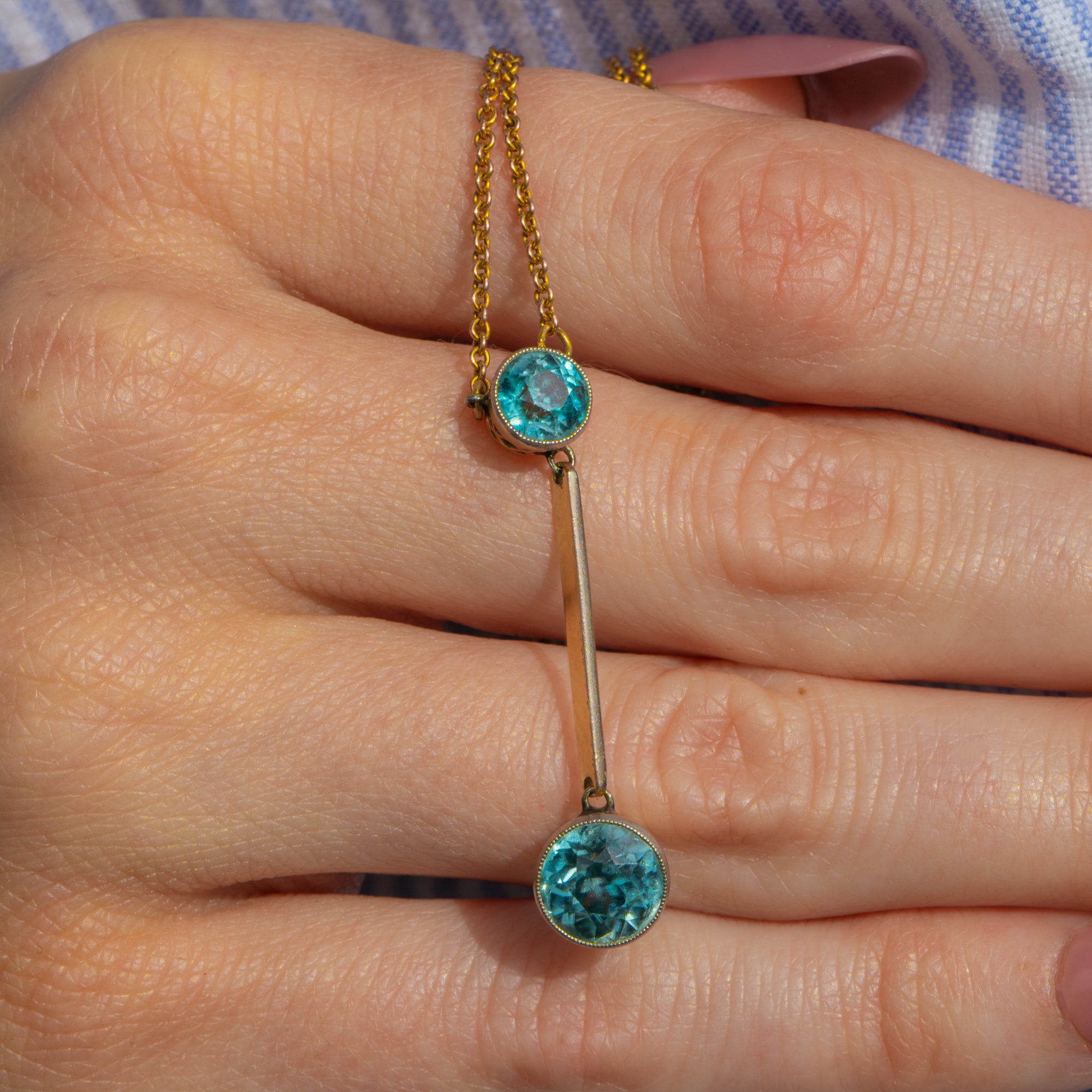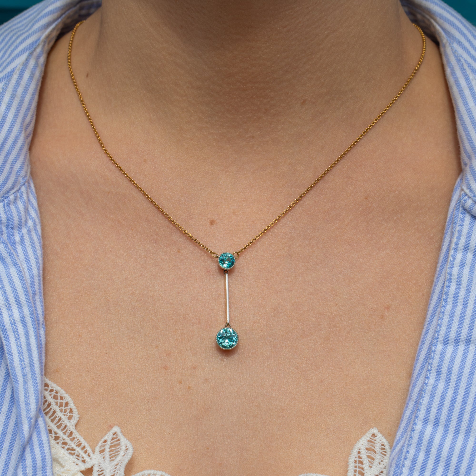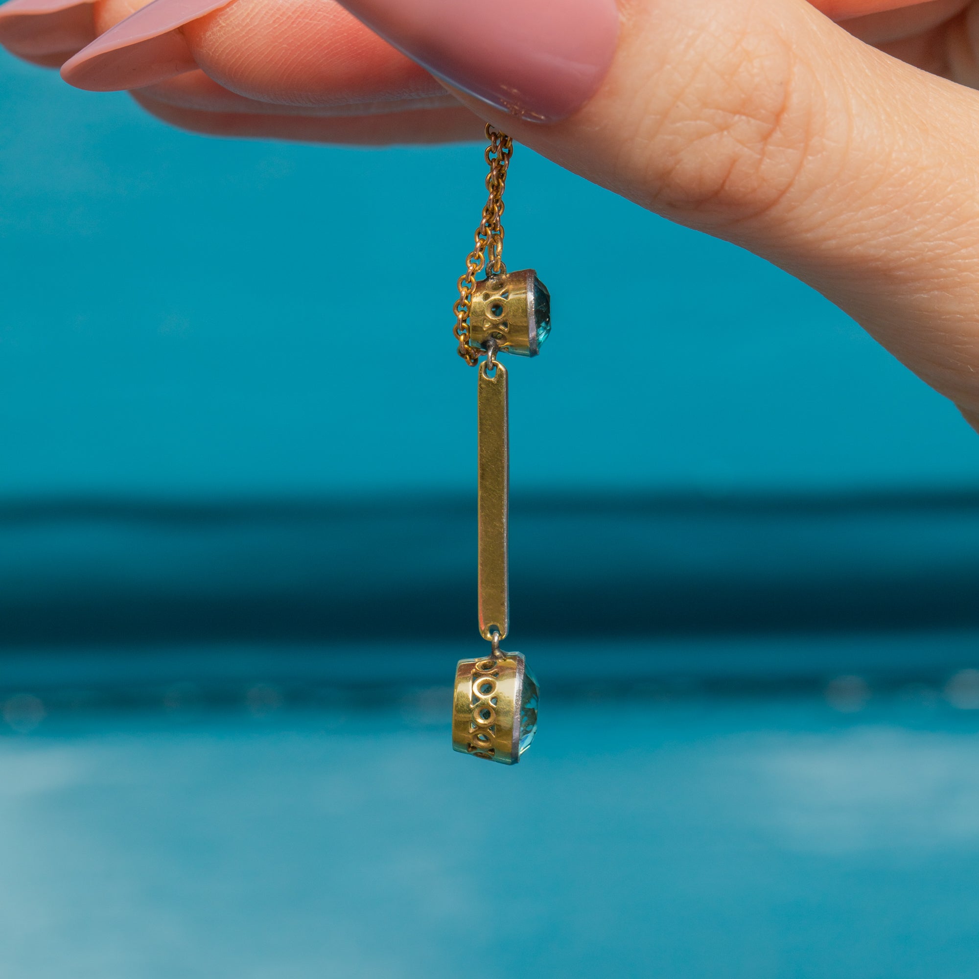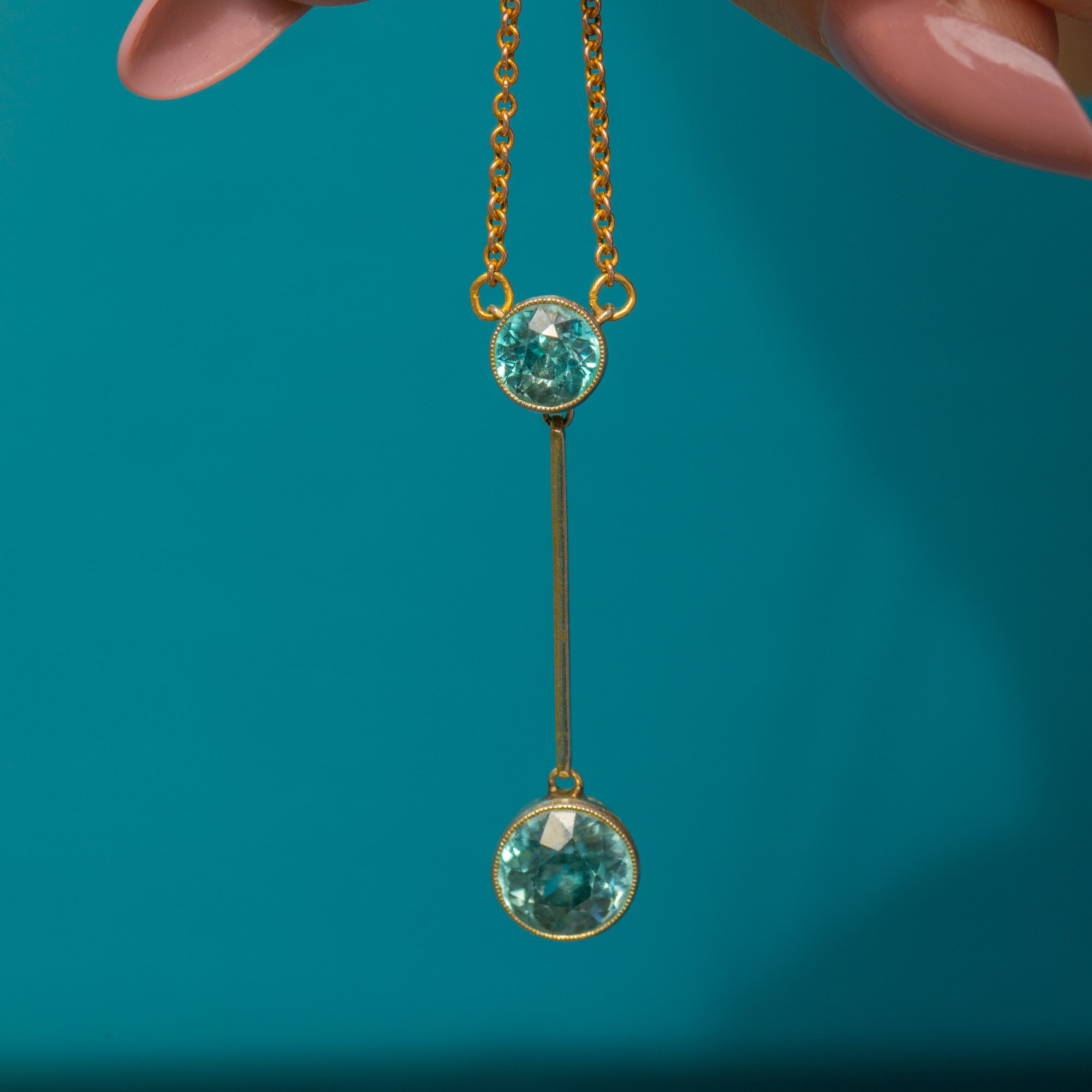 This Edwardian 15ct Gold blue Zircon drop necklace exudes opulent elegance! At 16 inches, her drop falls perfectly between your collar bones, homing two blue Zircon flaunting glacial hues that twinkle beneath the light.