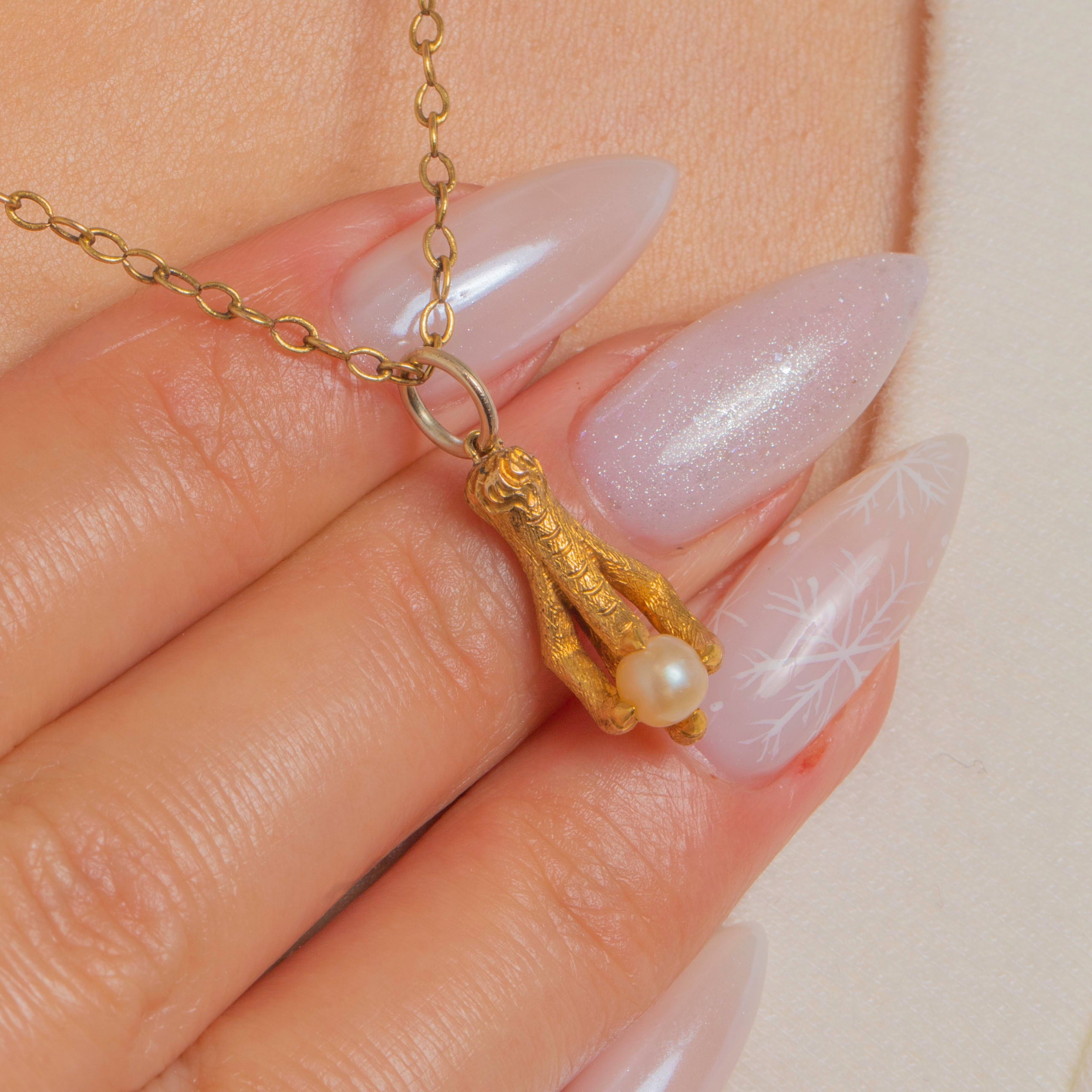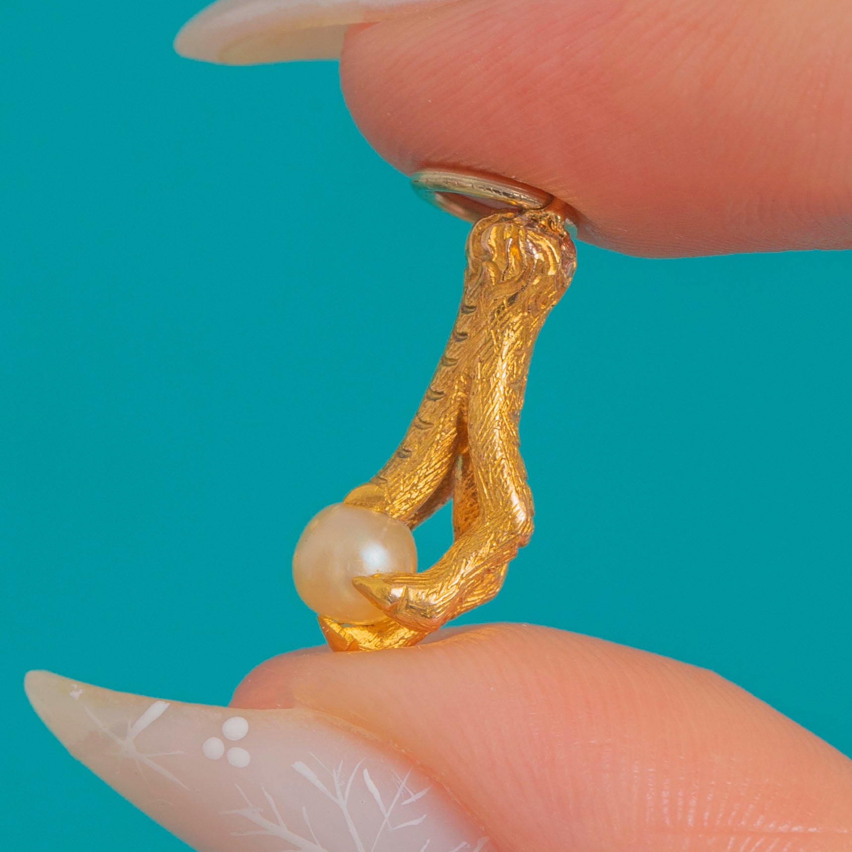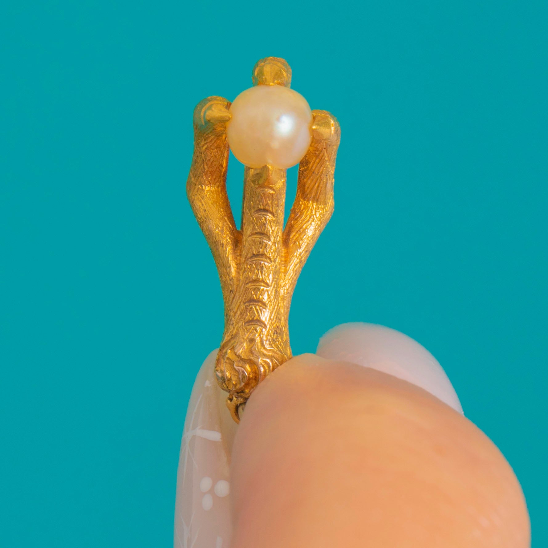 A captivating Edwardian charm, this naturalistic Eagle claw grasps a luminous Pearl “egg” with lifelike precision. The sculpted talons and chased texture create a wonderfully tactile, slightly gothic silhouette that feels both talismanic and elegant.