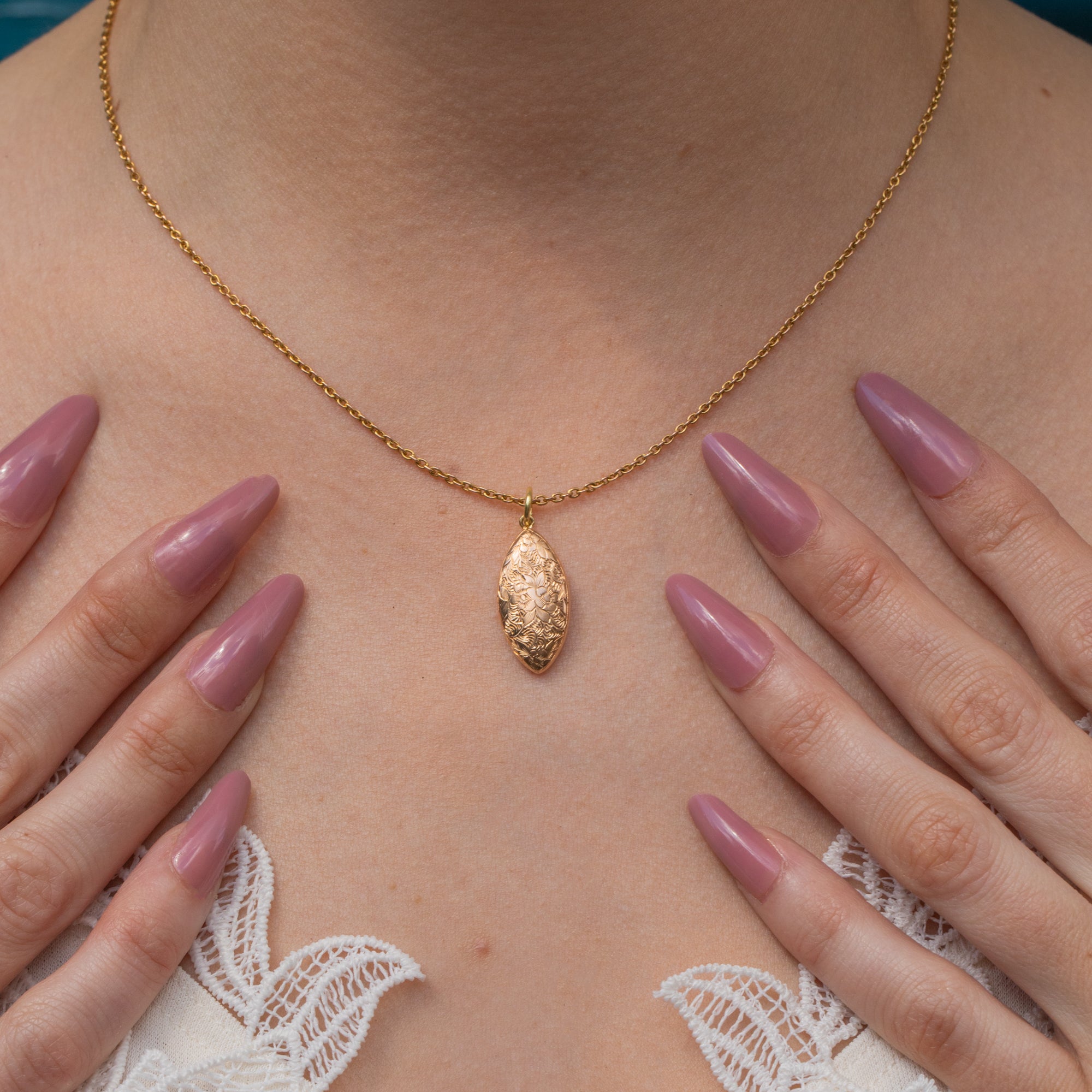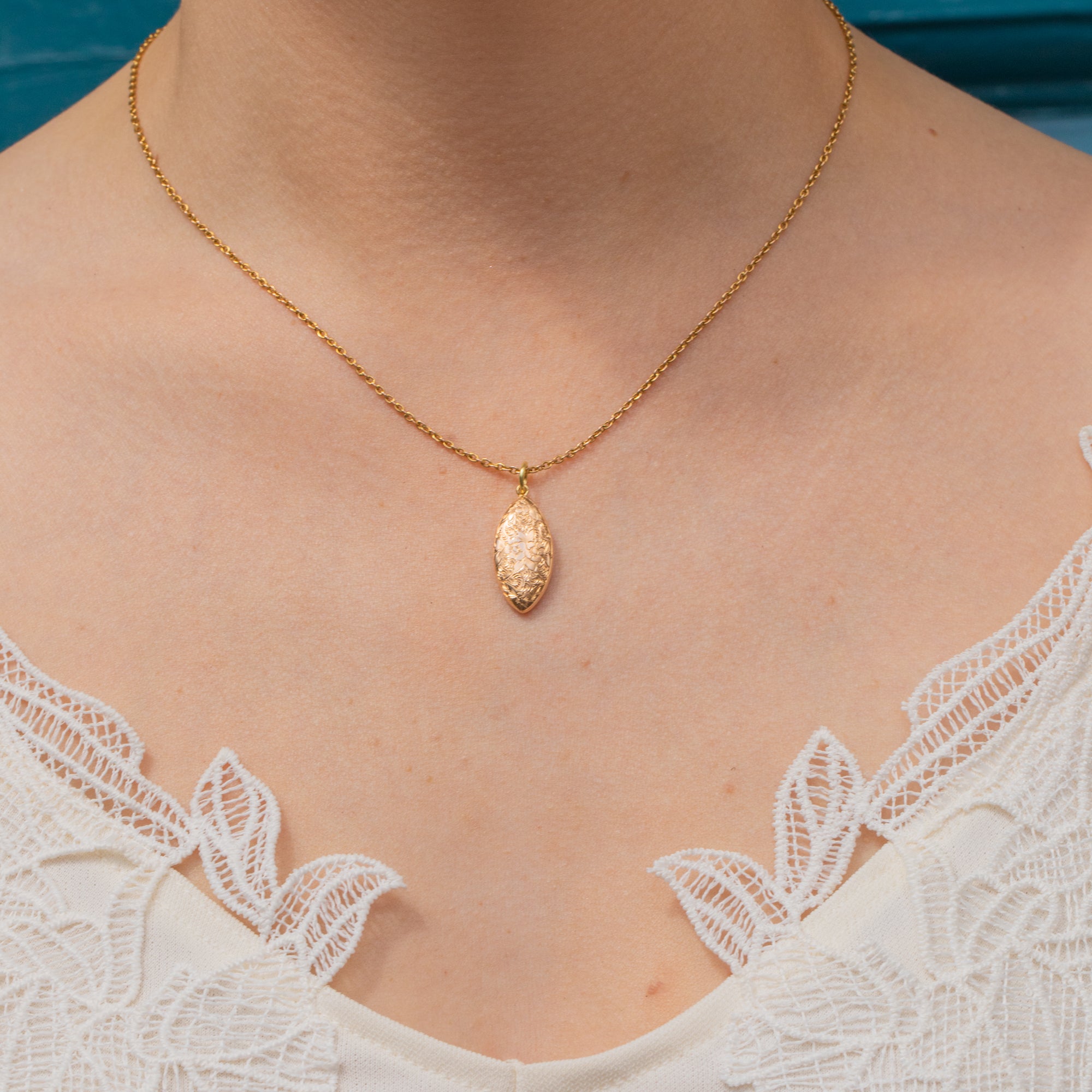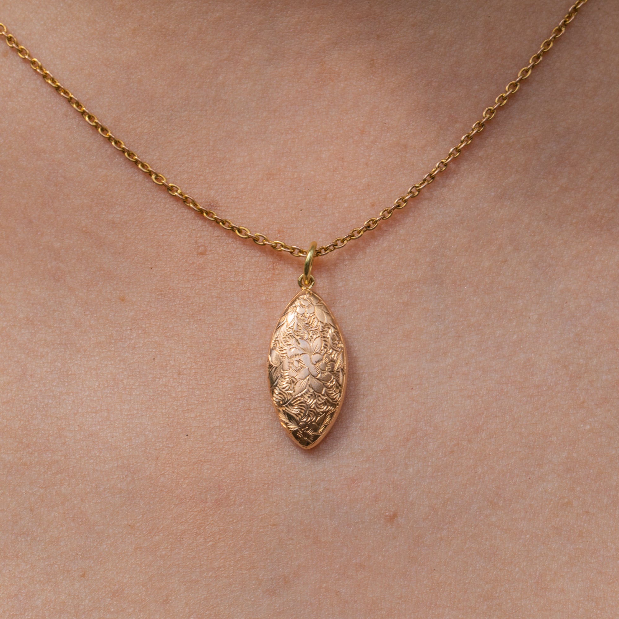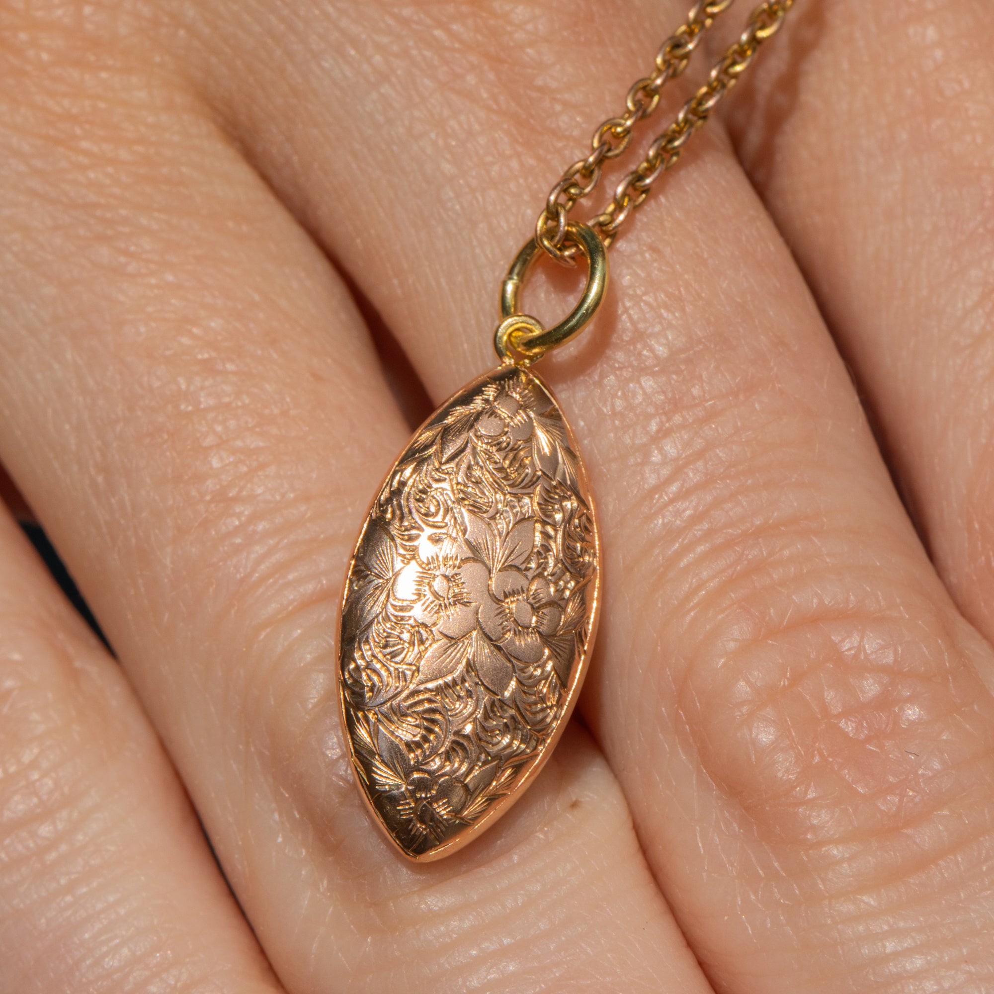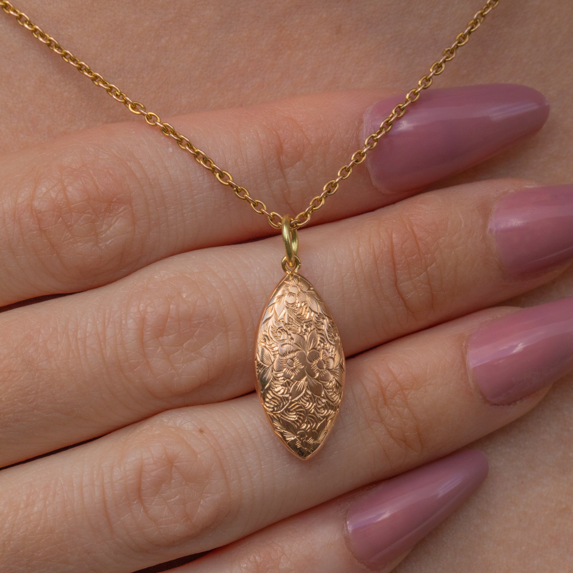 Plucked from the prettiest era, this Edwardian 15ct Gold floral engraved pendant is bursting with beauty. Her sleek lozenge form is inlaid with whimsical forget-me-not engravings, a motif that carries strong romantic sentiment within antique jewellery.