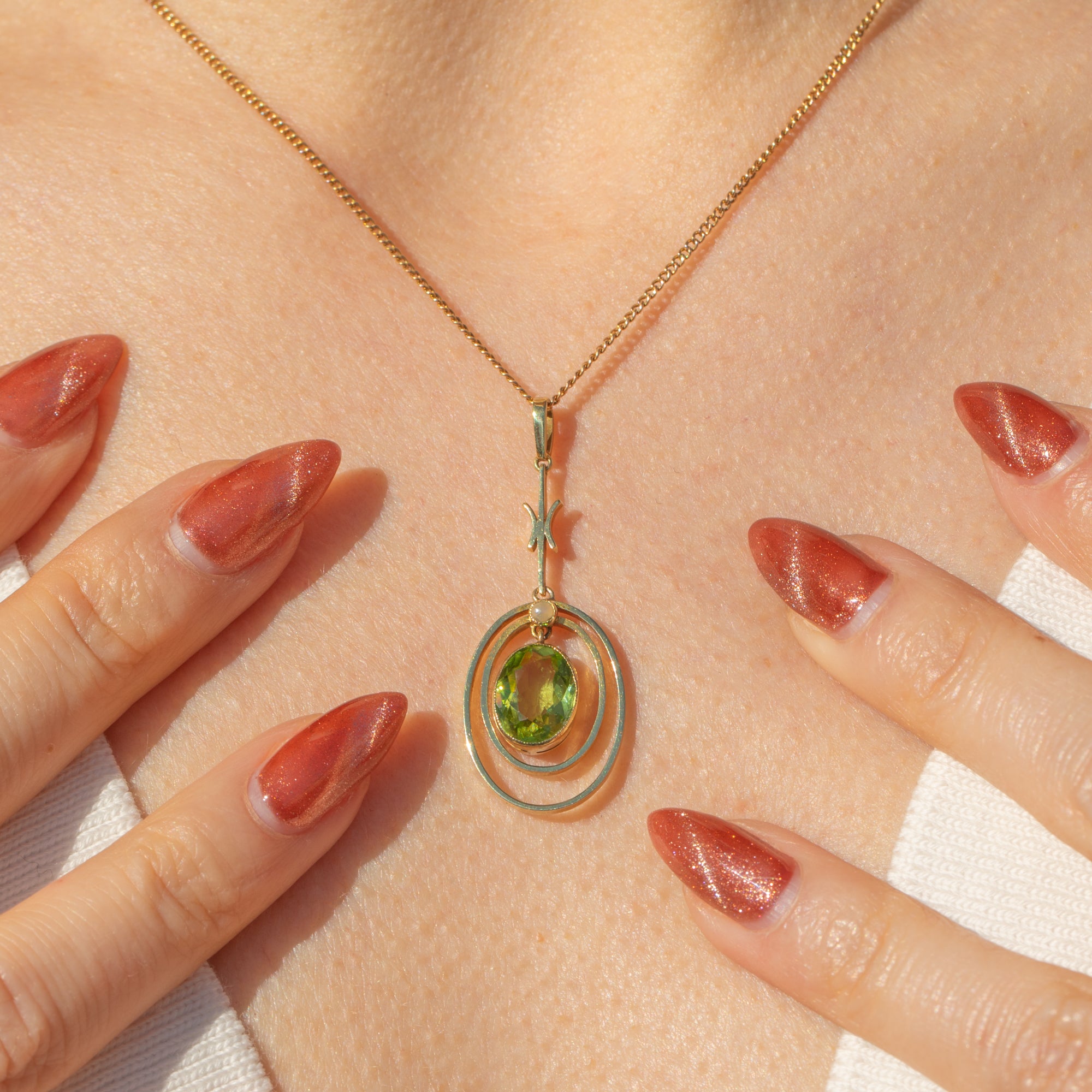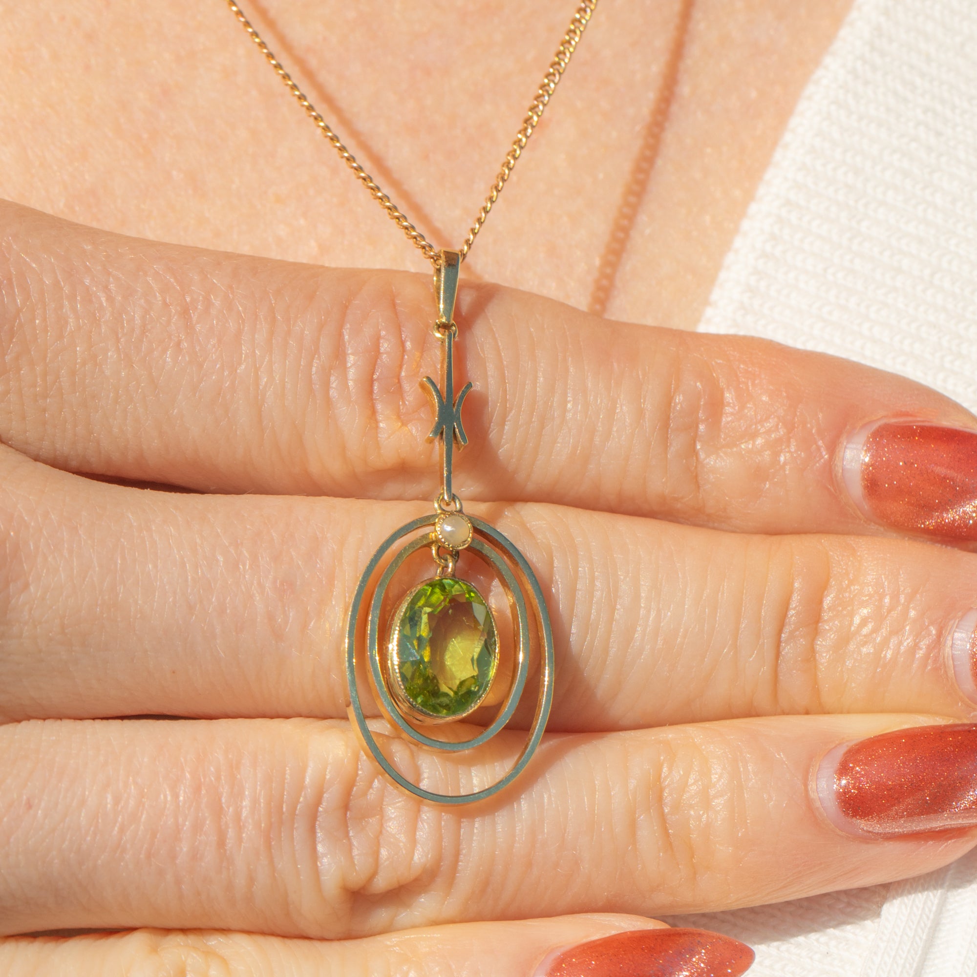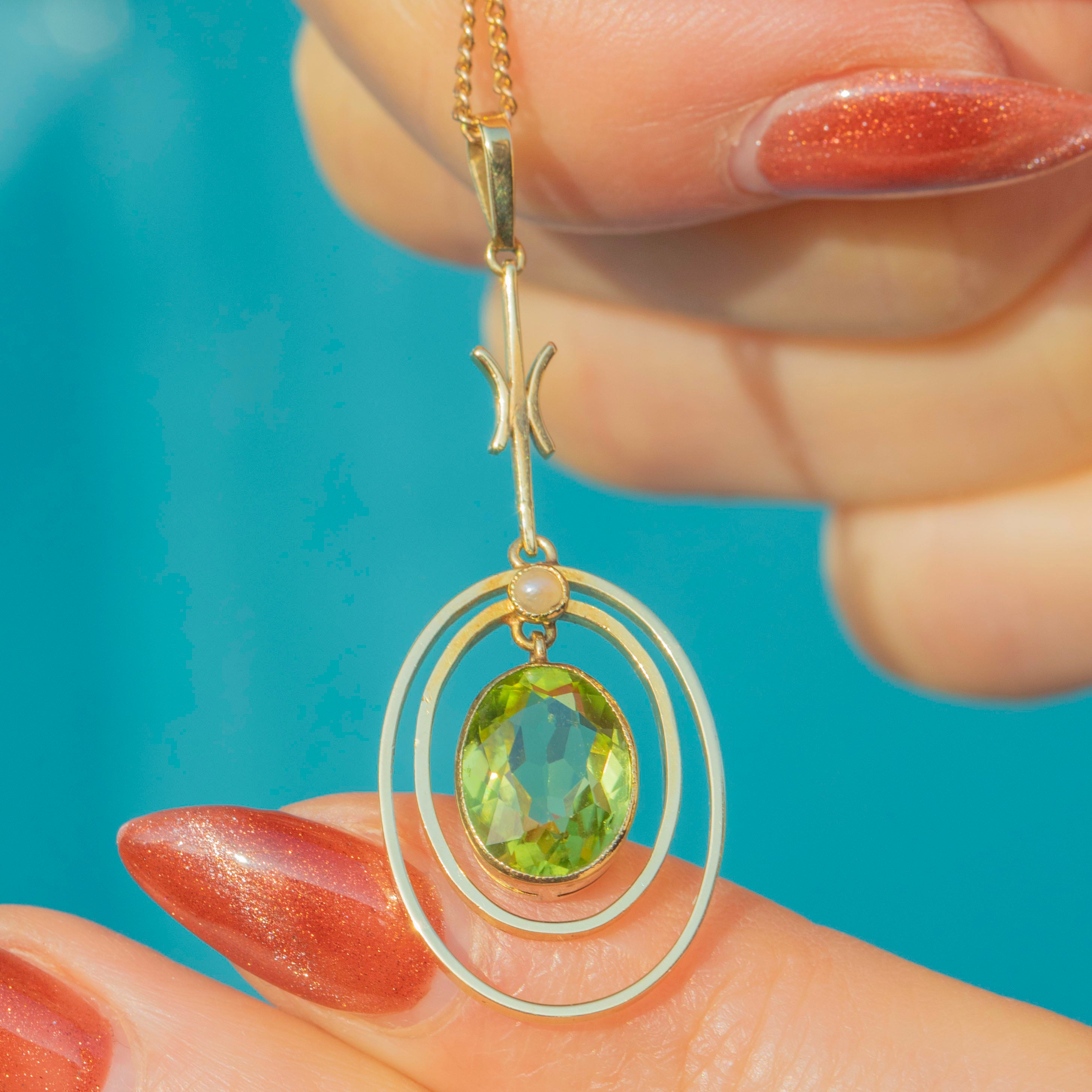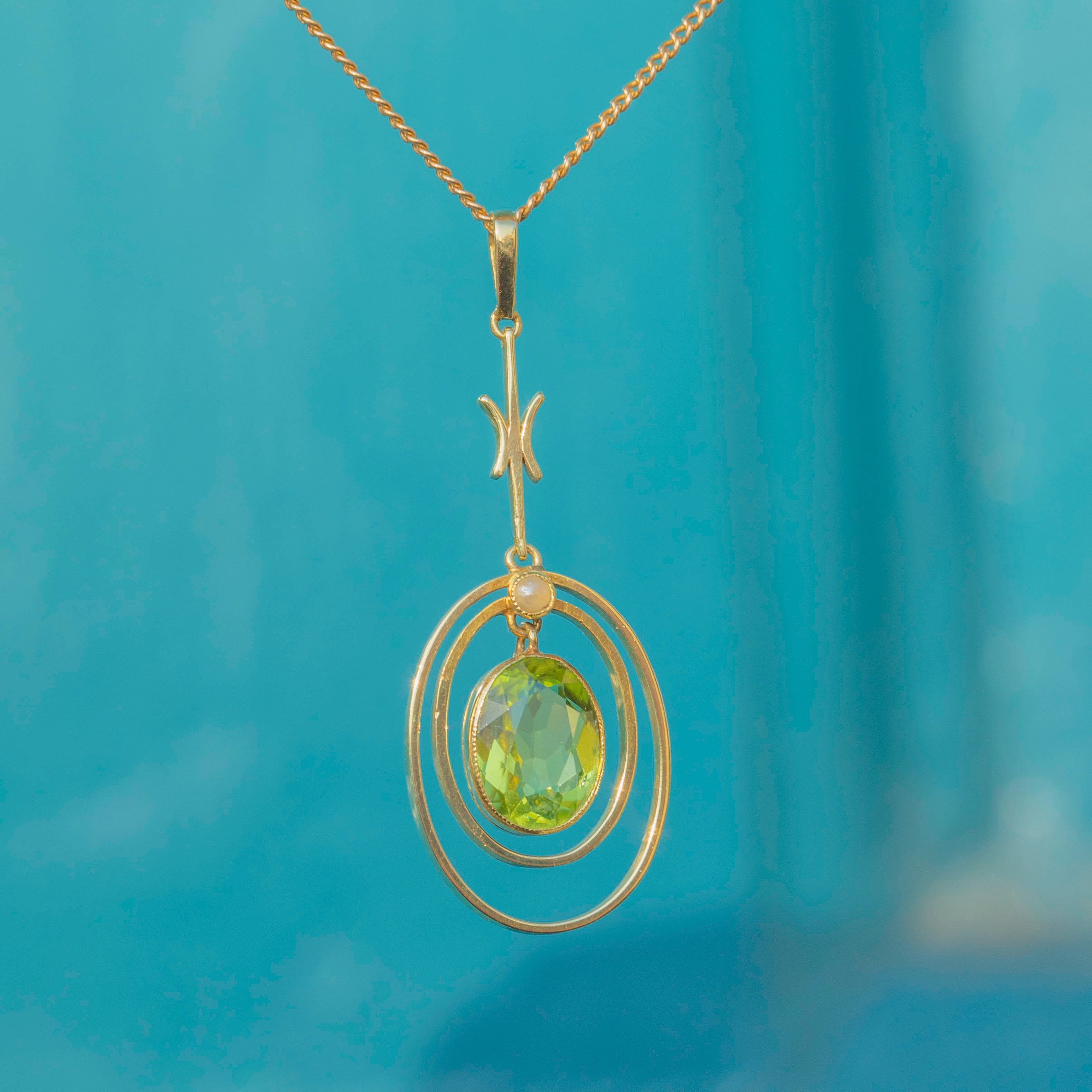 The pendant is crafted from buttery 15ct Yellow Gold, with an eye-catching lime green 1.70ct Peridot. She is encircled by lustrous Gold rings and a petite iridescent Pearl above, giving this Edwardian pendant a refined glamour and elegance.