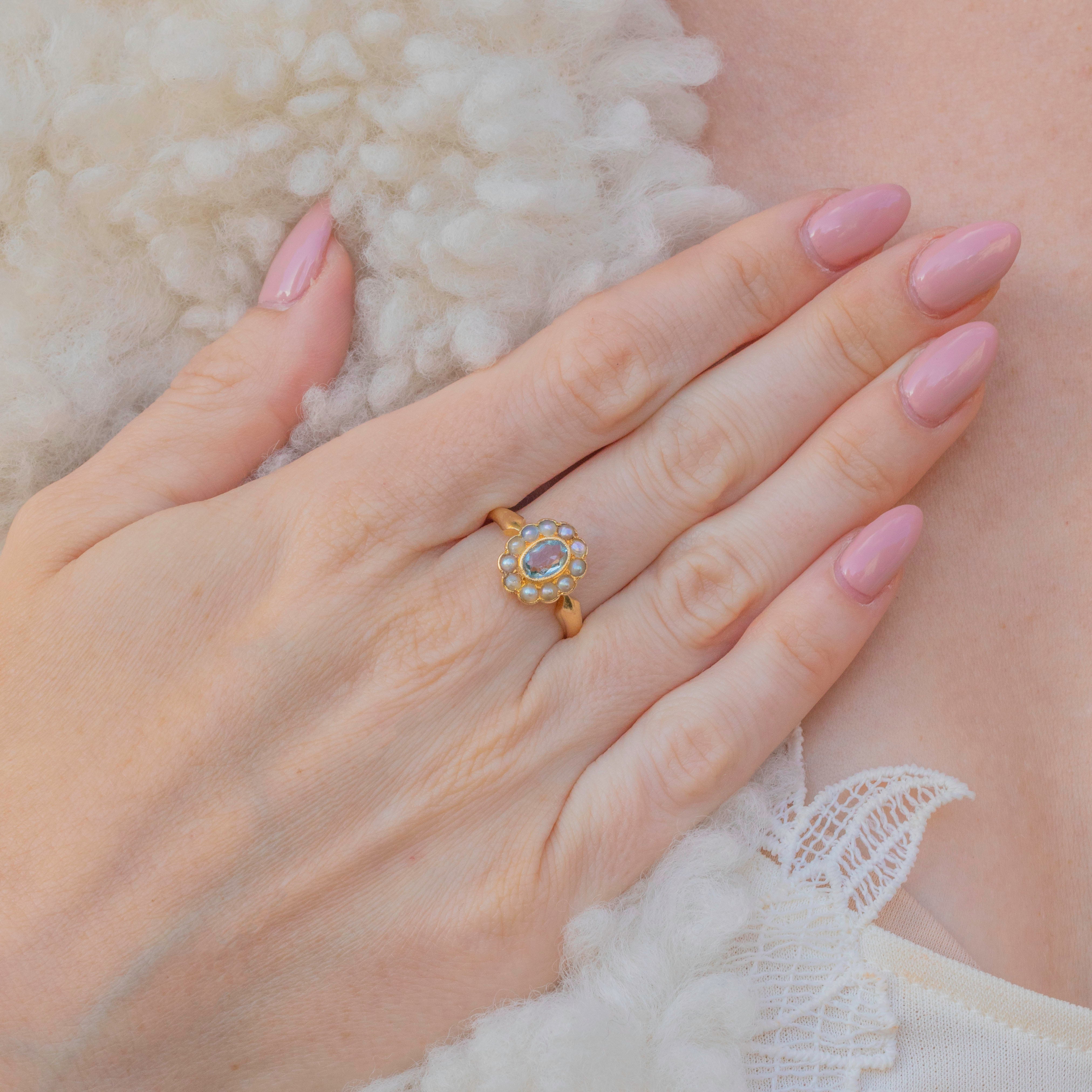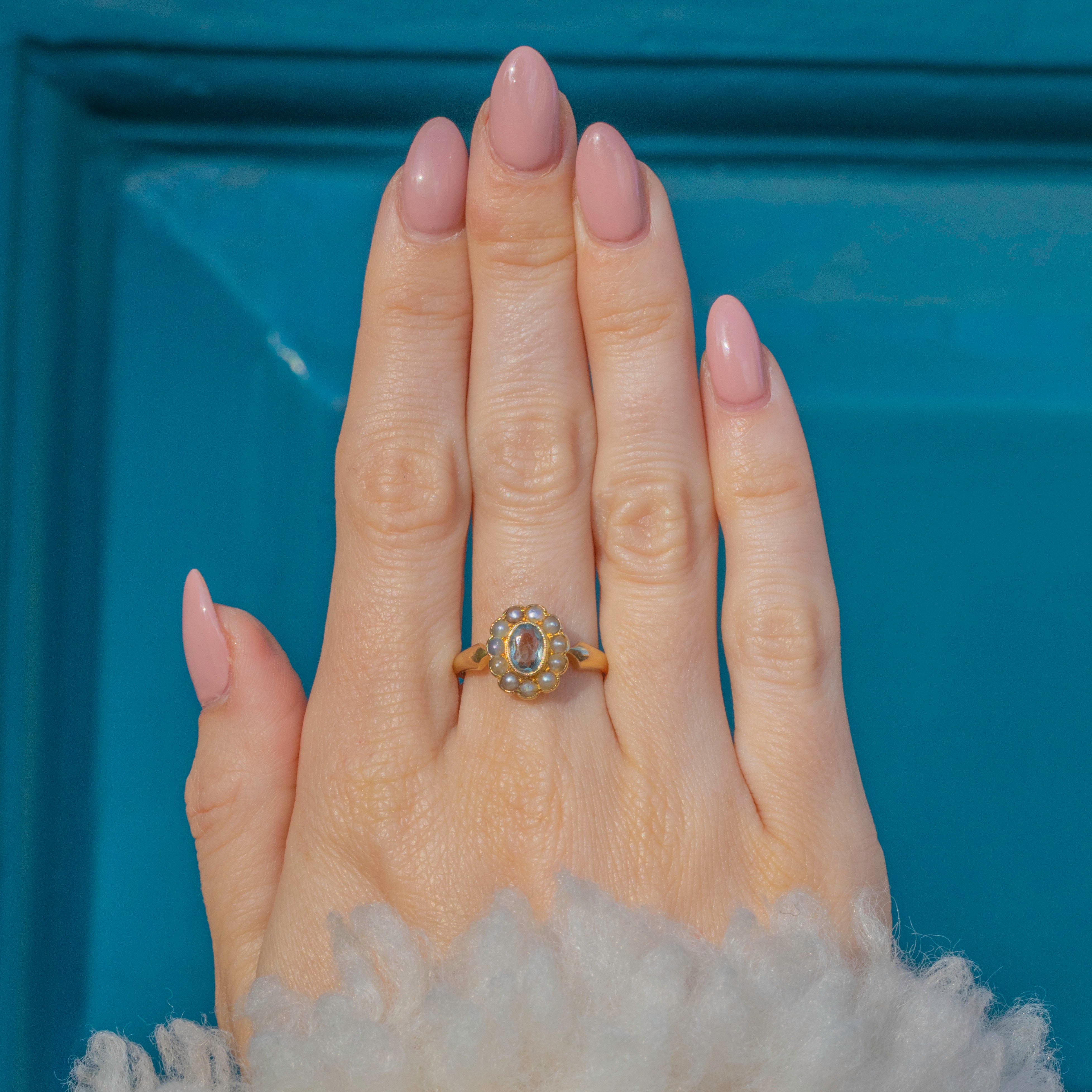 Glittering at the centre is an icy 0.25ct Aquamarine, reflecting fresh sky-blue tones in natural light. Cushioning this glorious gem are plump seed Pearls radiating femininity.