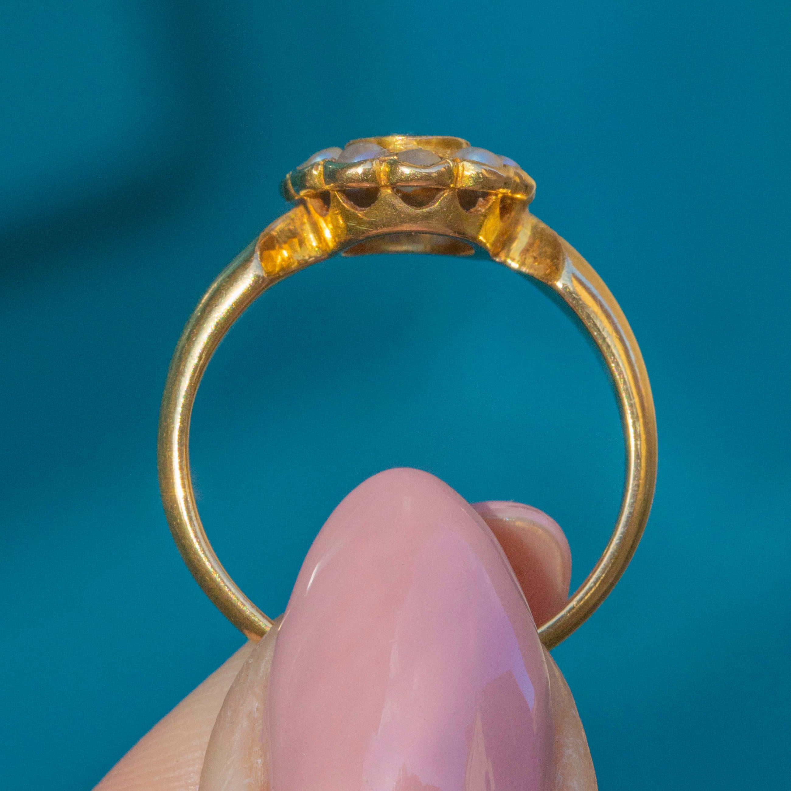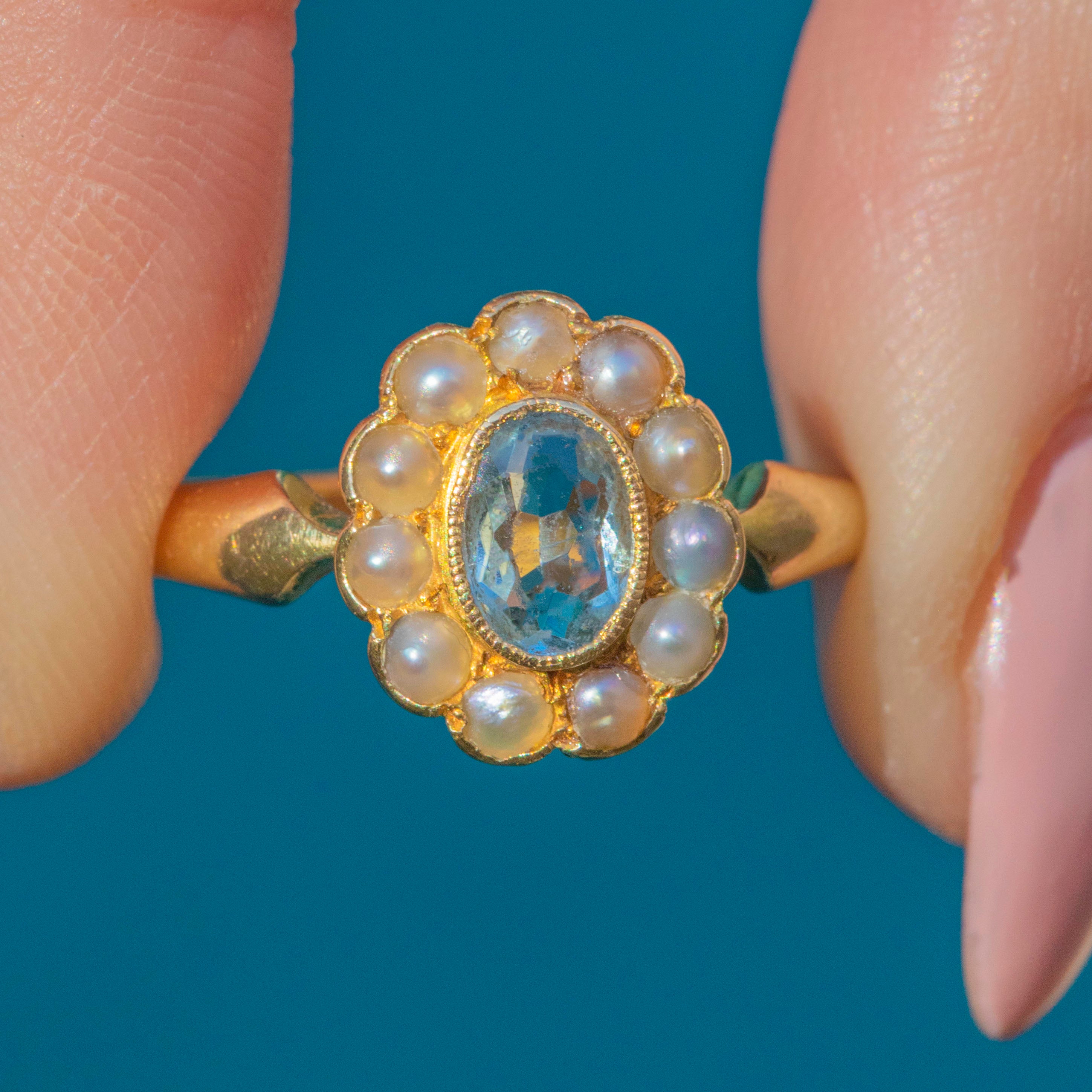 How pretty is this Edwardian 18ct Gold Aquamarine Pearl cluster ring?! Possessing plenty of grace and elegance, the Aquamarine and Pearls are arranged into a dainty floral design, making her a gorgeous gift for your partner or loved one!
