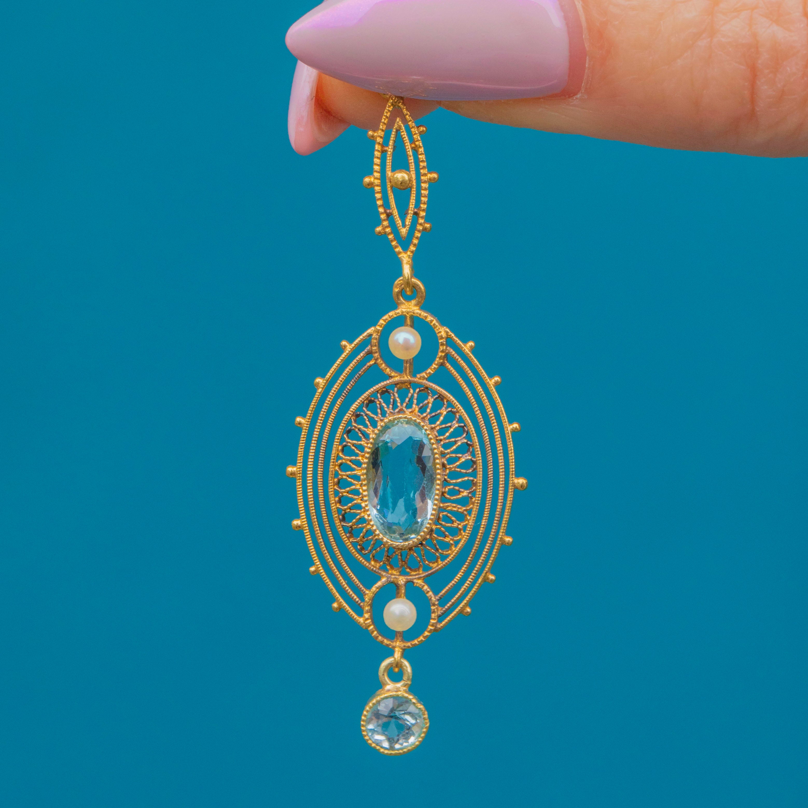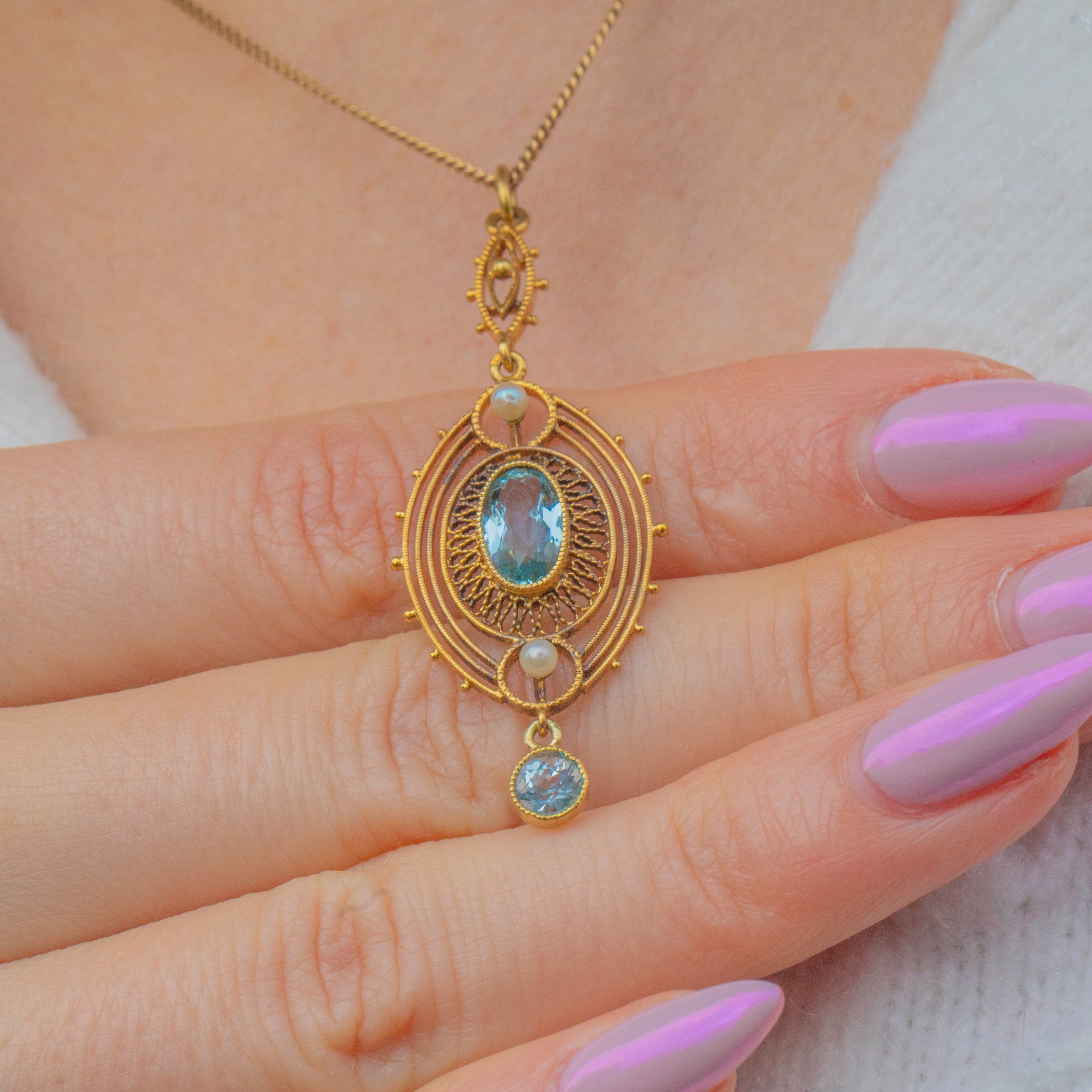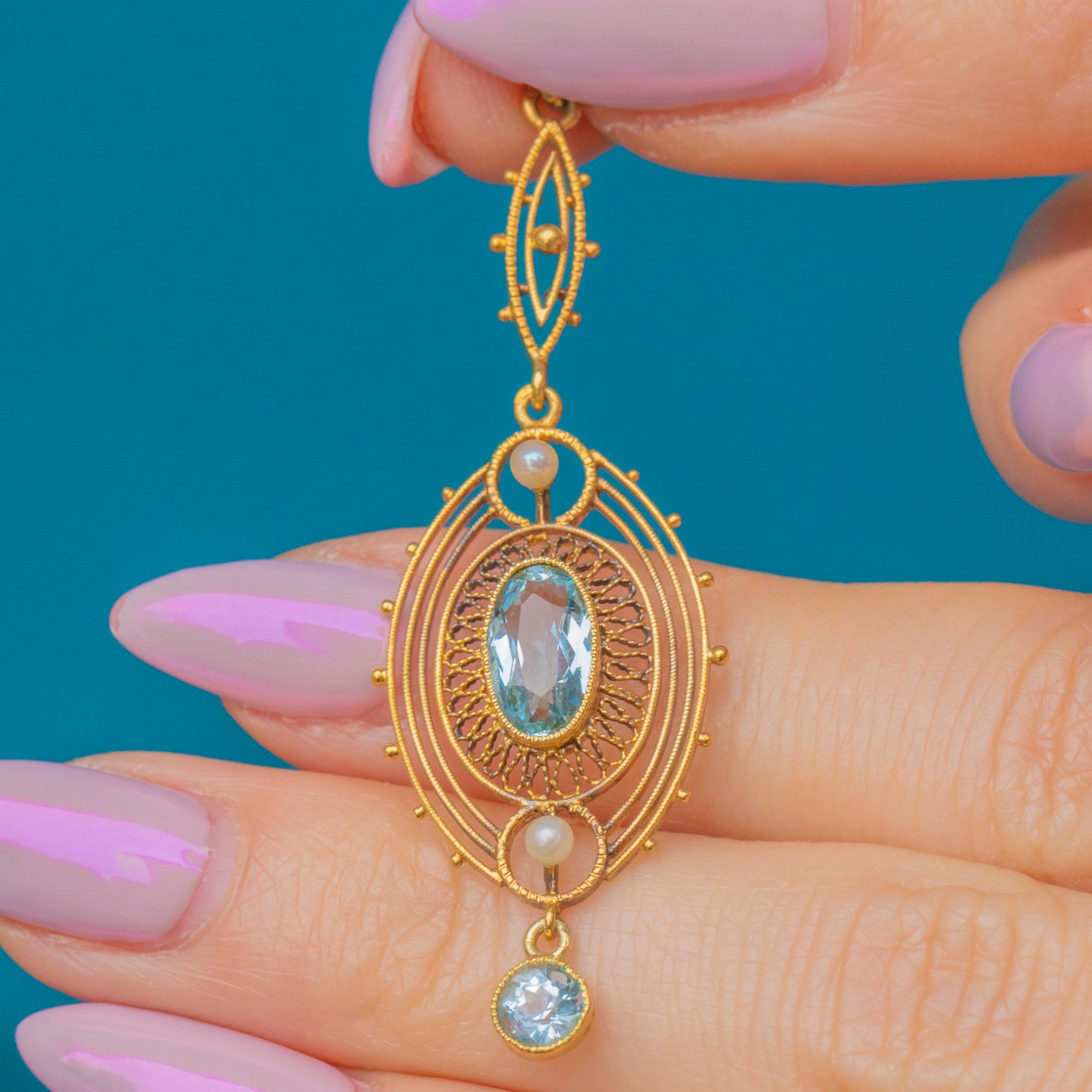 A graceful Edwardian pendant crafted in finely detailed 18ct Gold filigree, set with natural Aquamarines and Pearls. The icy blue hues of the Aquamarines shimmer beautifully against the warm Gold, their soft sparkle enhanced by the creamy lustre of the Pearls.