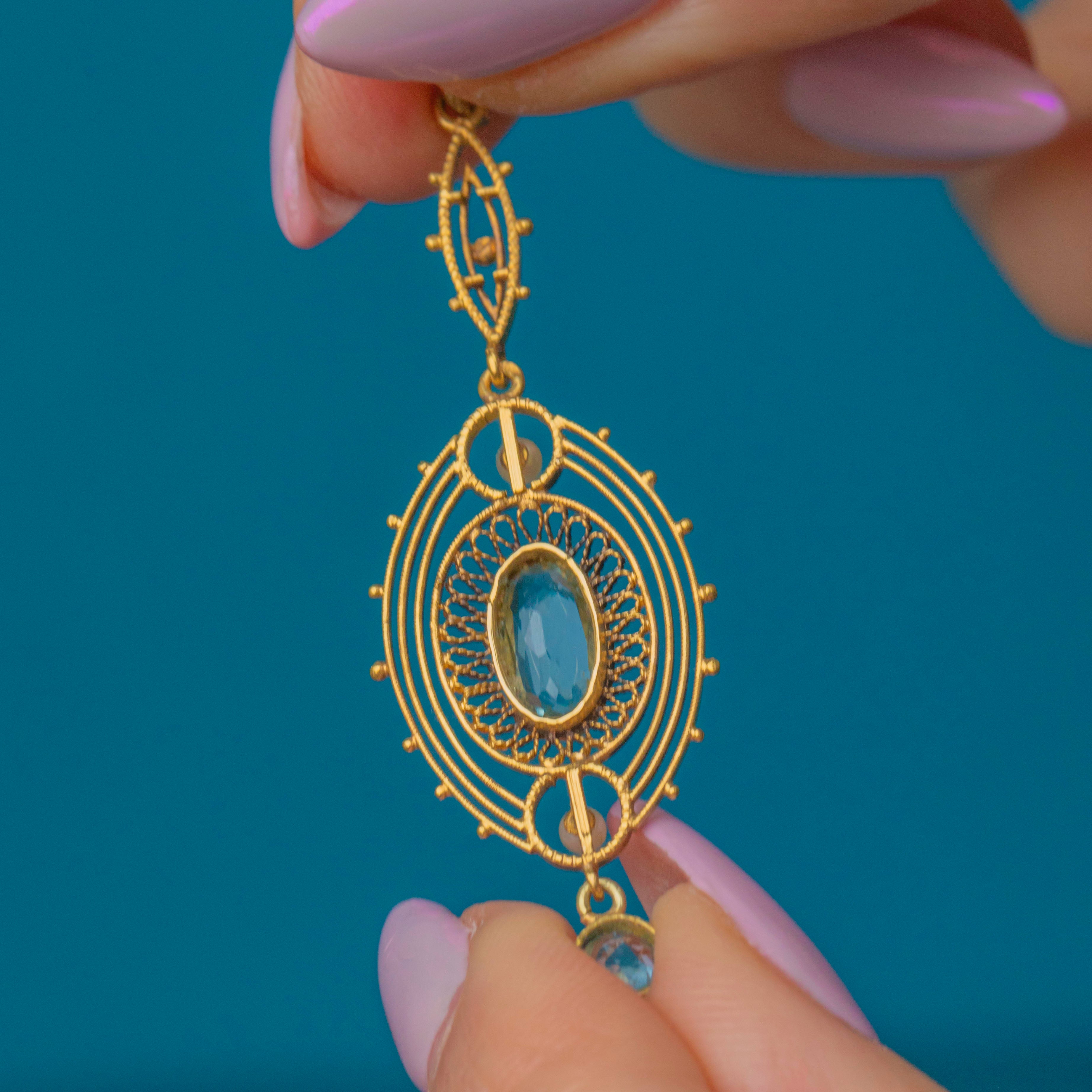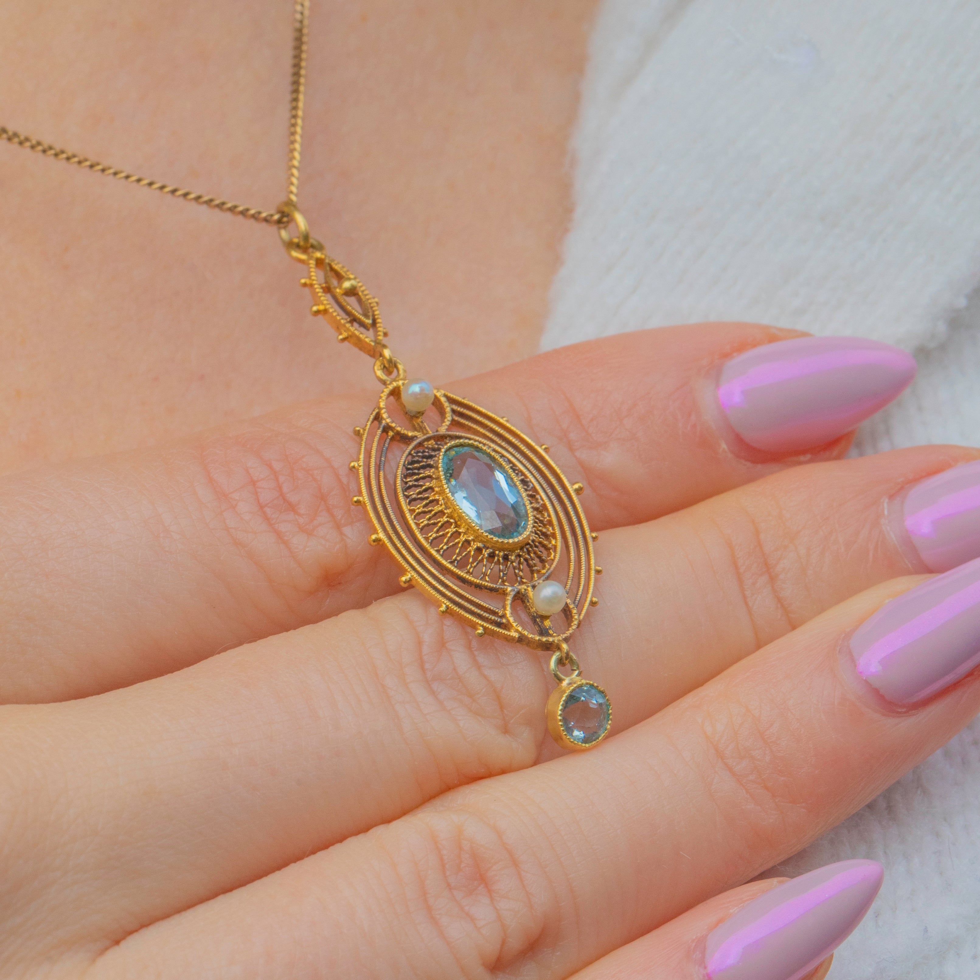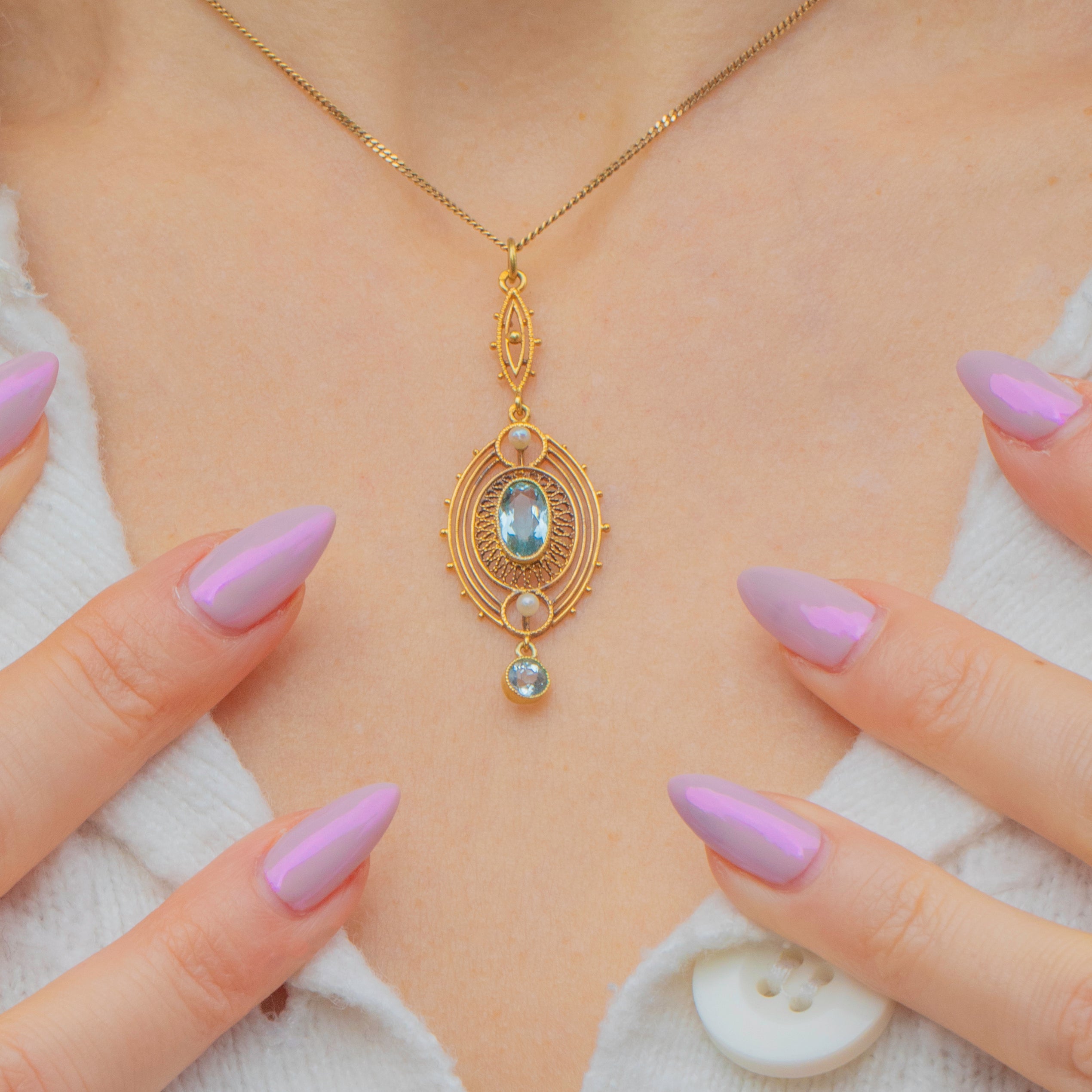 A graceful Edwardian pendant crafted in finely detailed 18ct Gold filigree, set with natural Aquamarines and Pearls. The icy blue hues of the Aquamarines shimmer beautifully against the warm Gold, their soft sparkle enhanced by the creamy lustre of the Pearls.