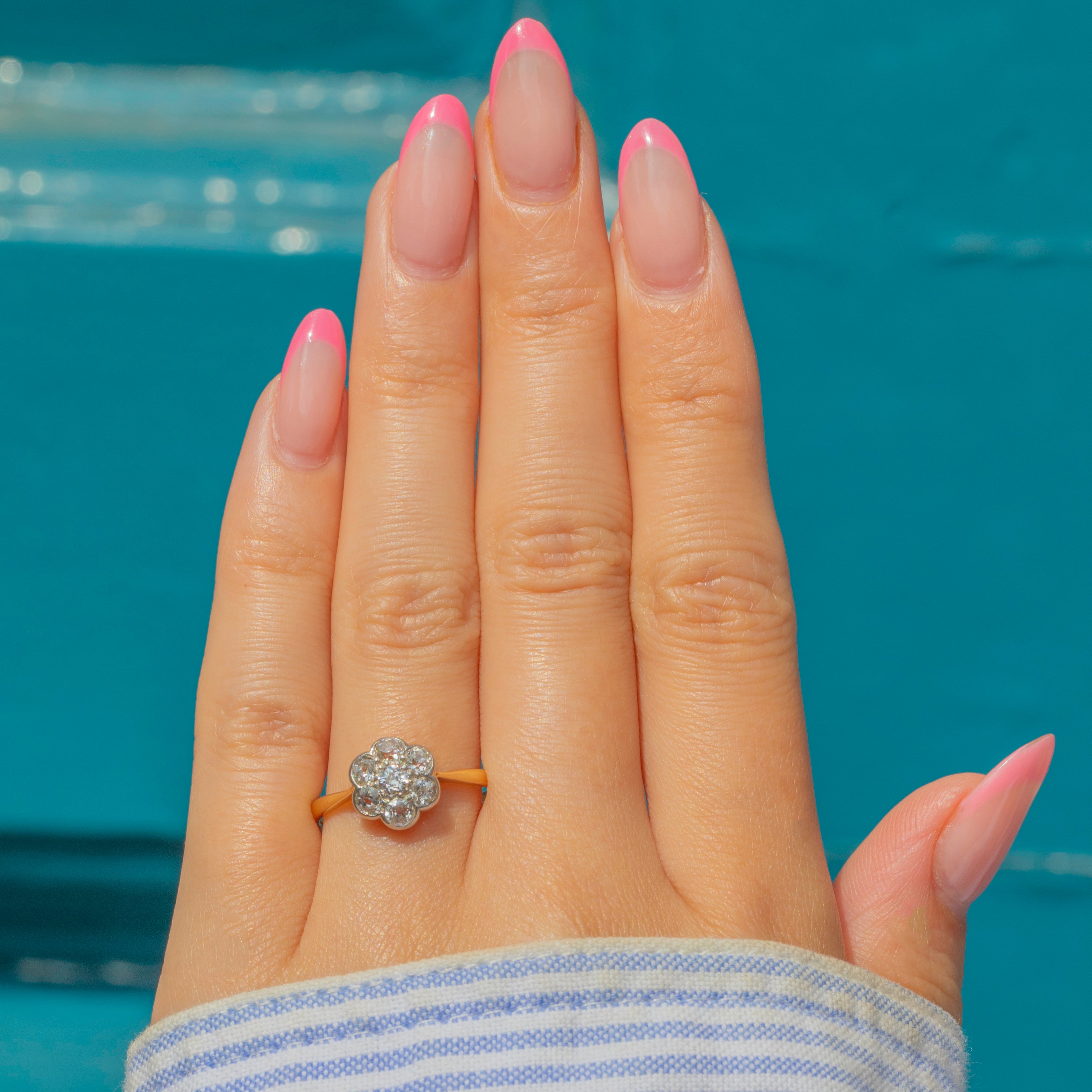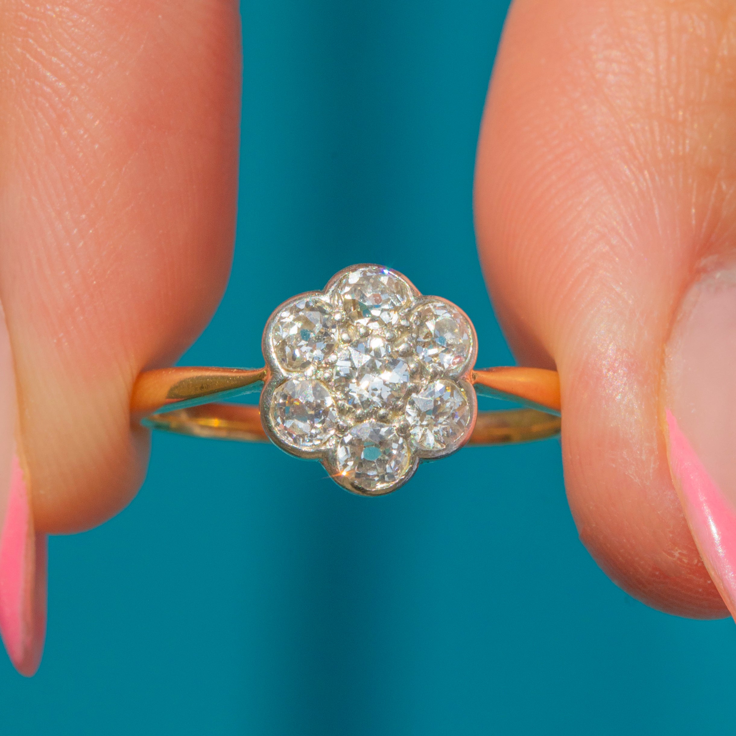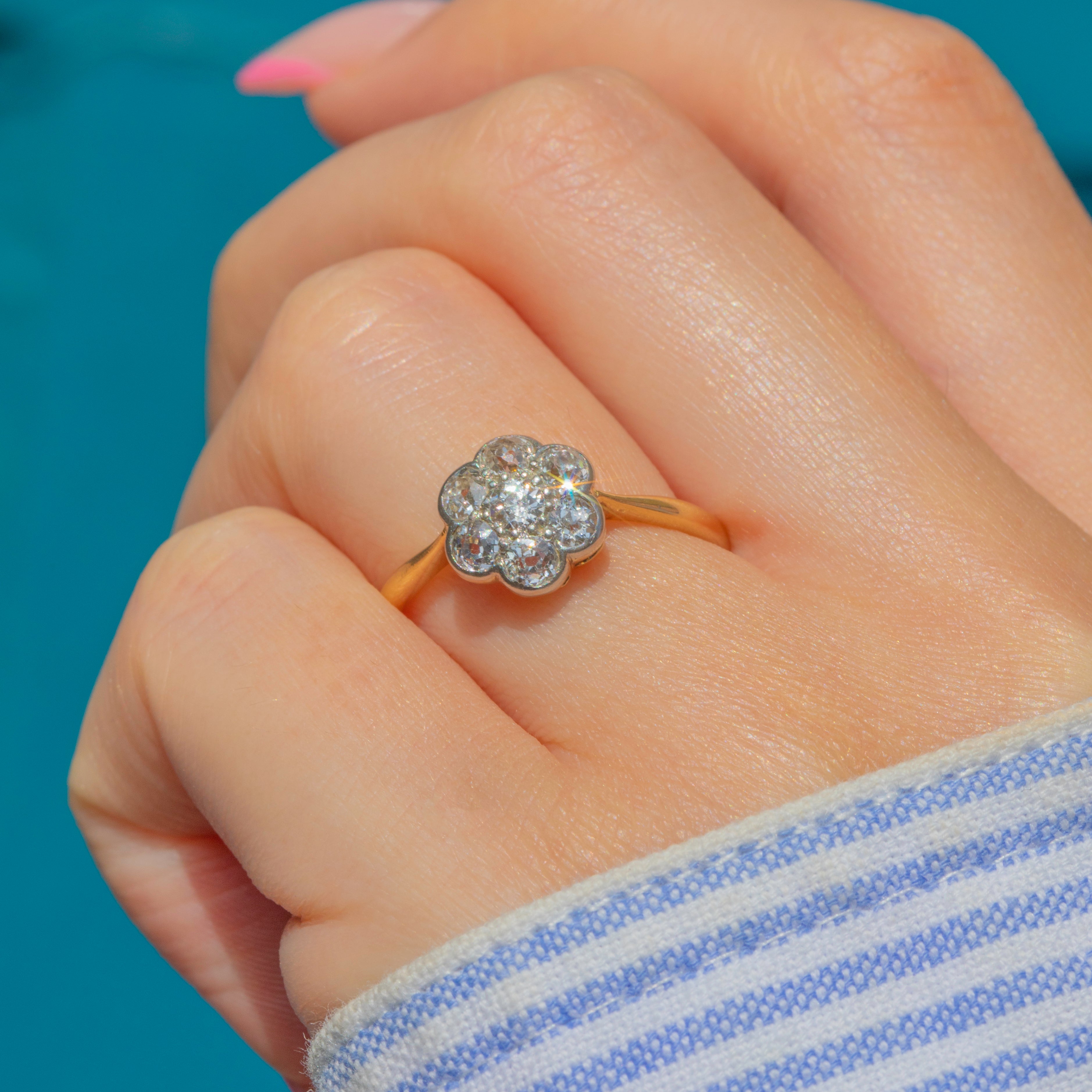 The bright Diamond cluster is displayed on a buttery 18ct Gold band and combined with its low profile, this Edwardian ring is perfect for everyday wear; she'd make a gorgeous choice for an engagement ring!