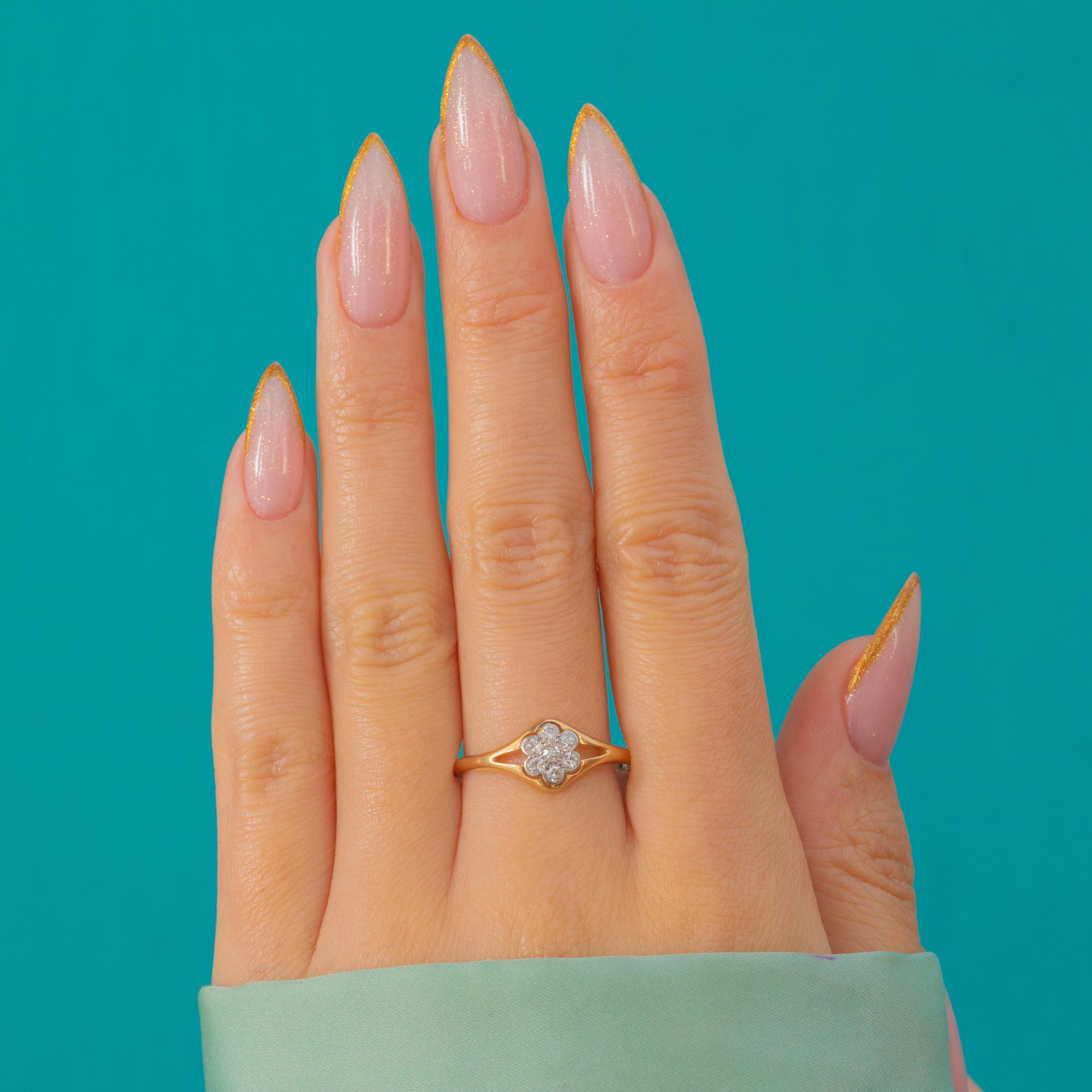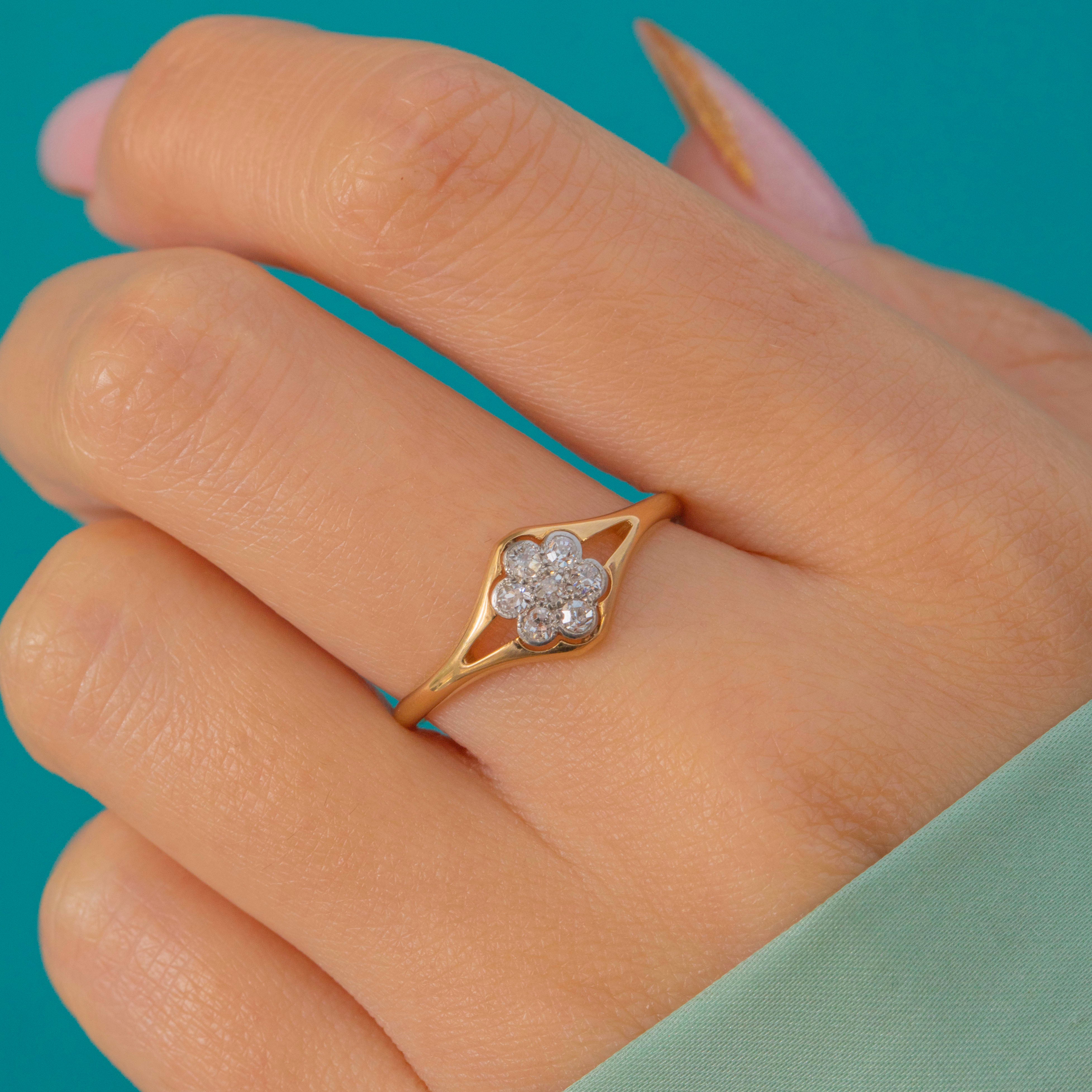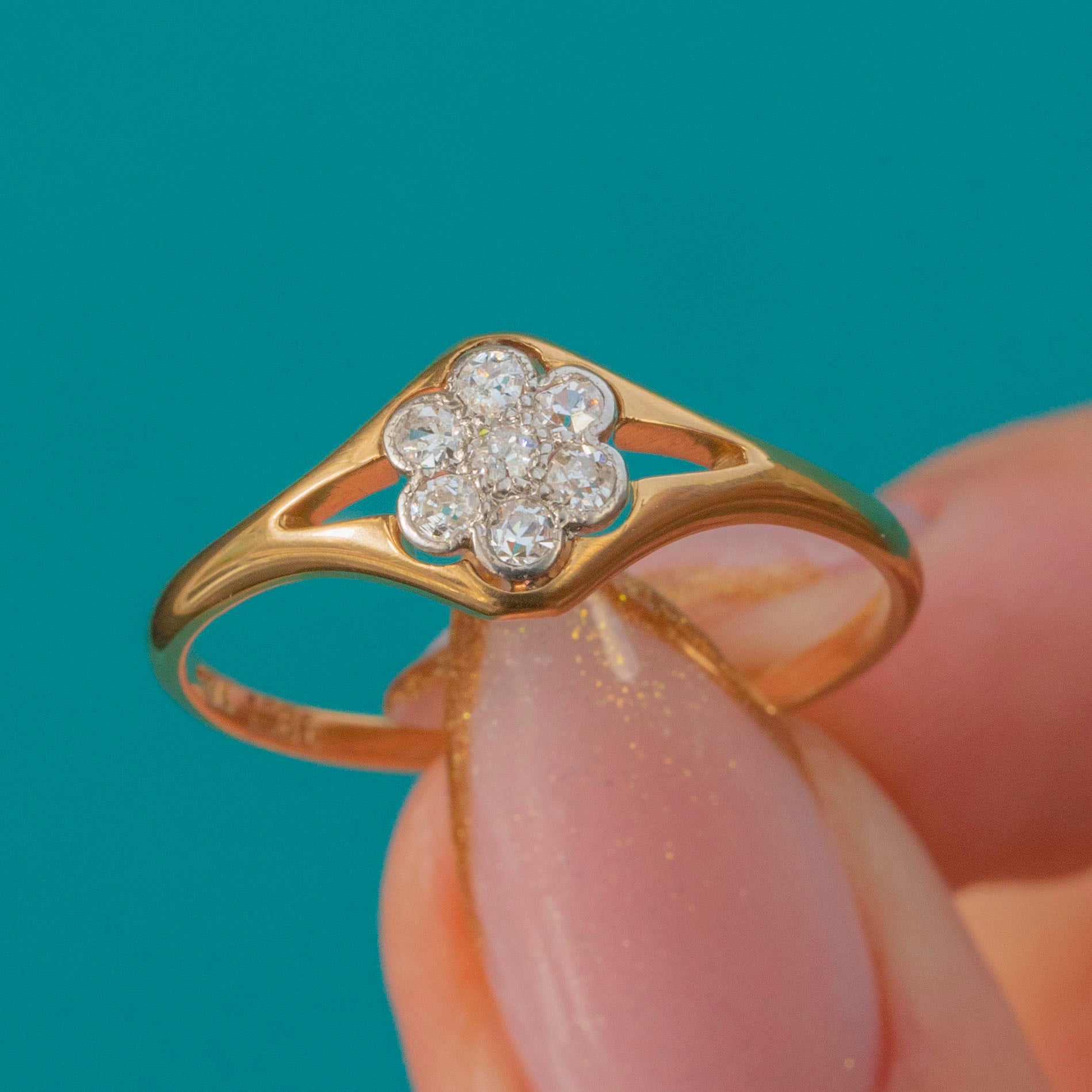 This charming antique 18ct Gold Edwardian ring features a delicate daisy cluster of old mine and old European-cut Diamonds, glistening with that unmistakable antique sparkle. The Diamonds form a perfect floral motif, symbolising purity and love, a much-loved Edwardian design that remains effortlessly wearable today.