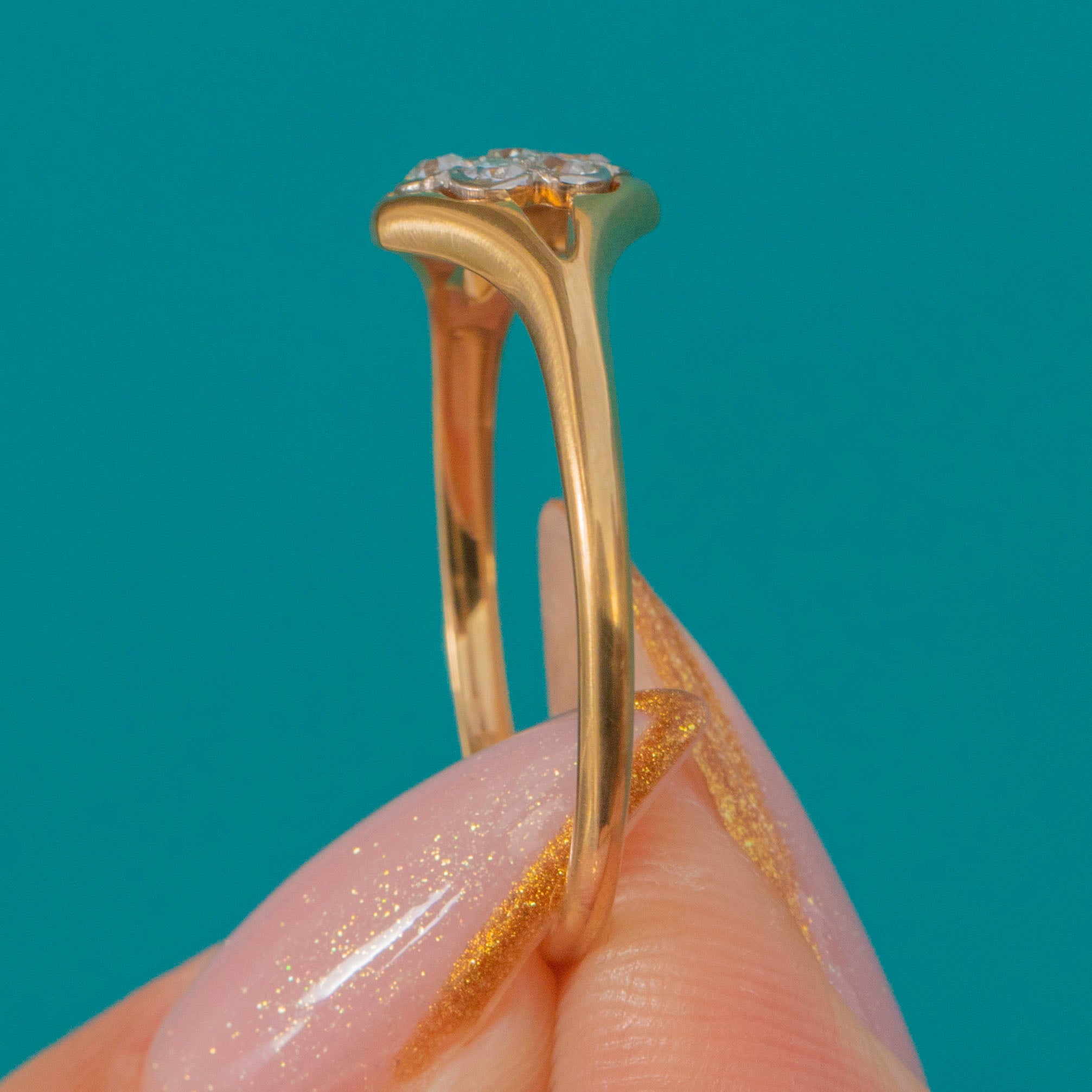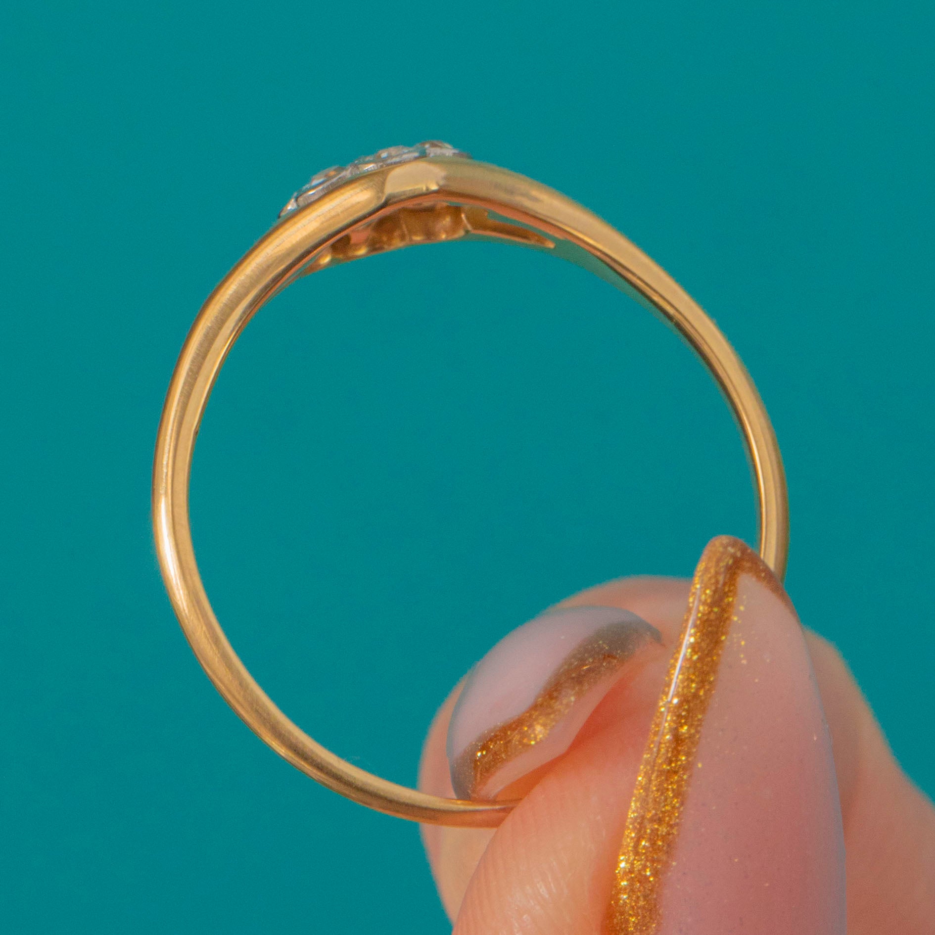 Crafted in 18ct Gold with open shoulders for a light, graceful profile, this pretty piece captures the romantic spirit of the early 1900s. Dainty yet full of fire, it’s a beautiful choice for everyday wear or as a sentimental antique gift.