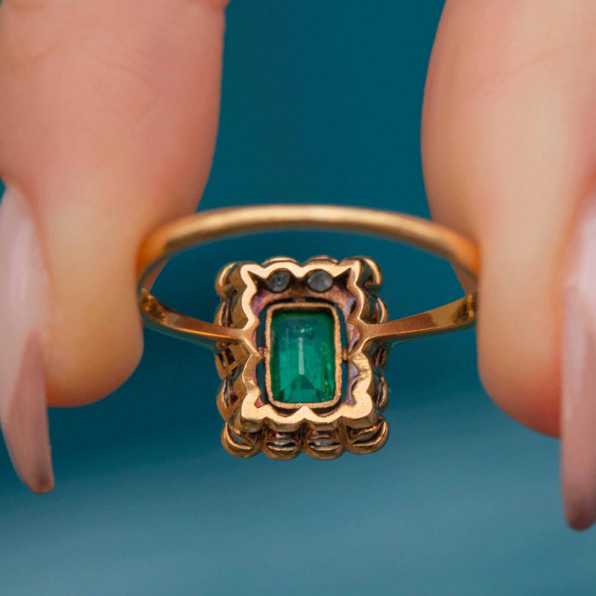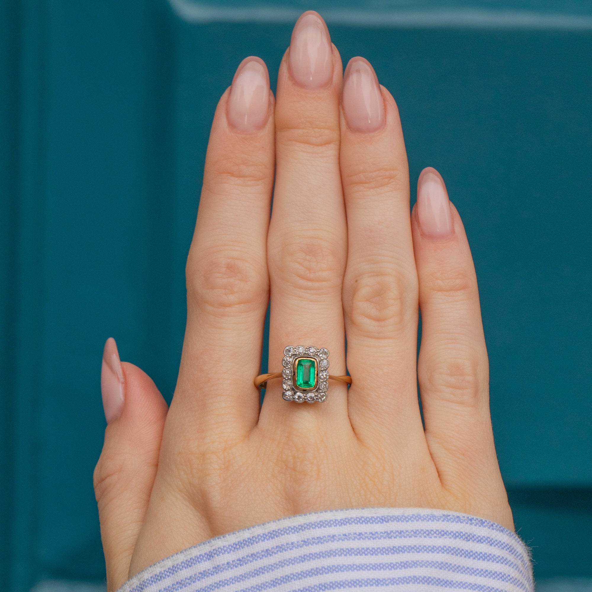 The ring wears easily, looking splendid on the finger, and her 18ct Gold band is bright and buttery. Boasting a fabulous vibrant 0.40ct Emerald and fourteen vivacious Diamonds, you'll find this piece hard to resist!