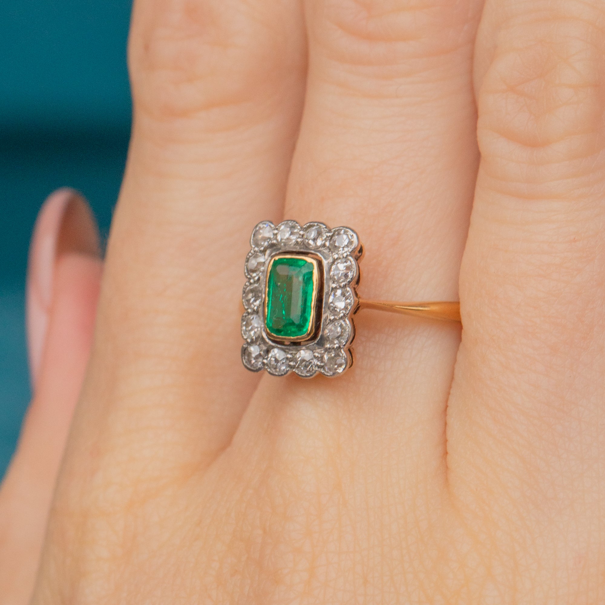 Edwardian 18ct Gold Emerald Diamond Cluster Ring, 0.40ct Emerald