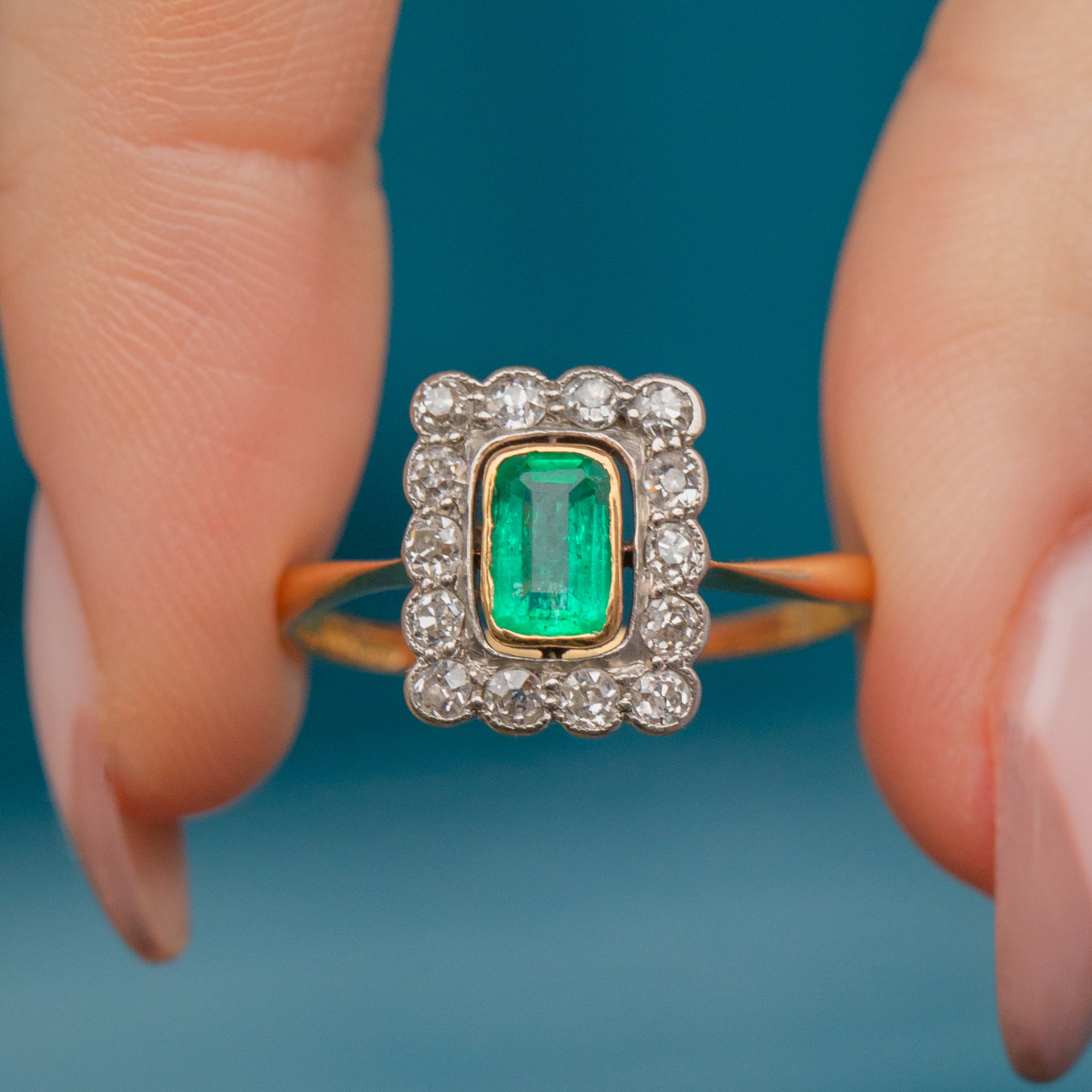 This antique Edwardian 18ct Gold Emerald Diamond cluster ring will make a magnificent addition to your collection. We are obsessed with the spearmint green Emerald, perfectly paired with scintillating Diamonds!