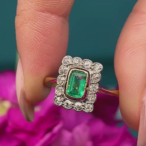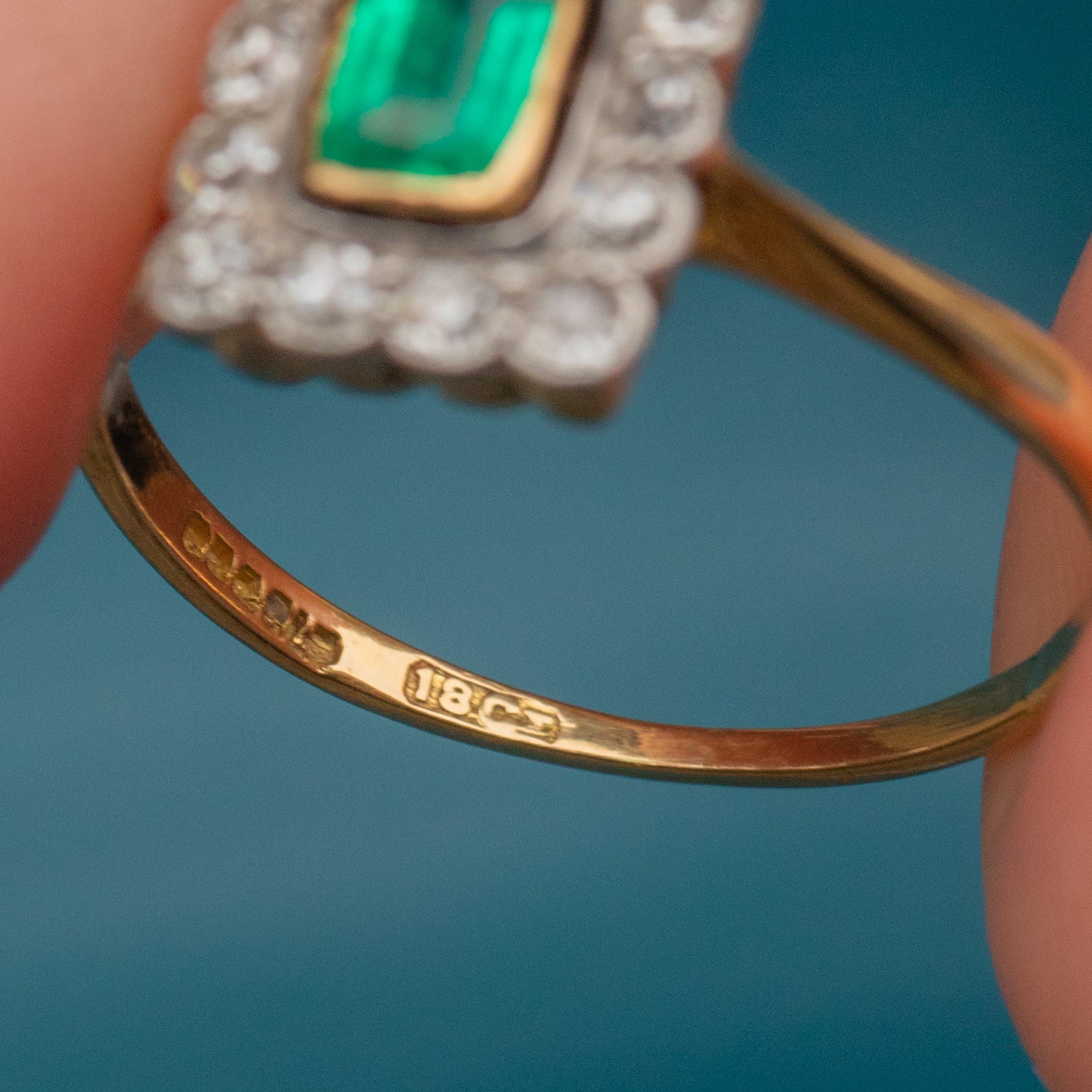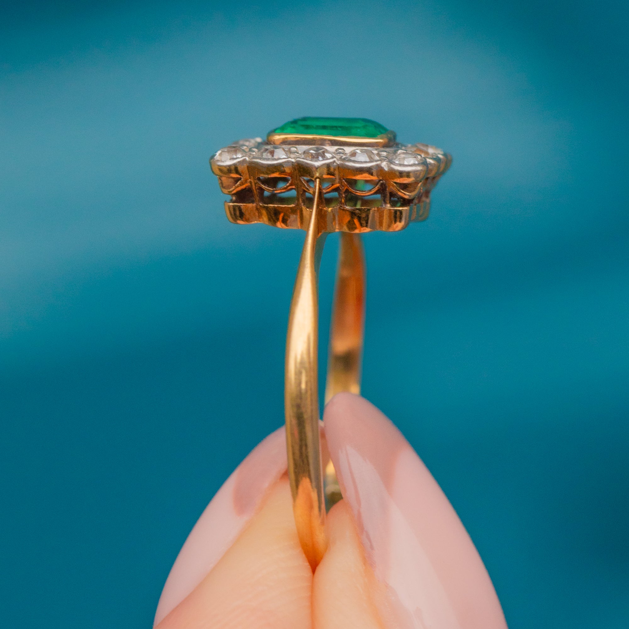 VERY GOOD. This antique Edwardian 18ct Gold Emerald Diamond cluster ring is in very good condition. The Emerald has an eye-catching bright green hue and while there is a small scuff to her surface, she still shines luxuriously under the light. The Diamonds are all present and free from any fleabites. The Platinum setting is lustrous and holds the gemstones securely in place. The Gold band is smooth allowing you to wear this spectacular antique Emerald Diamond ring with confidence!