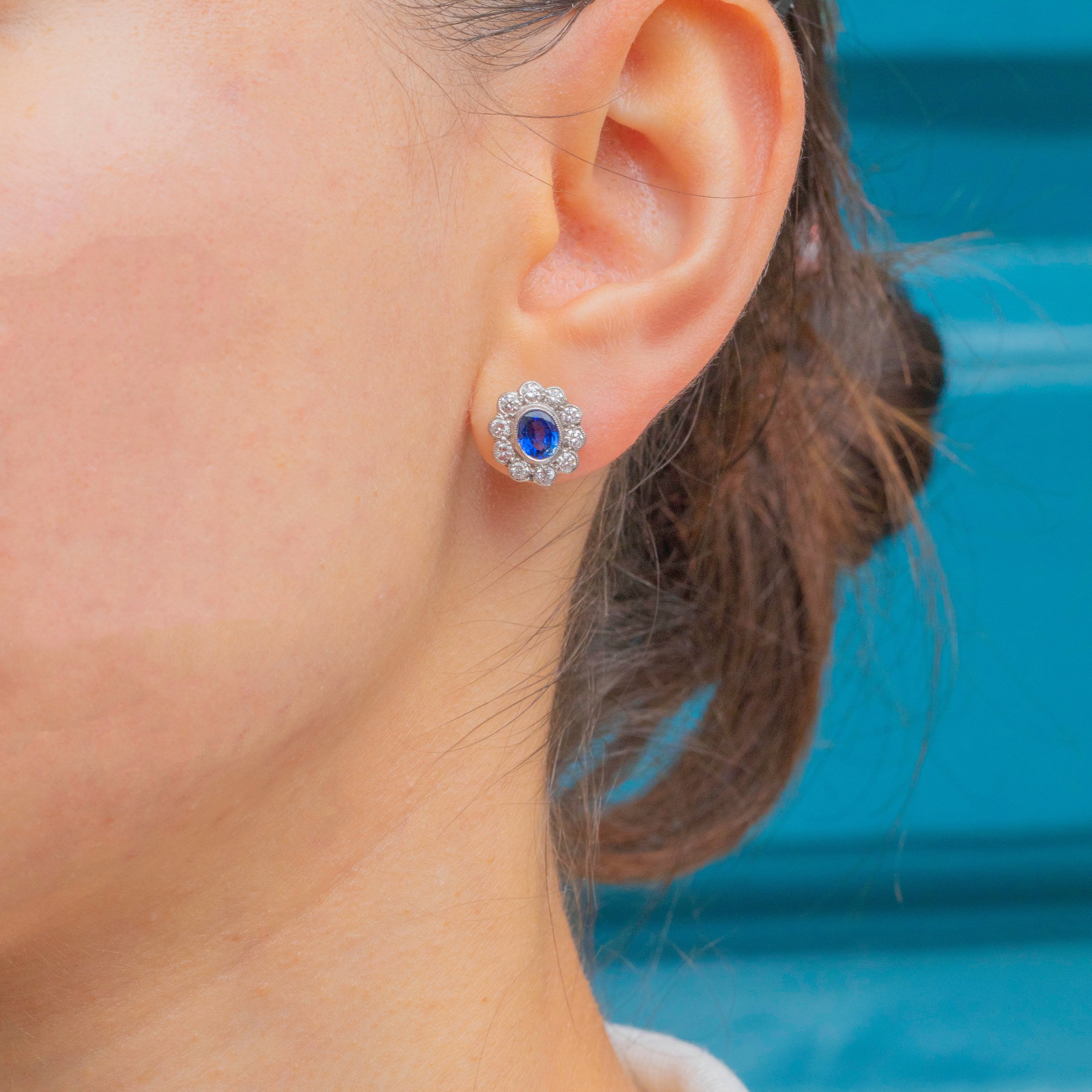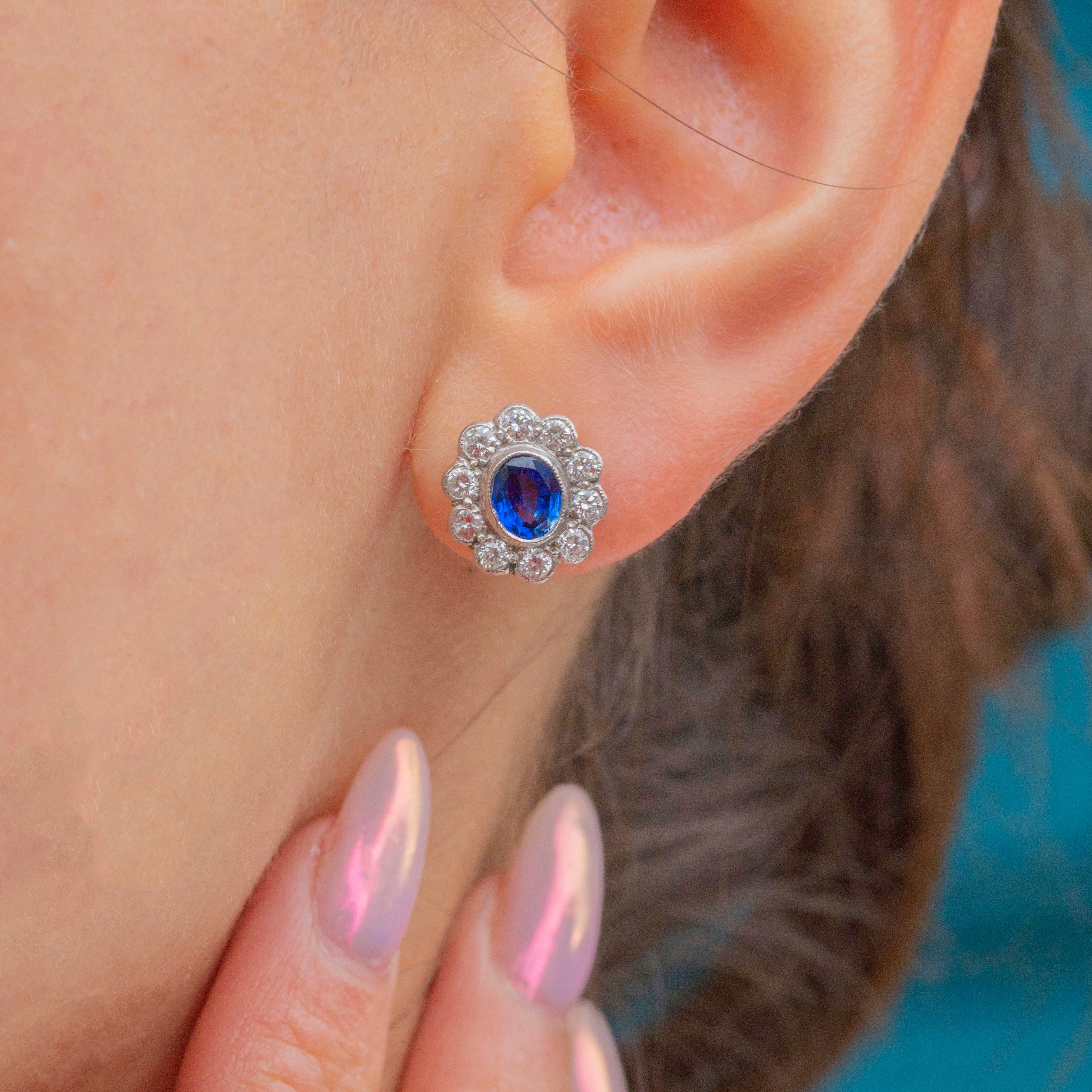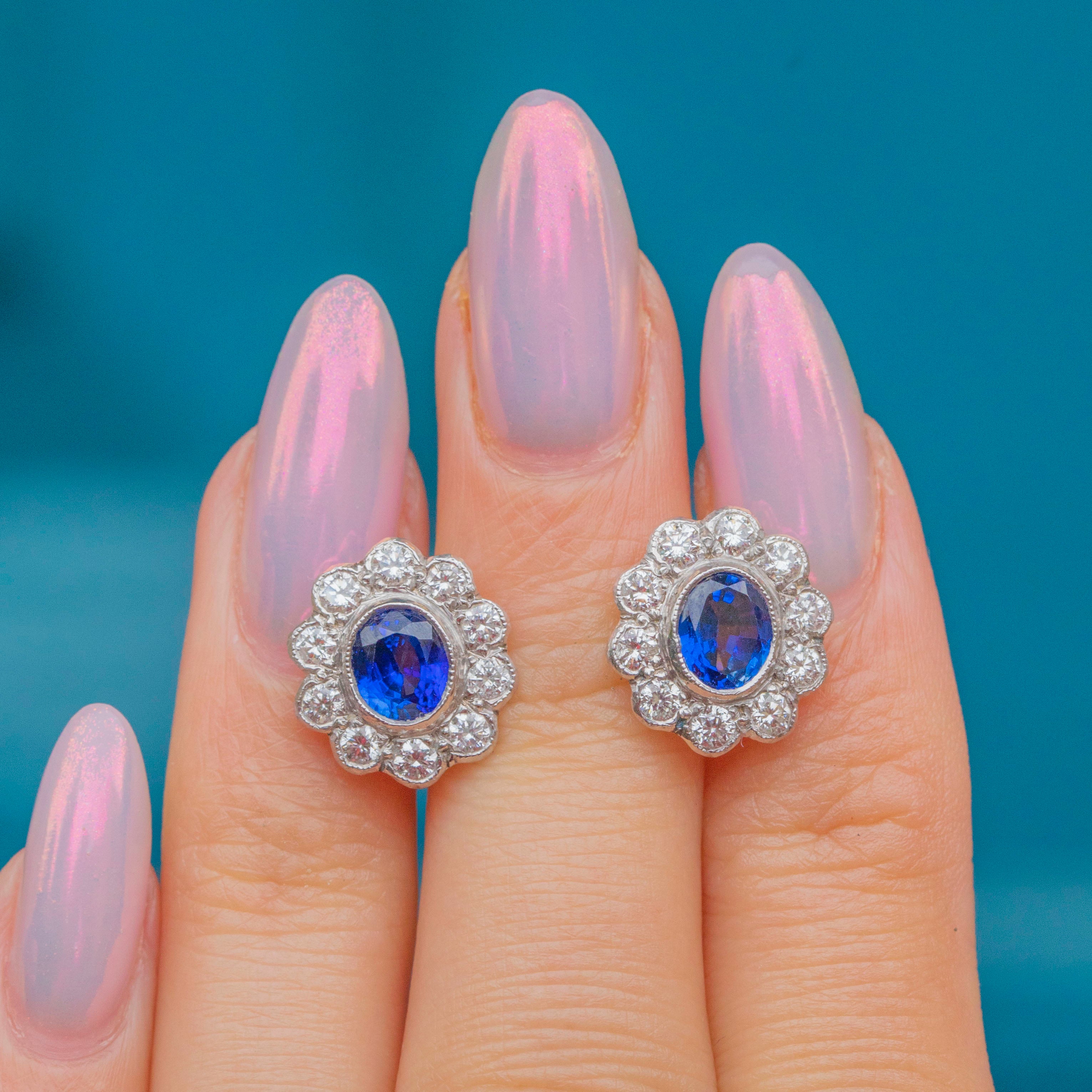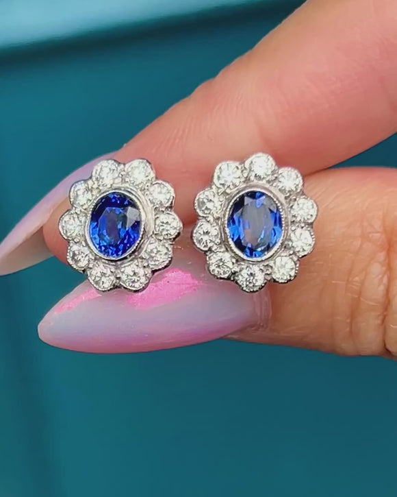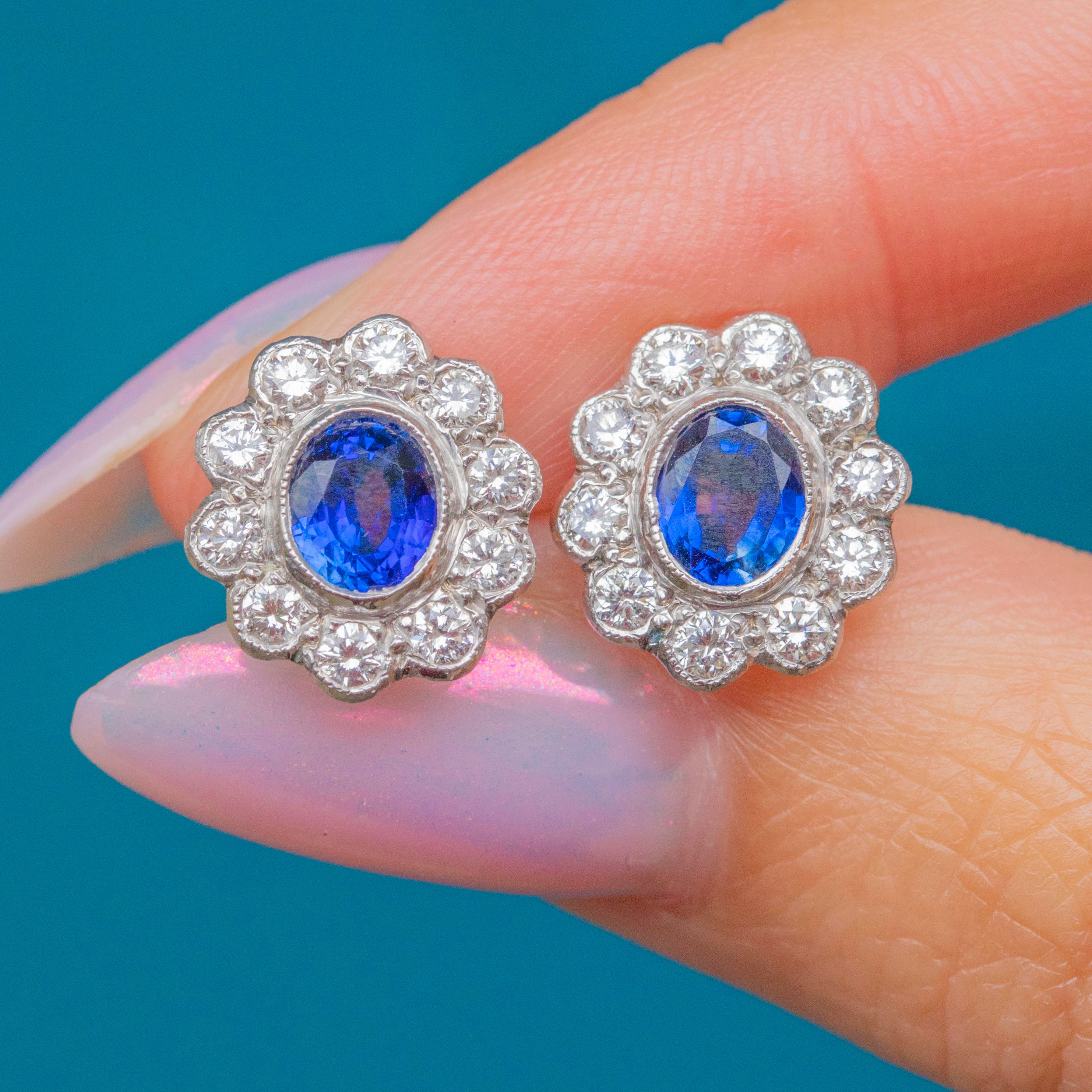 These antique cluster earrings are an exceptional find, boasting 0.66cts of true blue natural Sapphires haloed by 0.34cts of scintillating Diamonds, all set in bright 18ct White Gold. The classic cluster formation provides the lobes with impressive coverage, dazzling effortlessly from all angles.