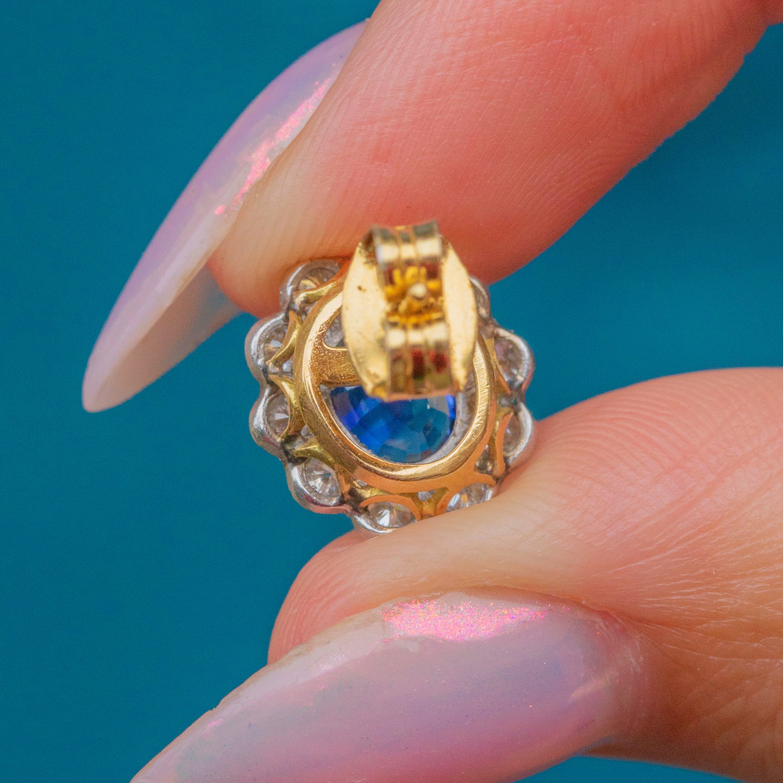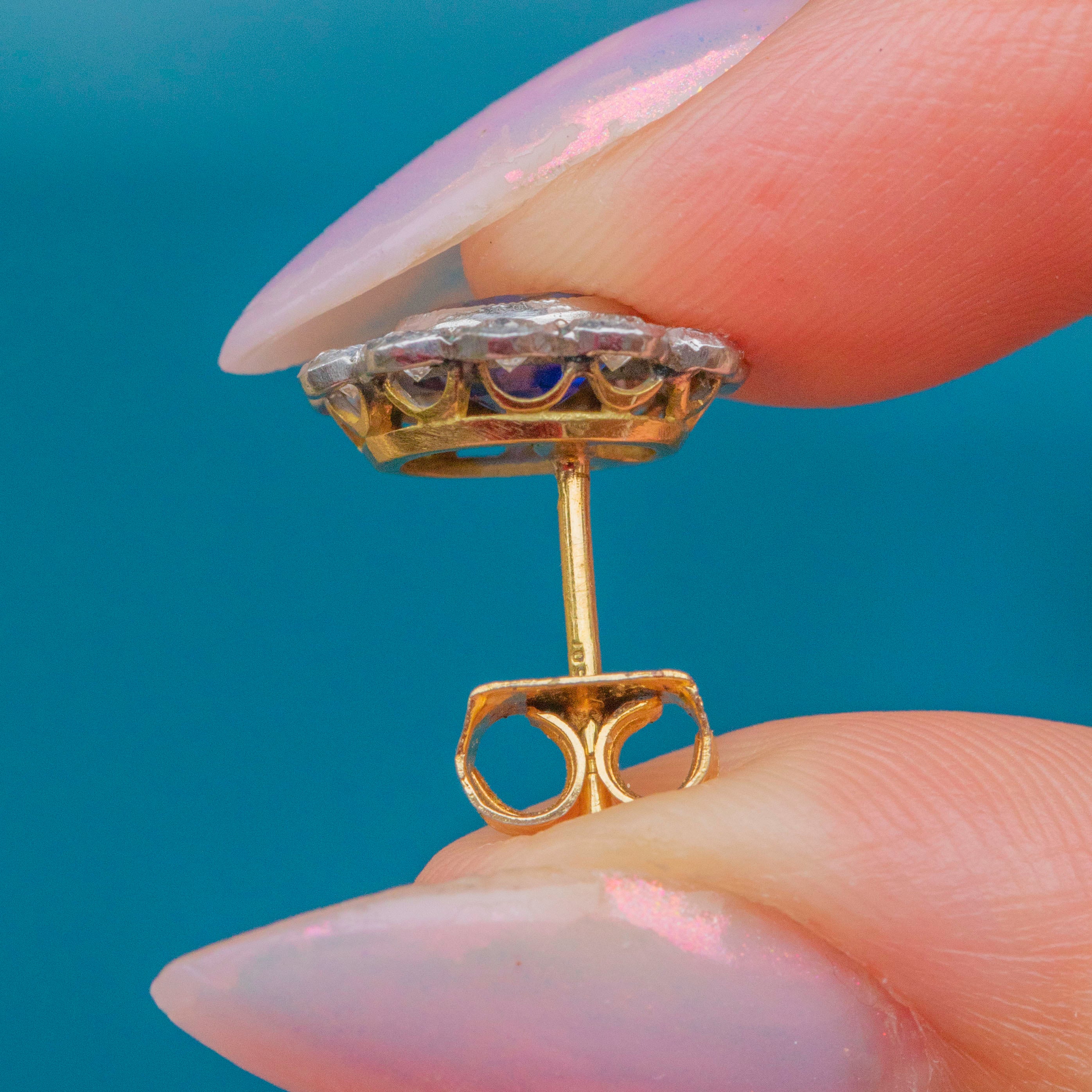 EXCELLENT: A beautiful pair of antique natural Sapphire stud earrings in fantastic condition! The gemstones are all securely set and free from chips or abrasions, and the 18ct Yellow and White Gold settings are bright with no notable surface wear. With snug-fitting butterfly backs, you can enjoy wearing these antique Sapphire Diamond studs with absolute confidence!
