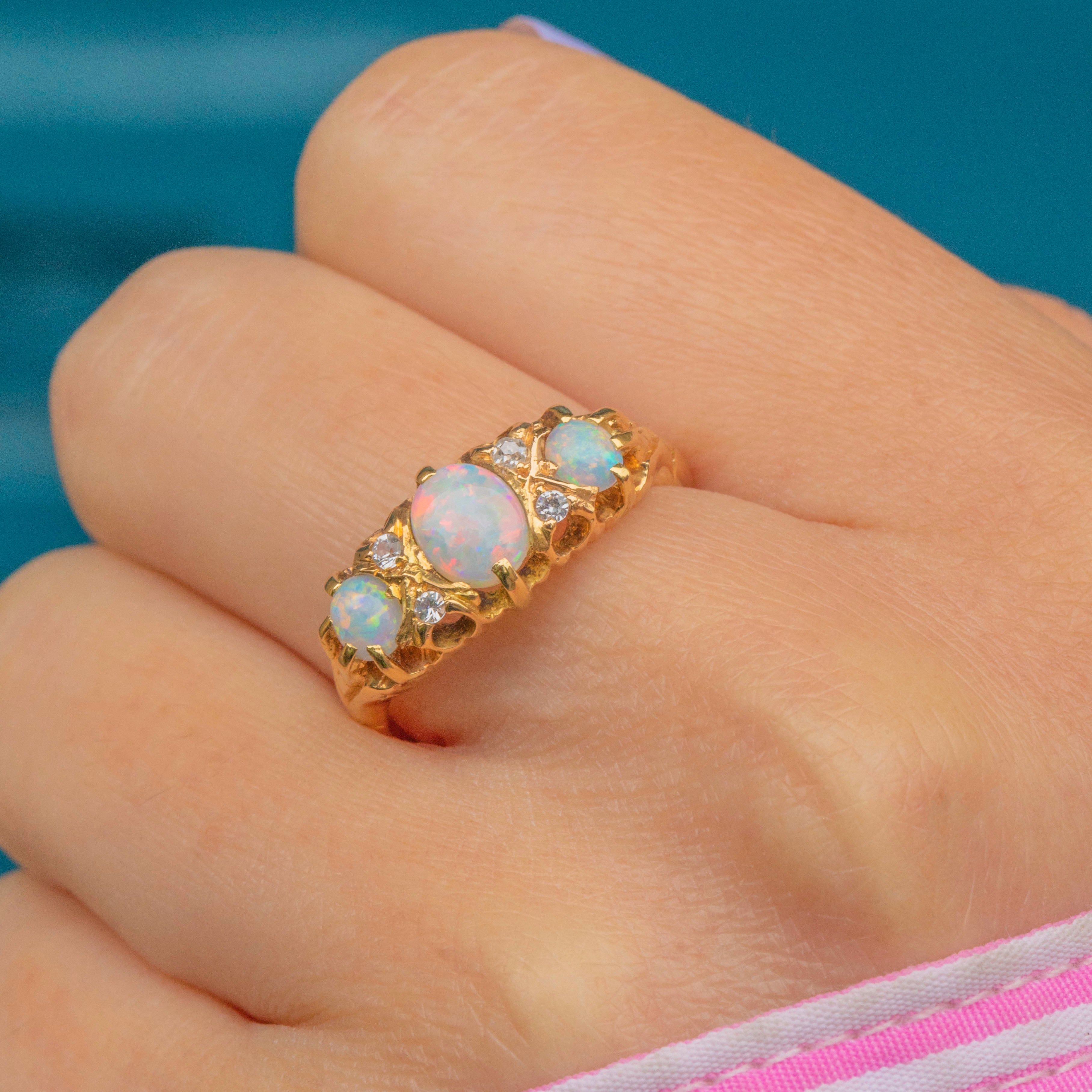 EXCELLENT: This Edwardian 18ct Gold Opal Diamond ring is in excellent condition. Each gemstone is in fabulous condition and secure within its settings. There is some very minor surface wear to the inner band commensurate with age, though this cannot be seen when wearing. With little else to note, she is in brilliant condition!
