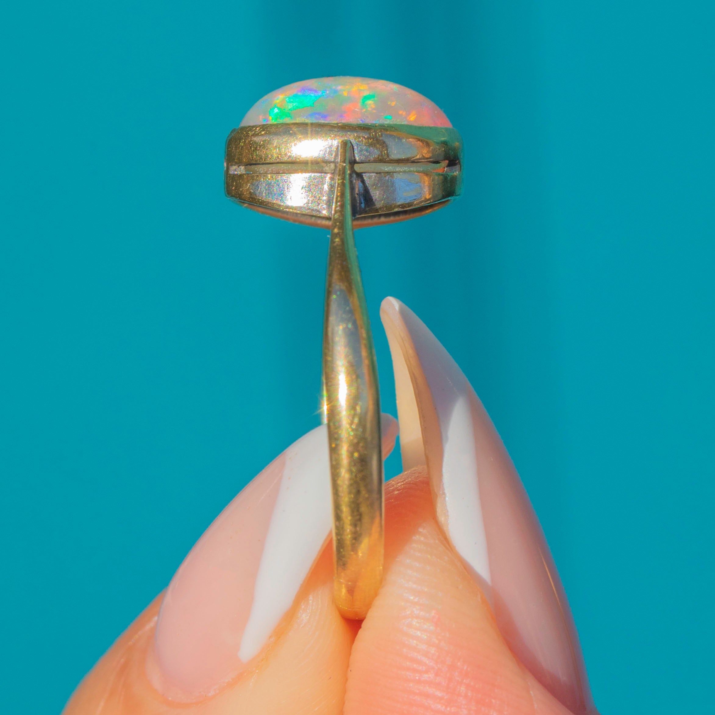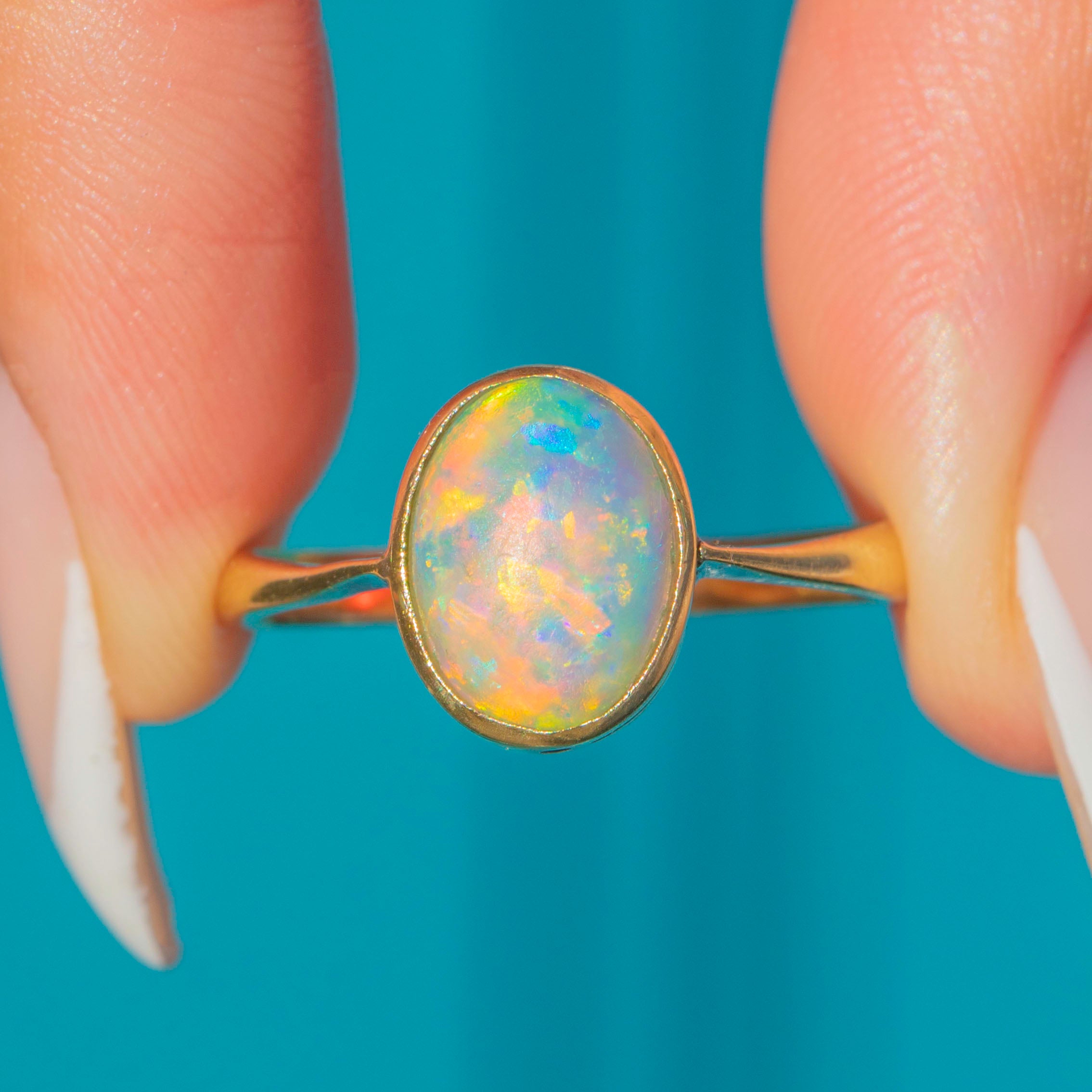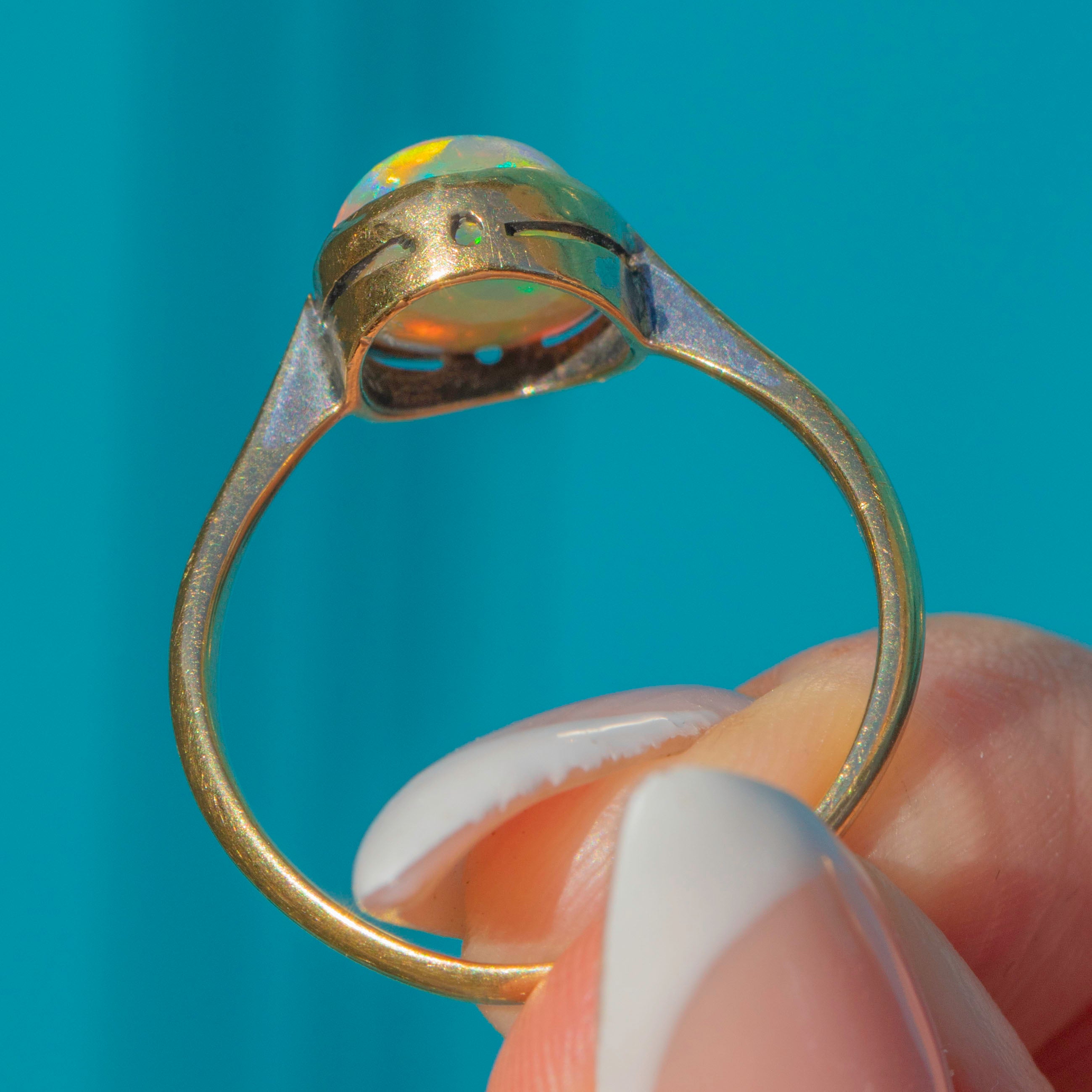 This elegant Edwardian ring is crafted in 18ct Gold and set with a vibrant natural Opal. The oval cabochon, measuring 10mm x 8.5mm, displays a beautiful play-of-colour with flashes of yellow, green, and blue dancing across its surface.