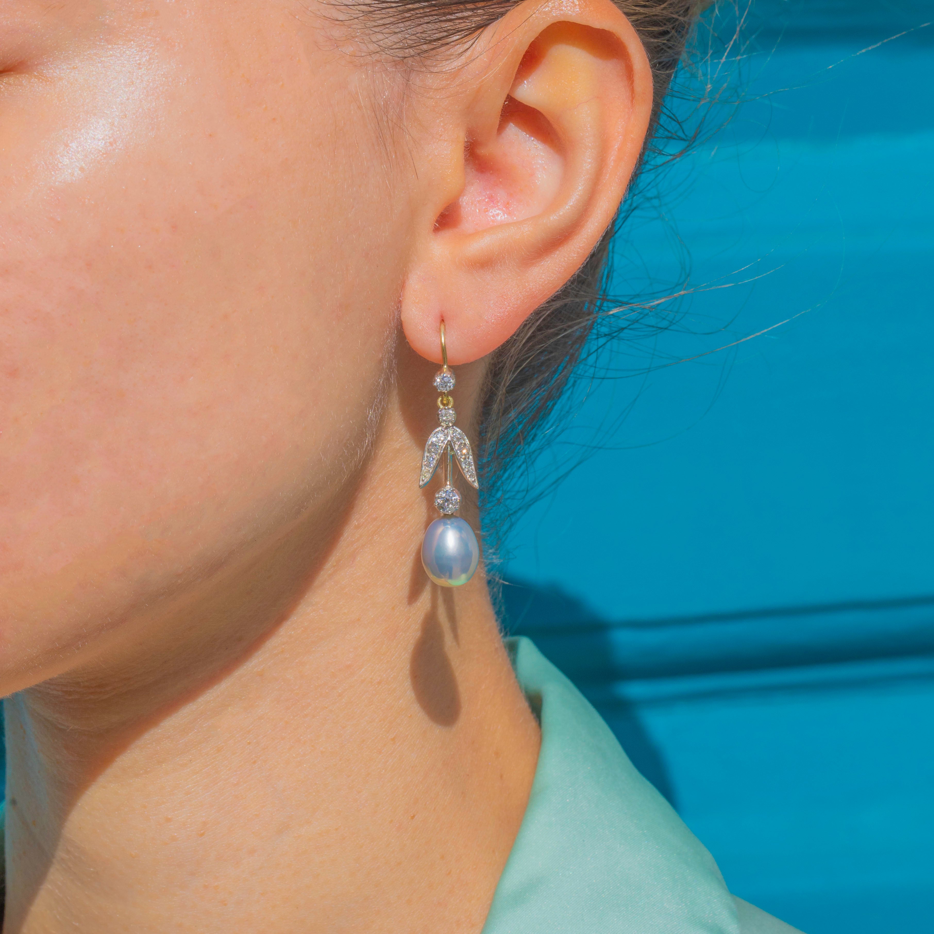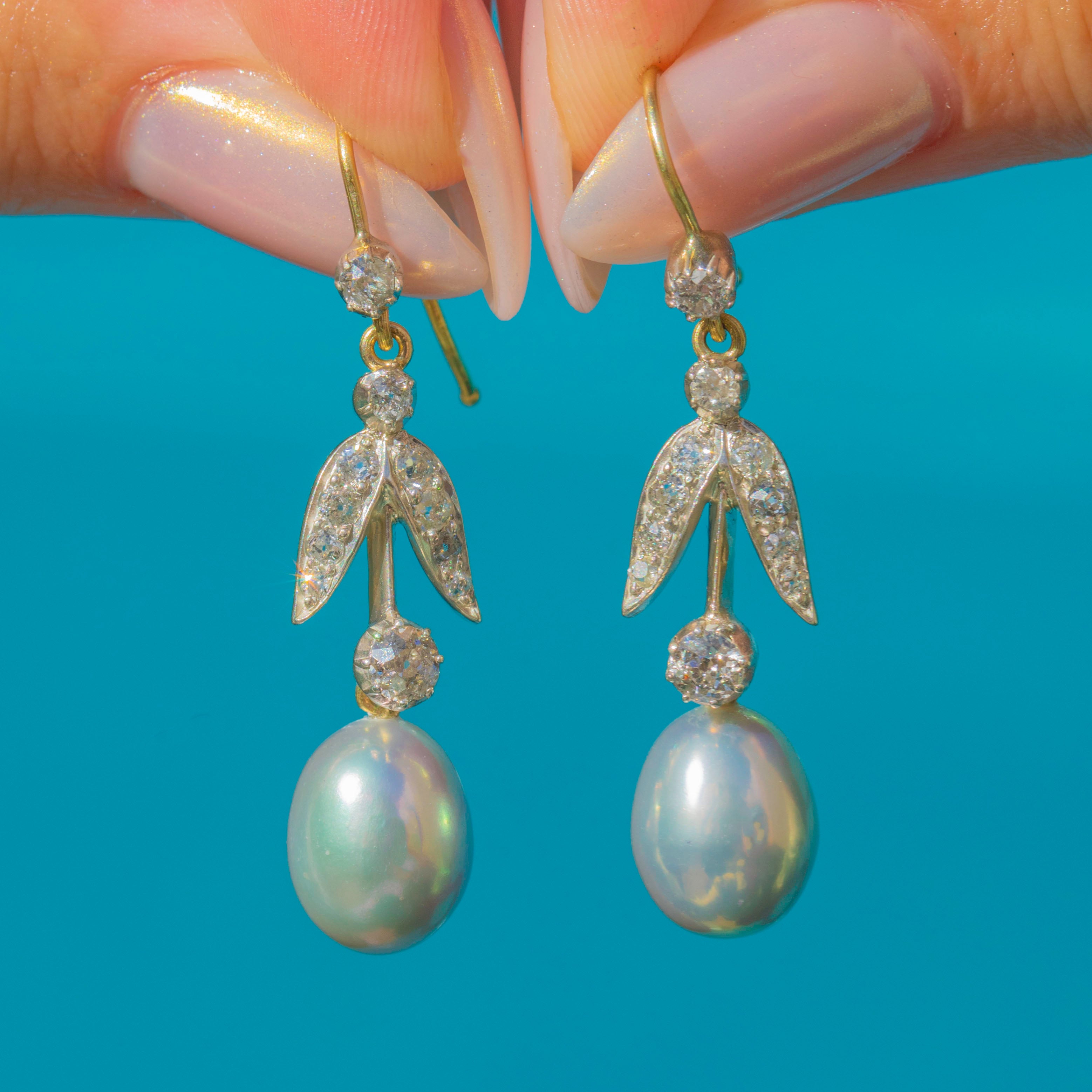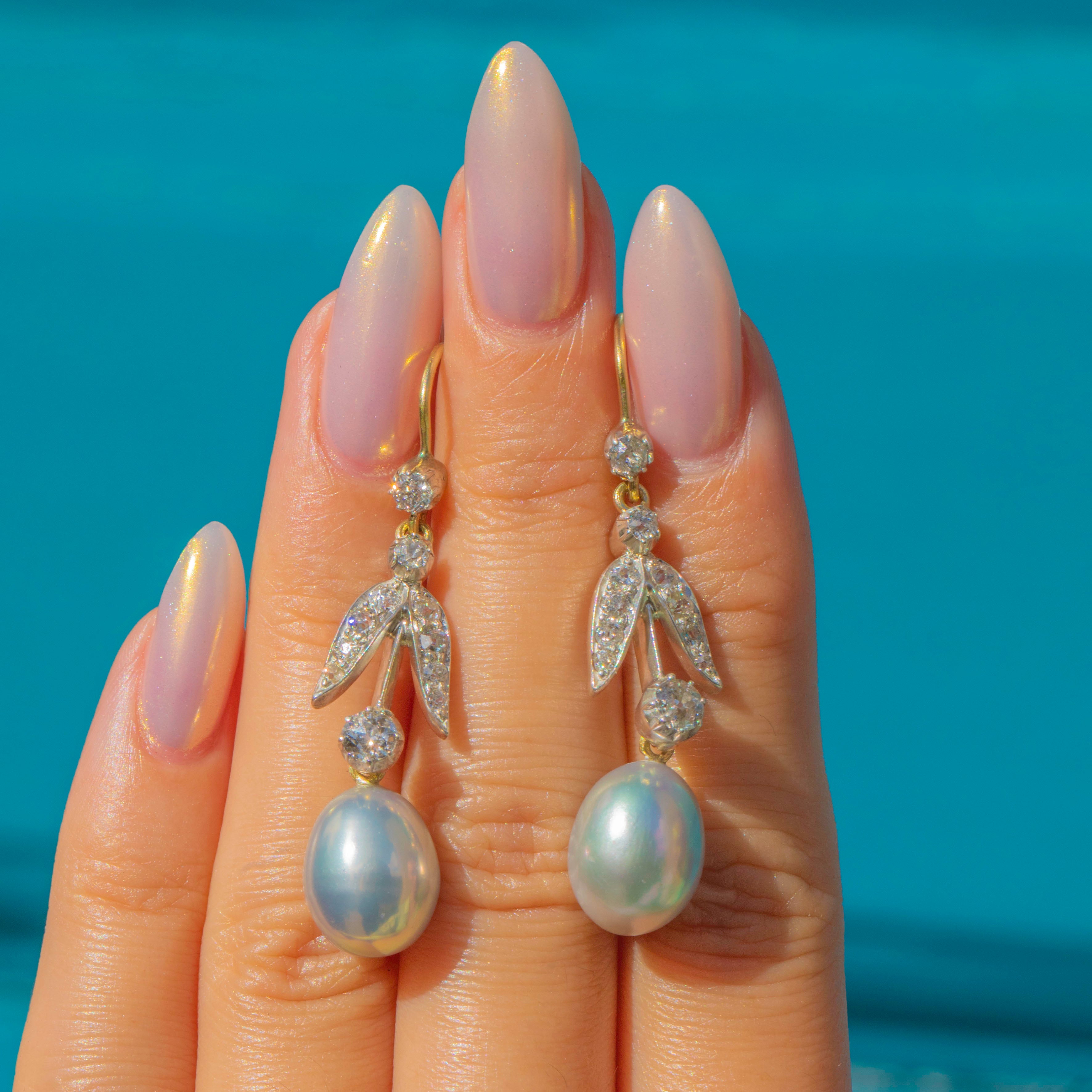 A stunning pair of Edwardian drop earrings, designed with natural elegance and refinement. Each earring suspends a lustrous Pearl from a delicate leafy motif set with Diamonds. The graceful leaves are crafted in Silver, pavé set with sparkling old-cut Diamonds, while the hooks are fashioned in 18ct Gold—a classic Edwardian combination of precious metals.
