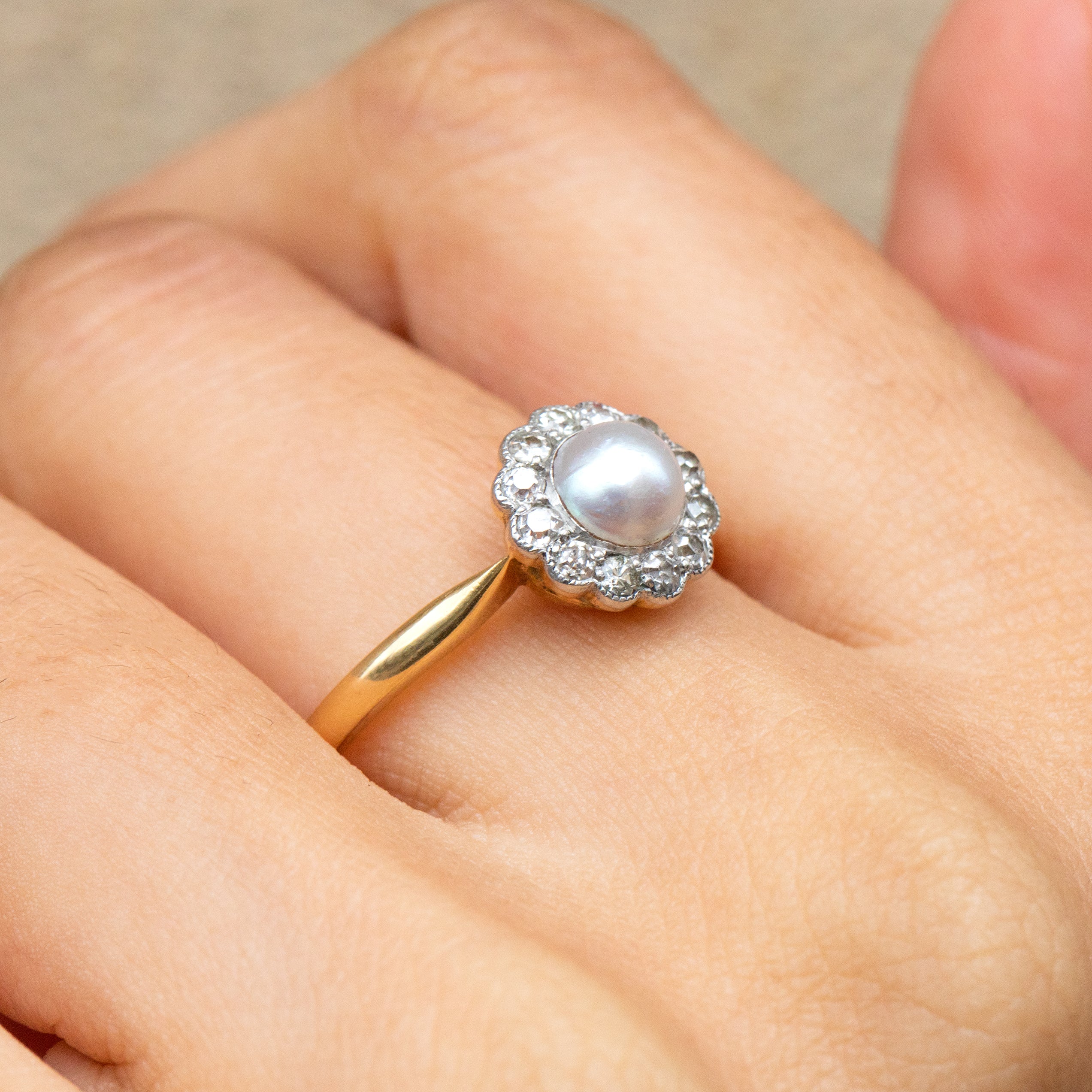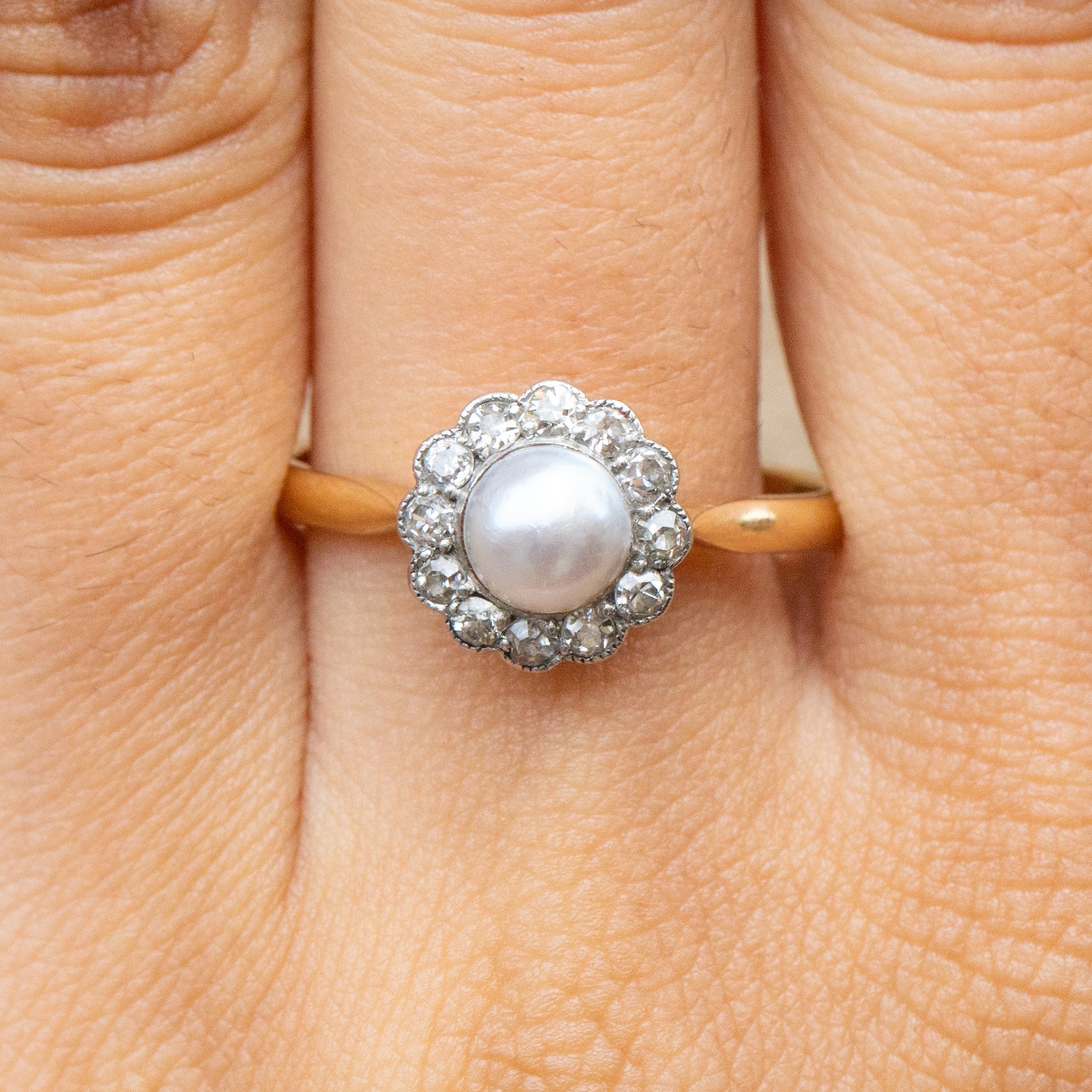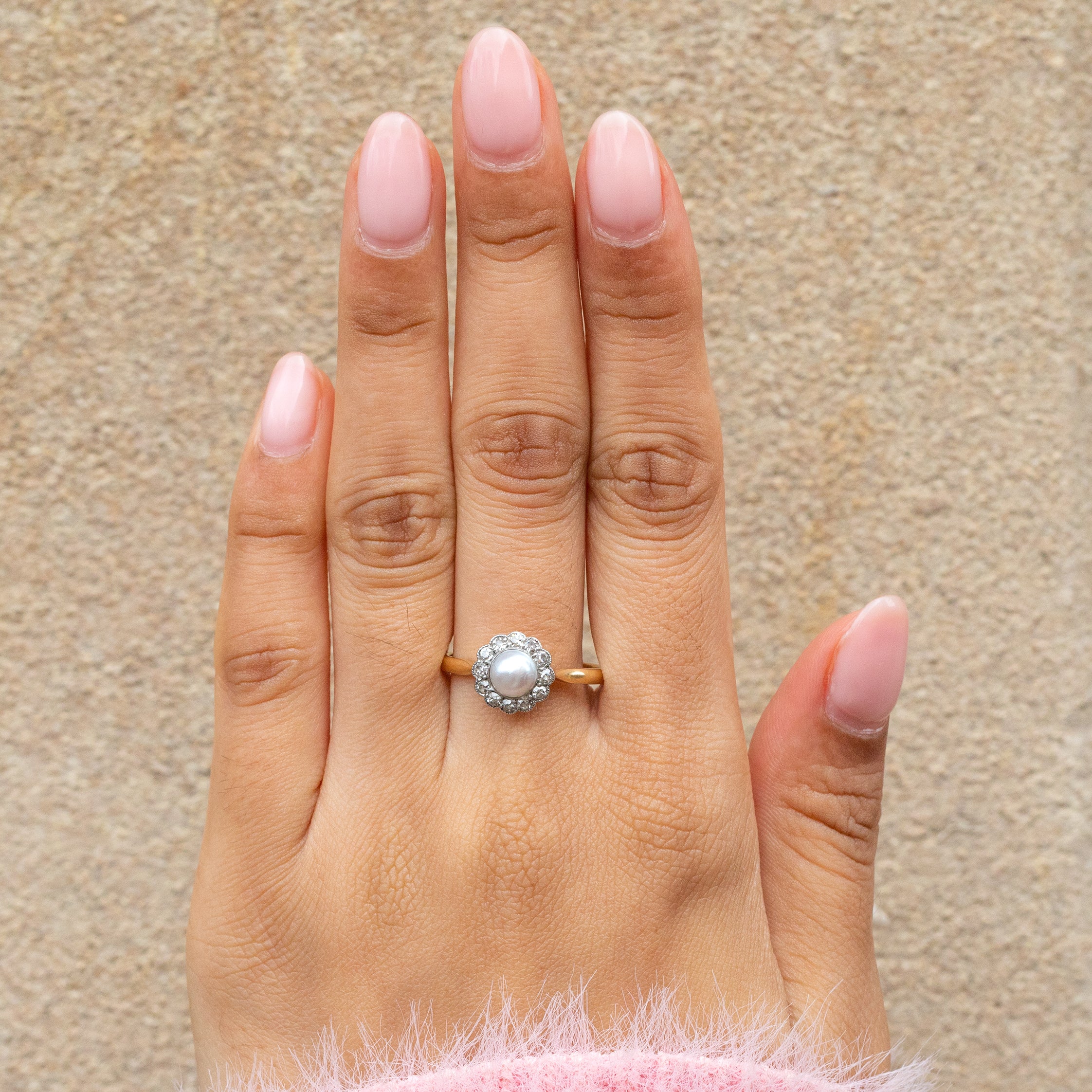 エドワーディアン 18ct ゴールド パール ダイヤモンド デイジー クラスター リング