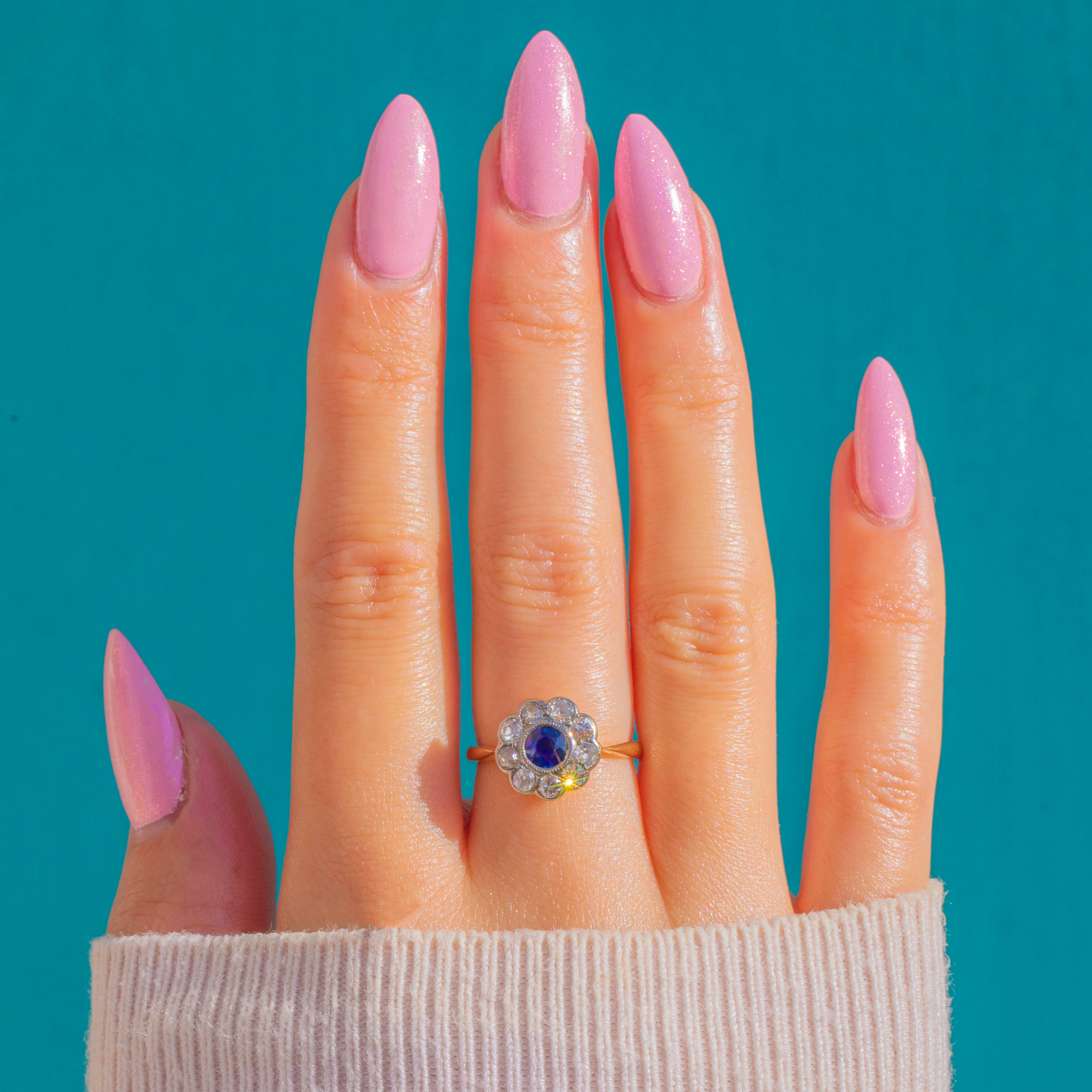 クラシックなEdwardian様式のデイジークラスターリング。中心には濃密でロイヤルブルーのサファイアが輝き、その周囲を明るいラウンドカットダイヤモンドのハローが囲みます。花のモチーフは繊細なミルグレイン仕上げと優美なスカラップ状の縁取りでまとめられ、レースのようなきらめきを添えています。