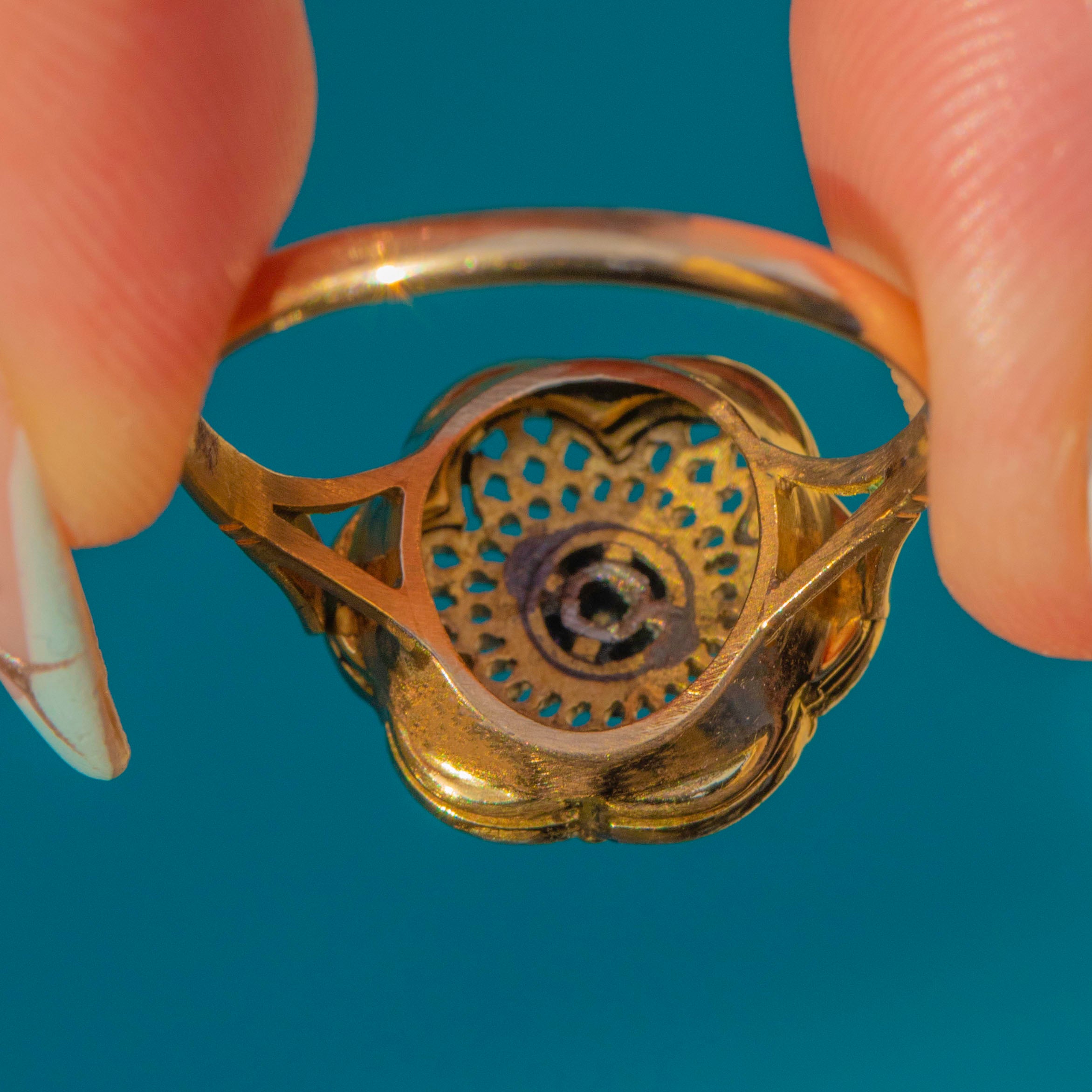 The airy pierced under-gallery and low, wearable profile give this ring its unmistakable period charm. Platinum lends a cool brilliance to the Diamonds and sharpens the crisp detail, while the rich 18ct Gold shank adds warmth—together creating a sophisticated play of colour and light.
