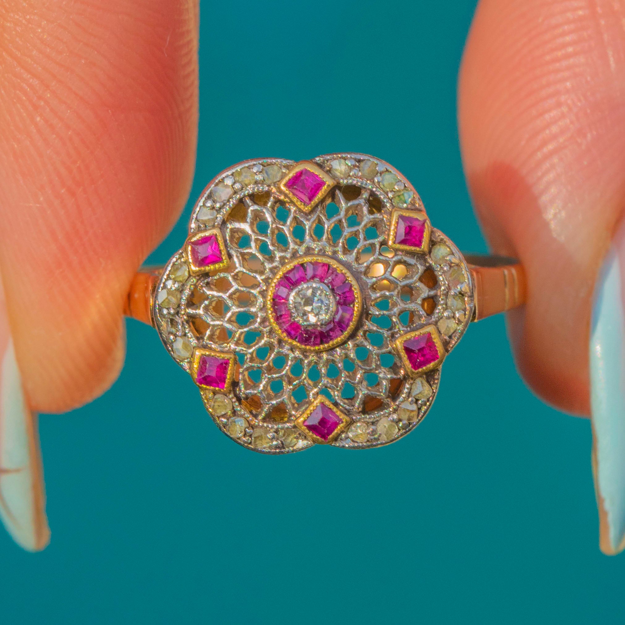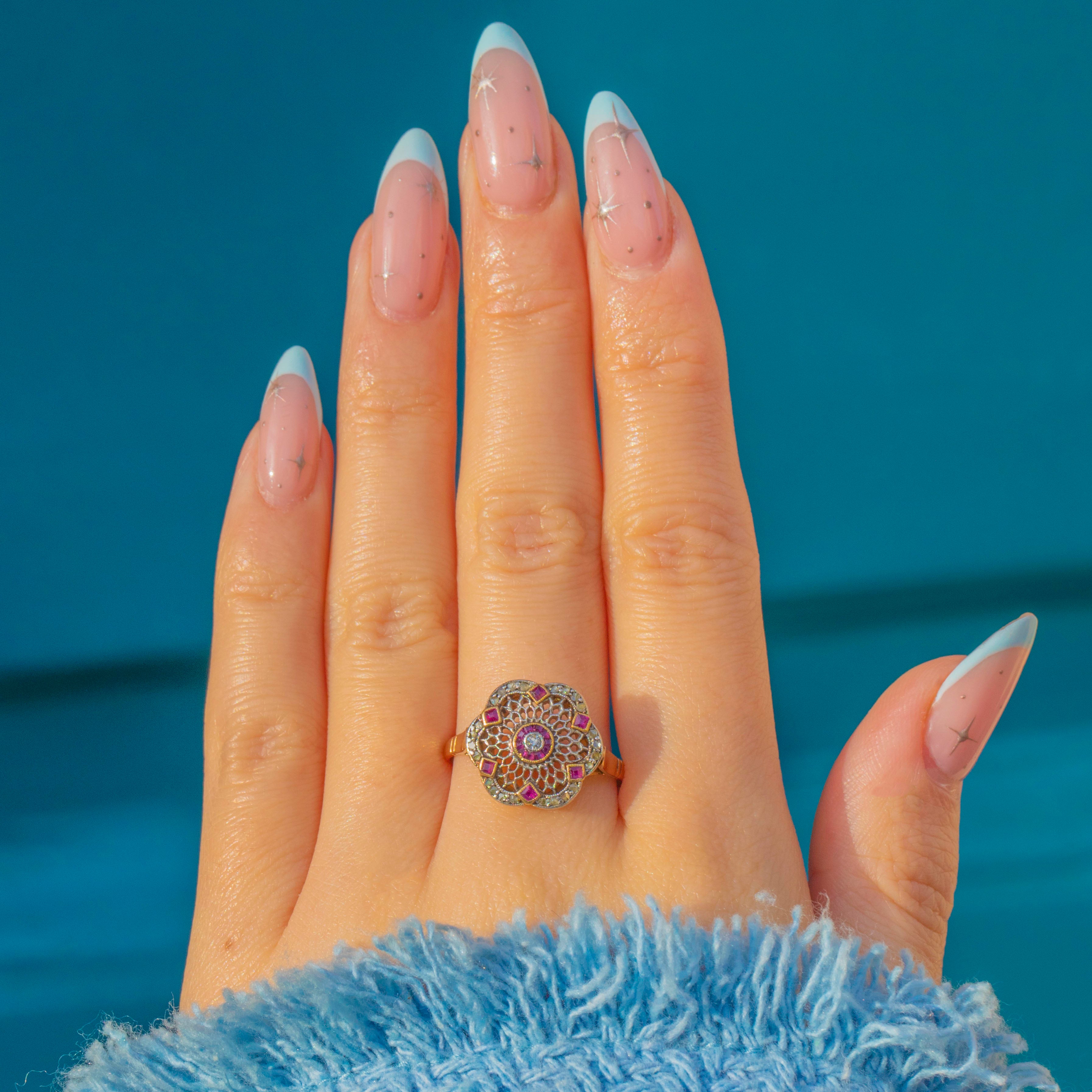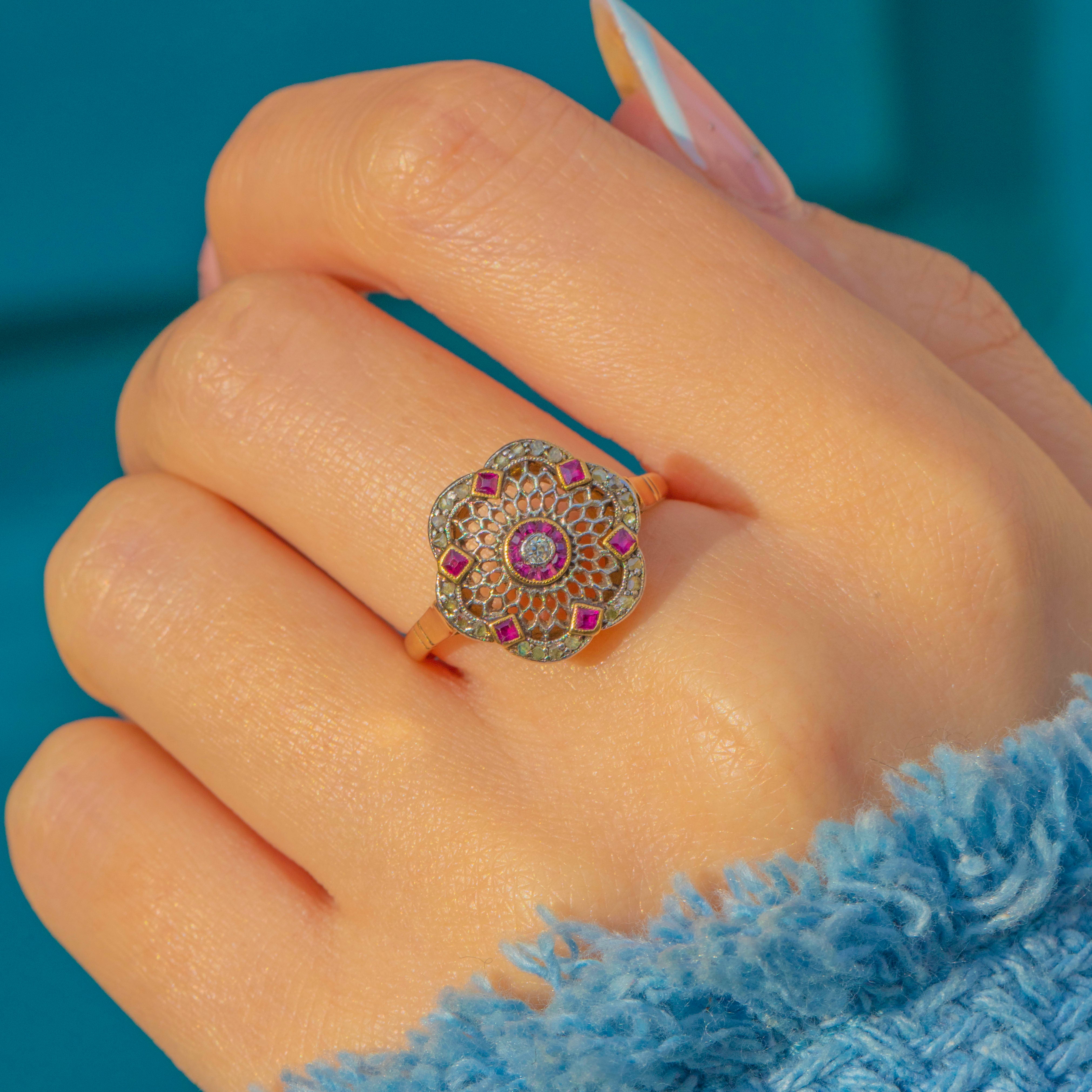 A wonderfully ornate Edwardian filigree cluster ring, crafted in two-tone 18ct Gold with Platinum settings. The lacy rosette head is edged with fine milgrain, centred by a petite round Diamond and framed by a precise circle of calibré-cut Rubies. An elegant scalloped border glitters with delicate rose-cut Diamonds, with tiny square Ruby accents punctuating the perimeter for a refined, jewel-box finish.