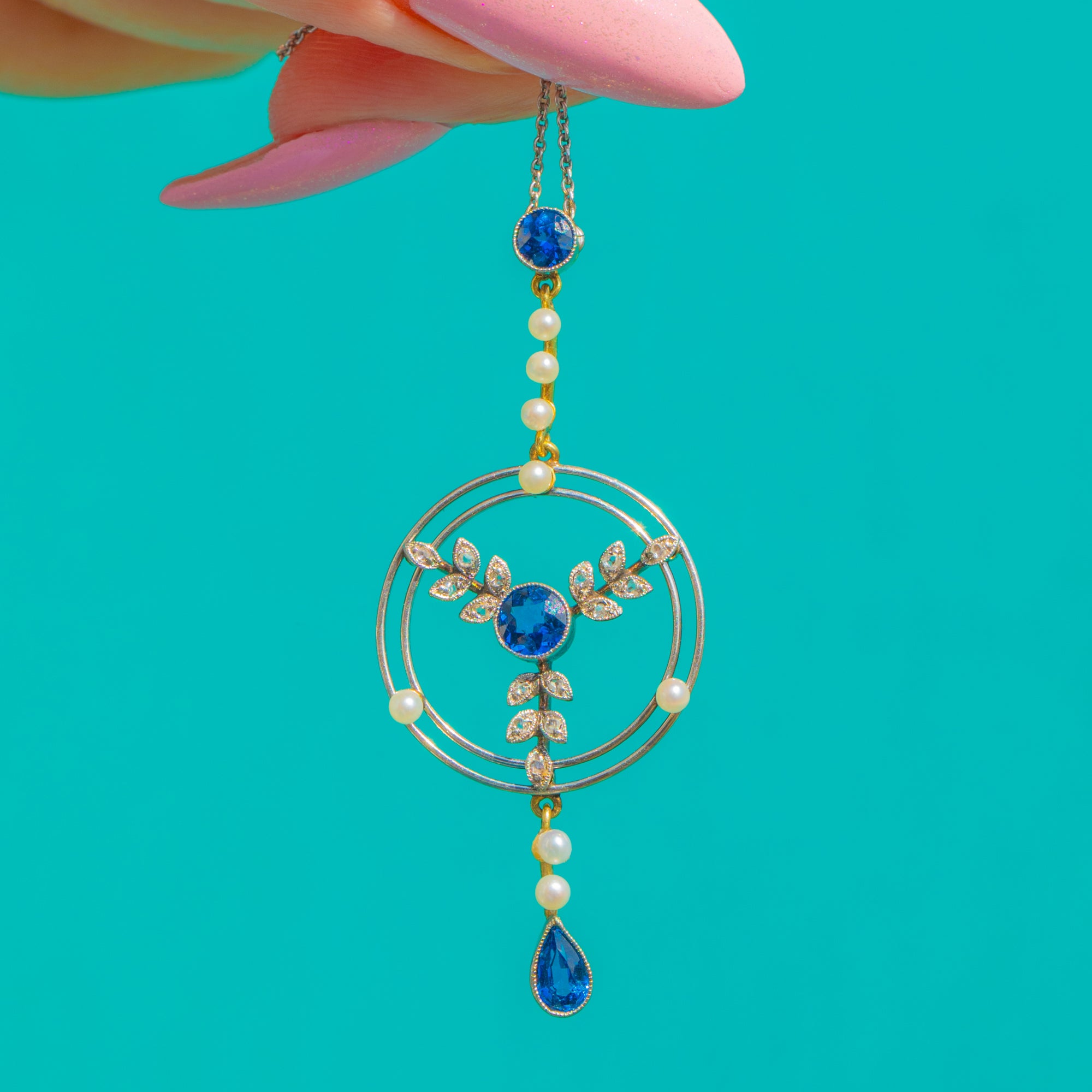 気品とロマンティシズムを湛えたこのEdwardianドロップネックレスは、プラチナの涼やかな輝きと18金ゴールドの温かみを見事に融合させています。中央には深いブルーのサファイアが同心円状のオープンラウンドに配され、繊細な縦のラインを描くナチュラルパールが視線を下へと導き、ペアシェイプのサファイアドロップへと続きます。生き生きとしたダイヤモンドが優美な植物モチーフを縁取り、繊細なミルグレイン装飾と洗練された透かし細工がその輝きを一層引き立てています。