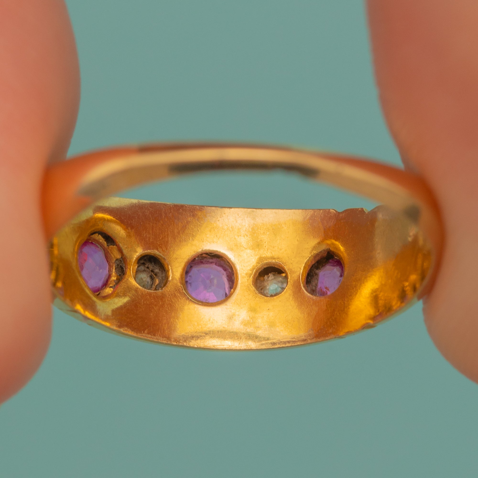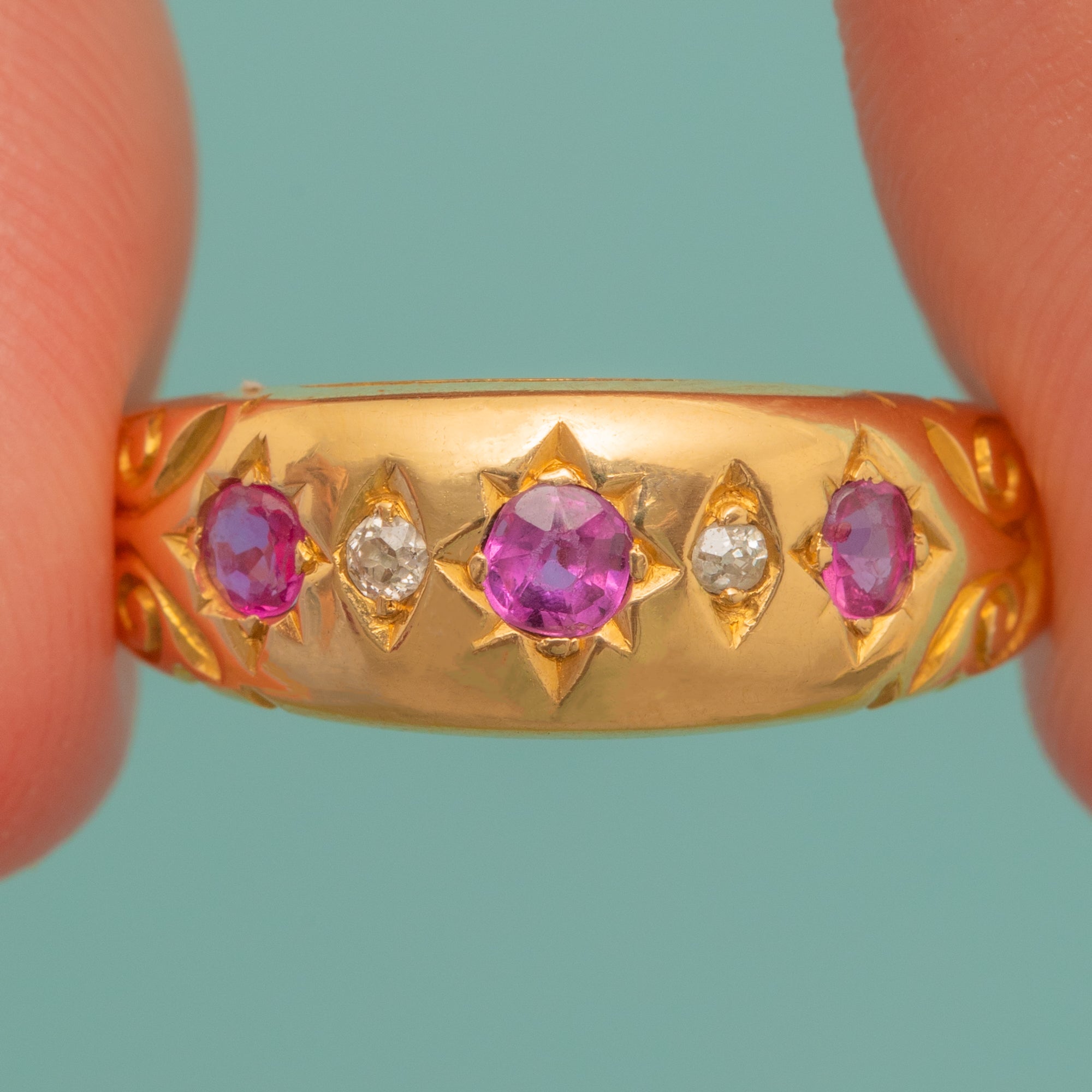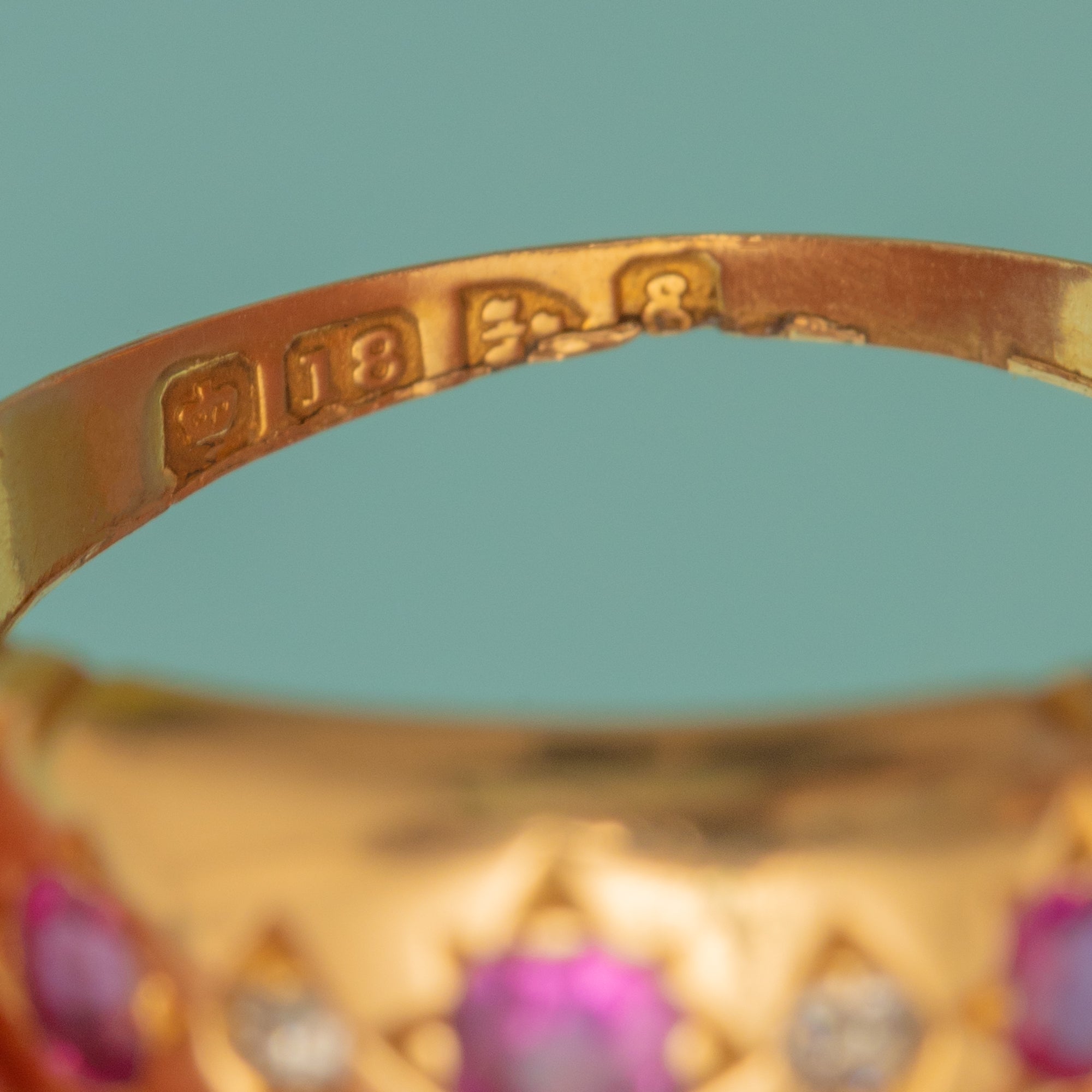VERY GOOD. A very good Edwardian 18ct Gold Ruby Diamond gypsy ring! This five stone beauty has secure gemstones and visible hallmarks, despite its grand age. The back of the band has worn down slightly from lots of loving wear, meaning it has a slight concave shape.