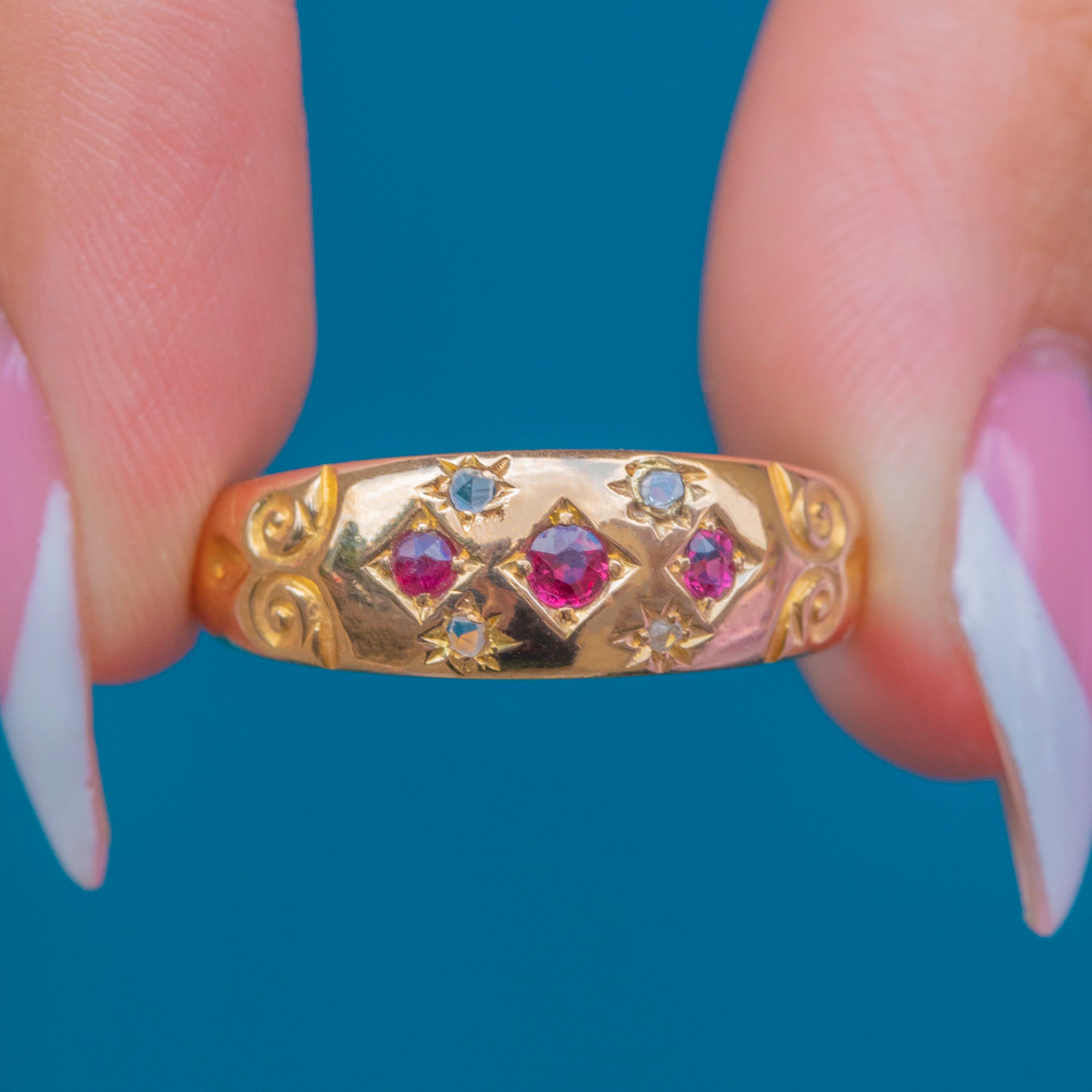 She will satisfy your penchant for celestial jewels, boasting three star-set gemstones in her centre. With Rubies akin to juicy raspberries flanked by twinkling rose-cut Diamonds, this ring is a timeless Edwardian piece that you will treasure forever.