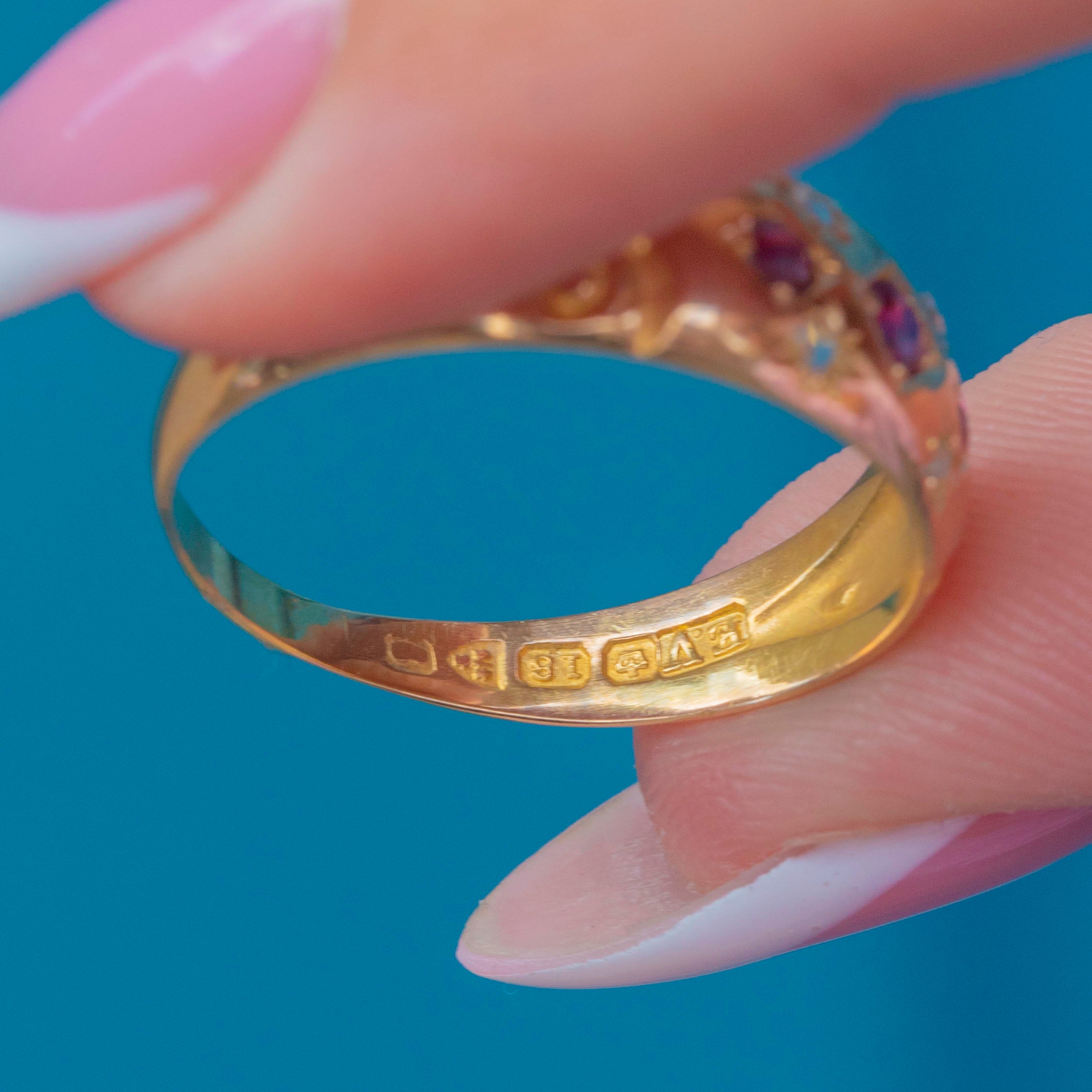 A sublime antique 18ct Gold gypsy ring fully hallmarked to 1903. Crafted from buttery, saturated 18ct Gold, she features ornately engraved shoulders and possesses a gorgeous glossiness!