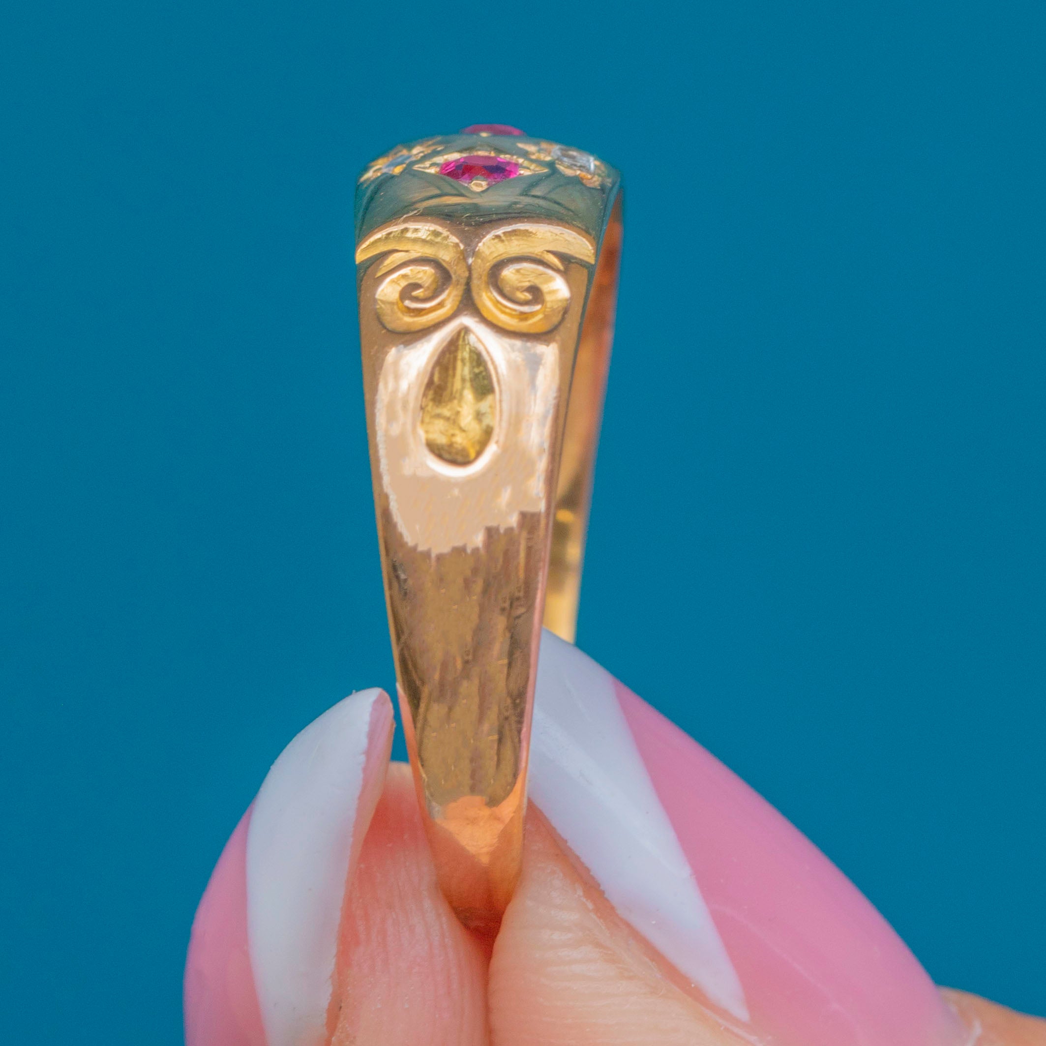 MATERIALS: Tests as 18ct Gold, Ruby, Rose-Cut Diamond.