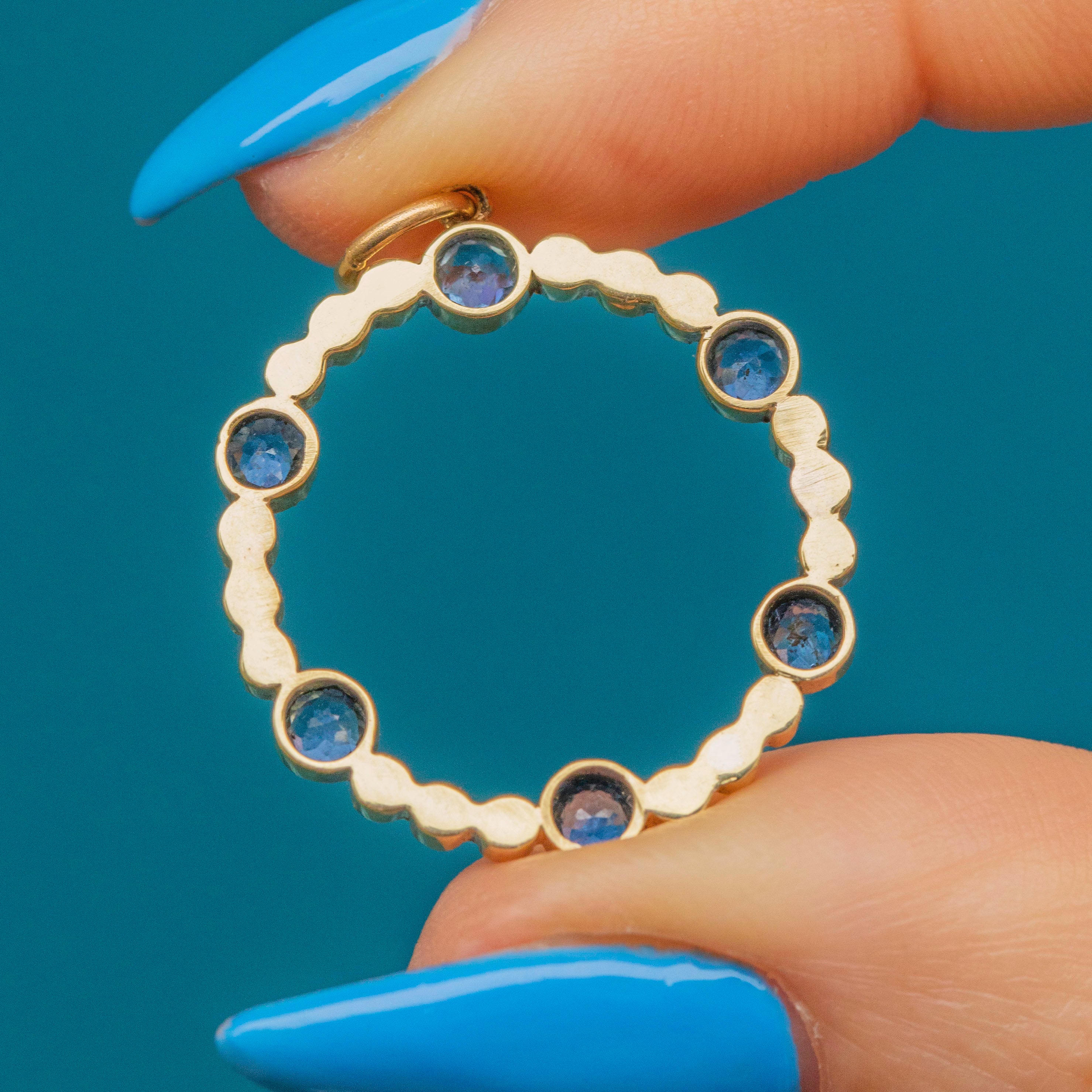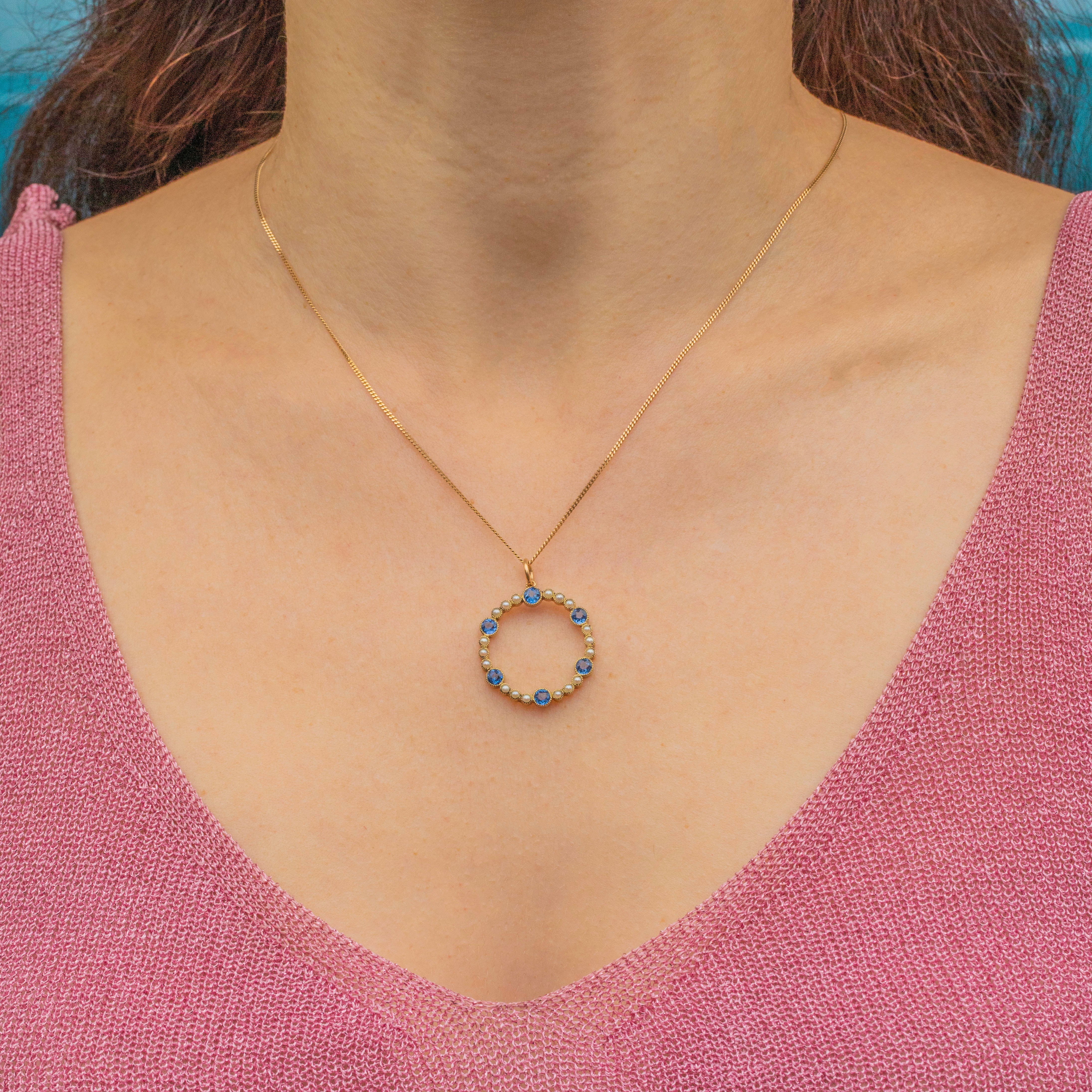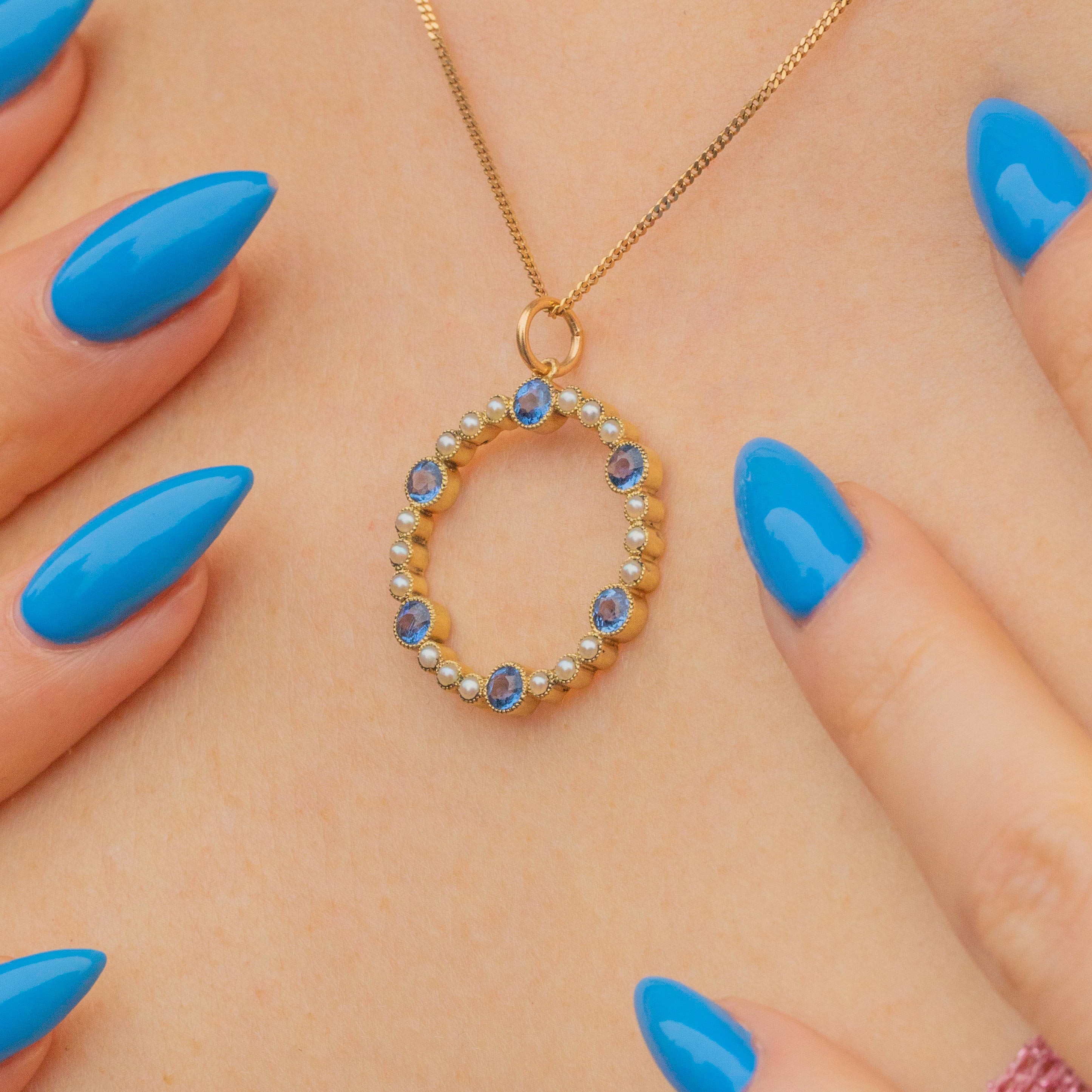 EXCELLENT. We are pleased to present this Edwardian 18ct Gold Sapphire roundel pendant in excellent condition. Both her Sapphires and Pearls are gorgeous, radiating vibrant hues and complimenting each other wonderfully. Free from any visible signs of wear and in secure condition, this Edwardian pendant is a must-have!