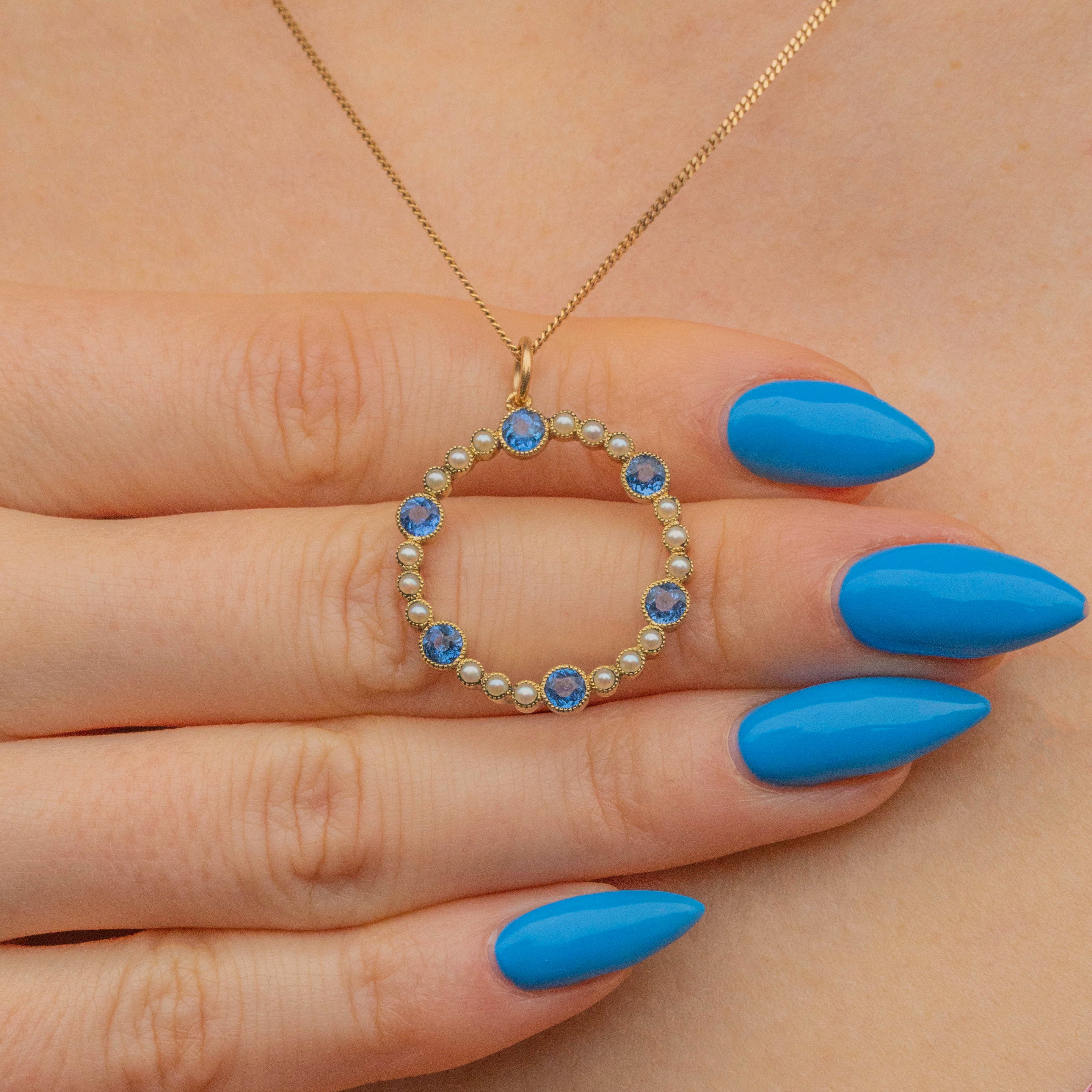 Add a touch of sophisticated charm to your collection with this Edwardian 18ct Gold Sapphire Pearl roundel pendant!