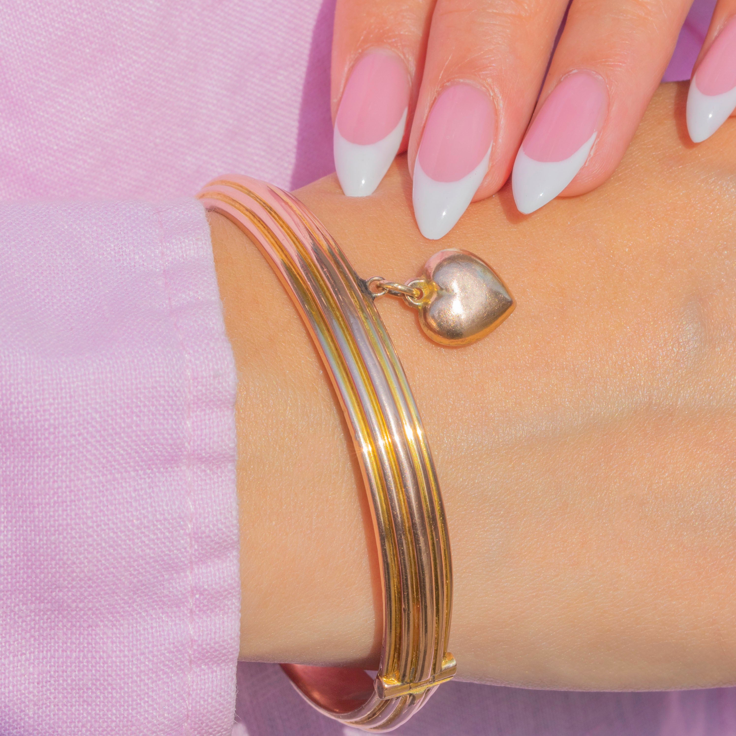 VERY GOOD-EXCELLENT: The Gold is rosy and bright and her grooves have remained crisp. There are some spots of discolouration and light surface wear to the Gold, particularly near the clasp and the charm, though this is not overtly evident during wear. With her heart charm securely soldered and complete with a safety chain, you can wear this engraved bangle with utmost confidence!