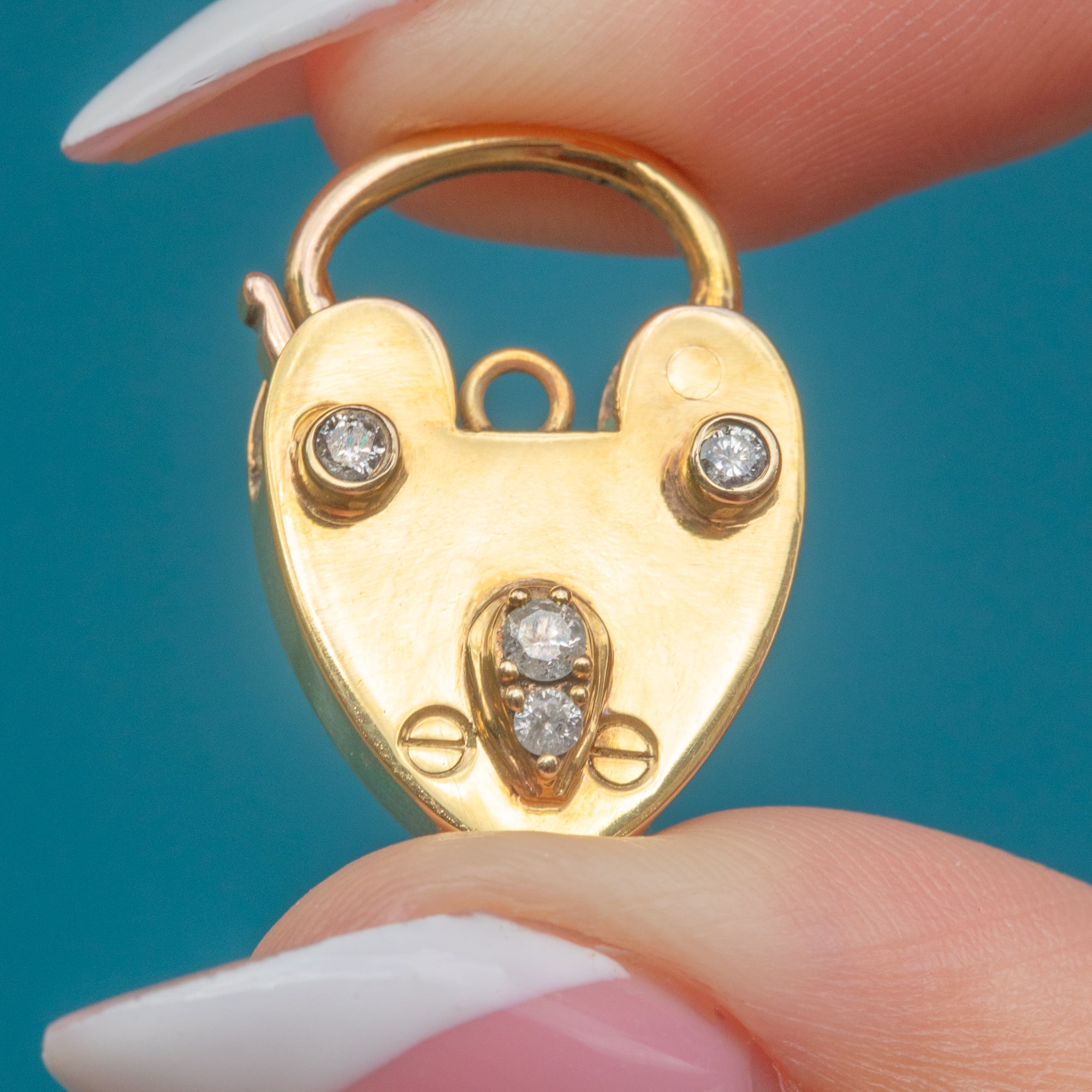 Crafted from bright and glossy 9ct Gold, this antique padlock pendant has been fashioned into an adorable heart motif and is adorned by four scintillating Diamonds, adding a sparkling accent.