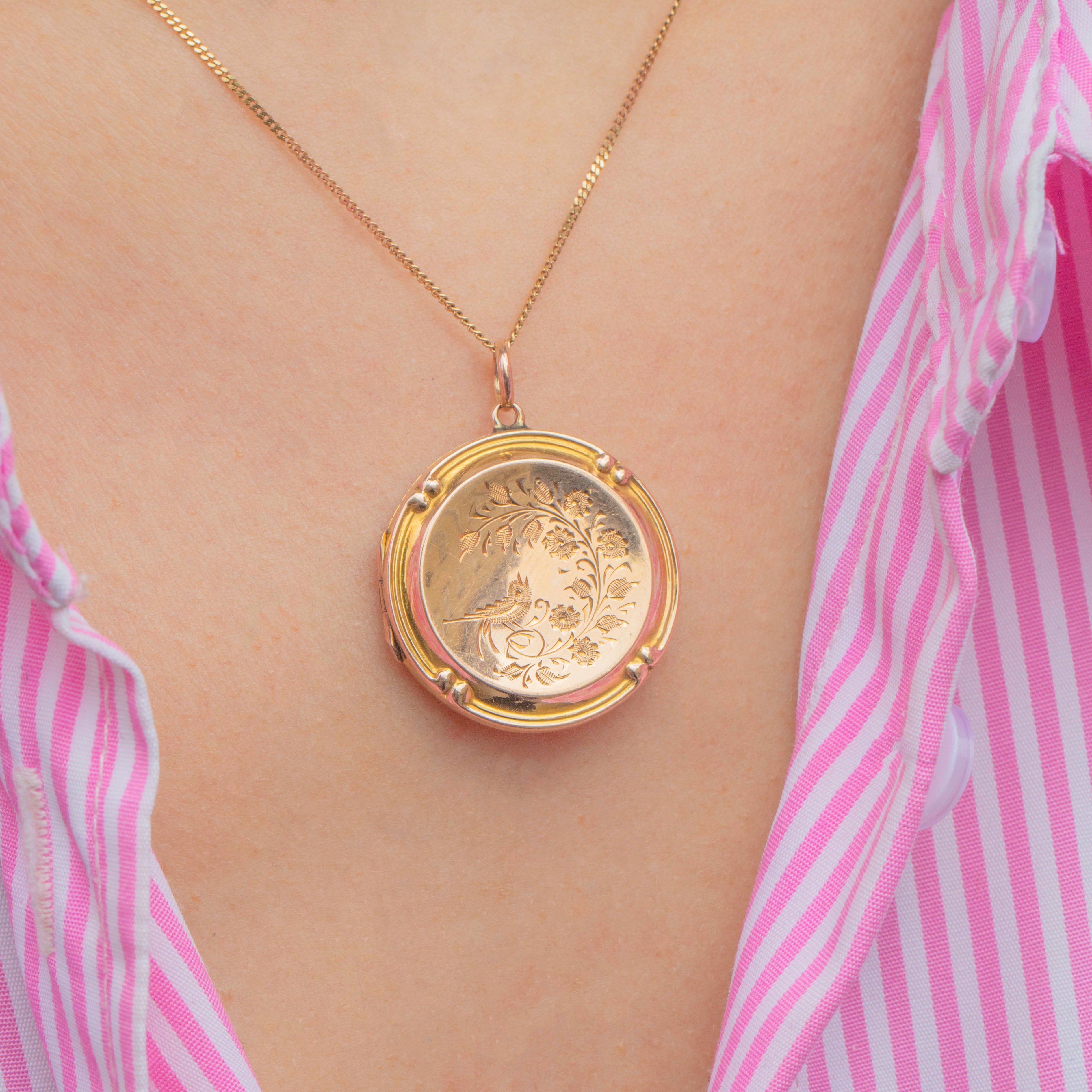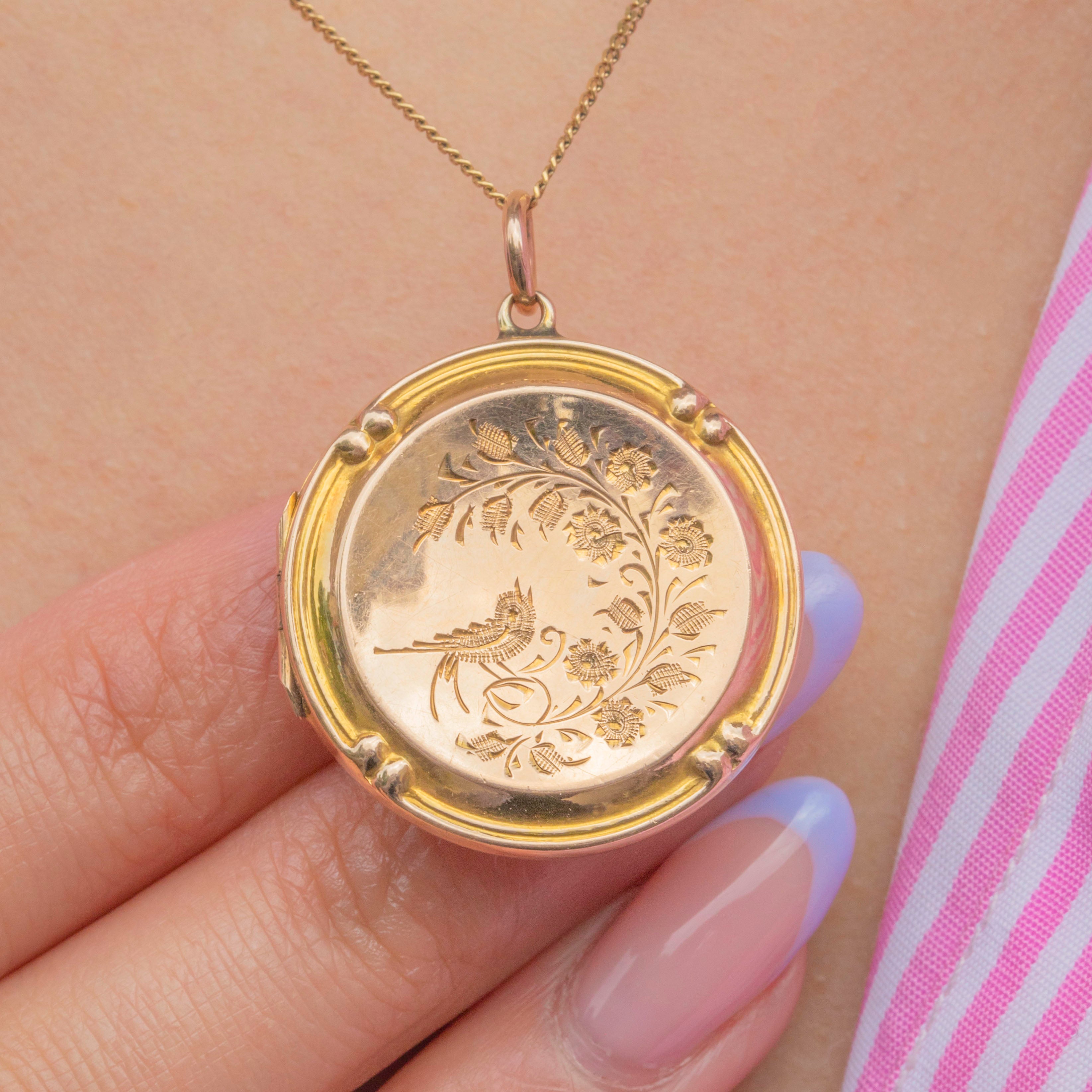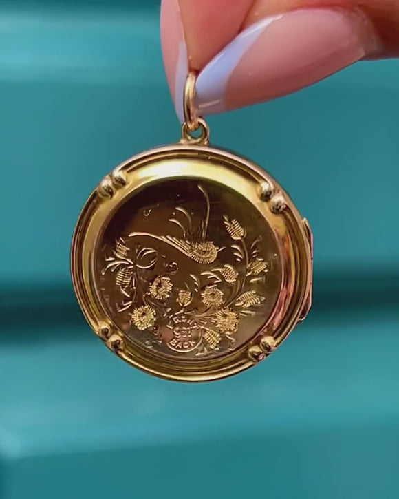 This Edwardian 9ct Gold engraved bird in flight round locket is as pretty as a picture! Intricately engraved with swallows and floral motifs, this antique locket is steeped in romantic sentiment.
