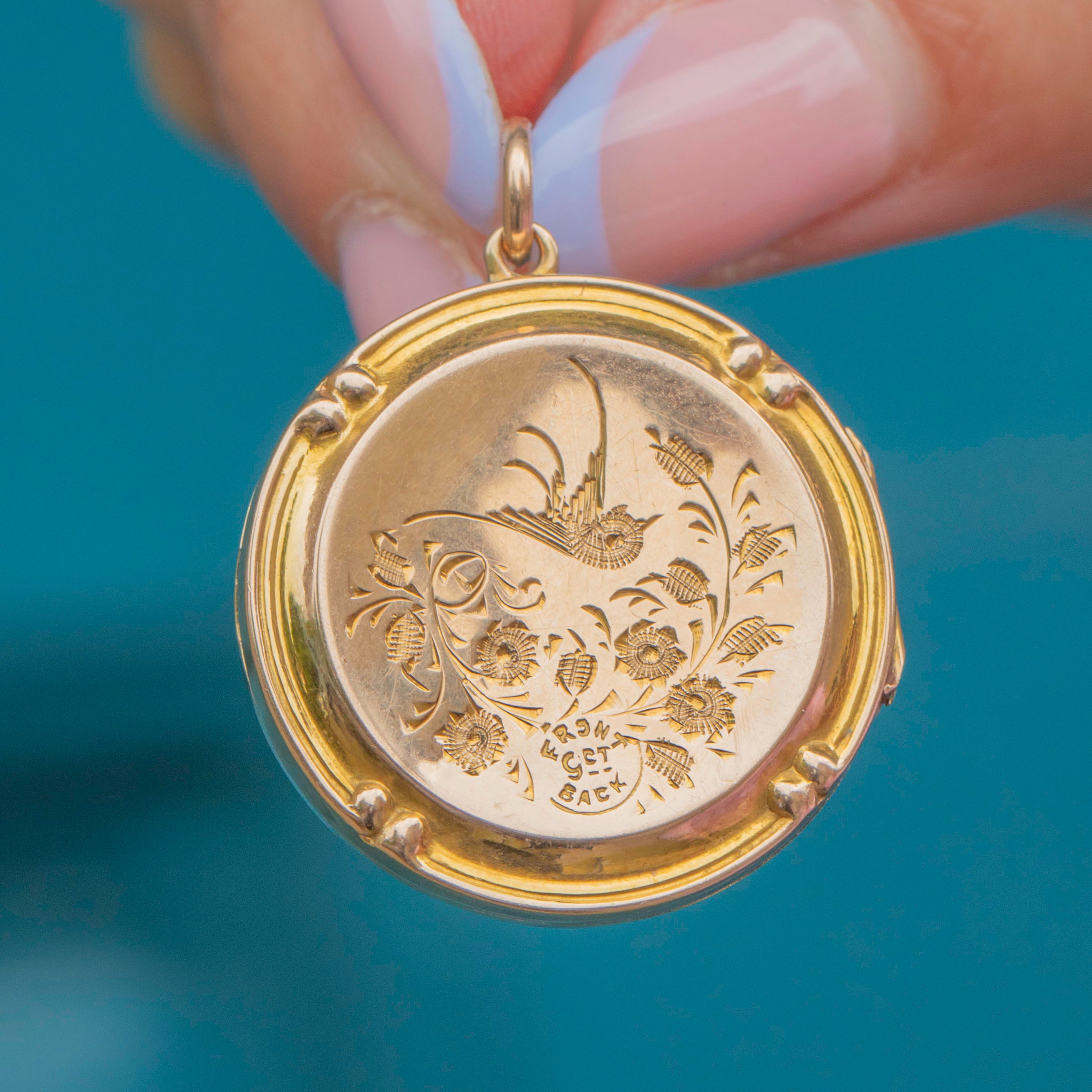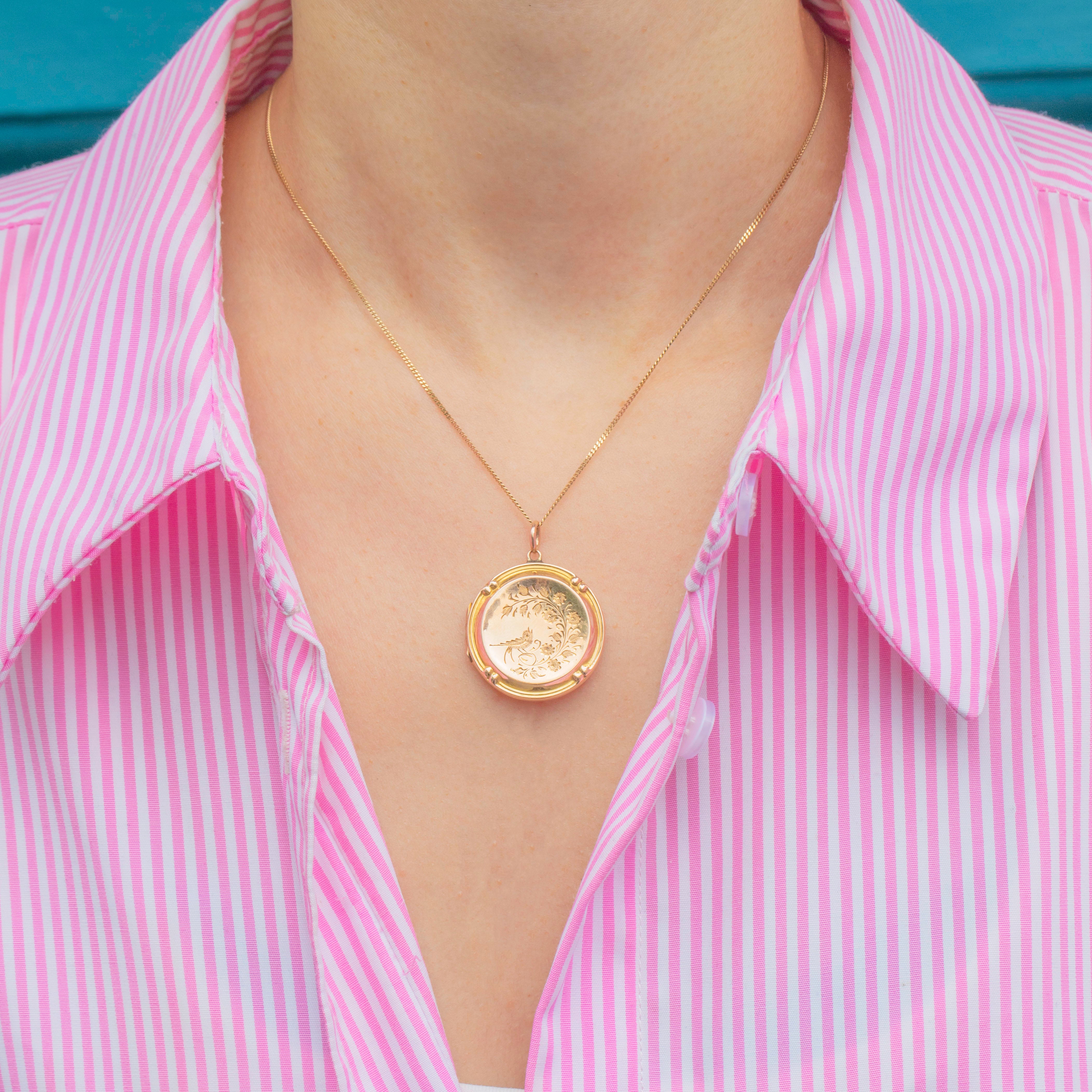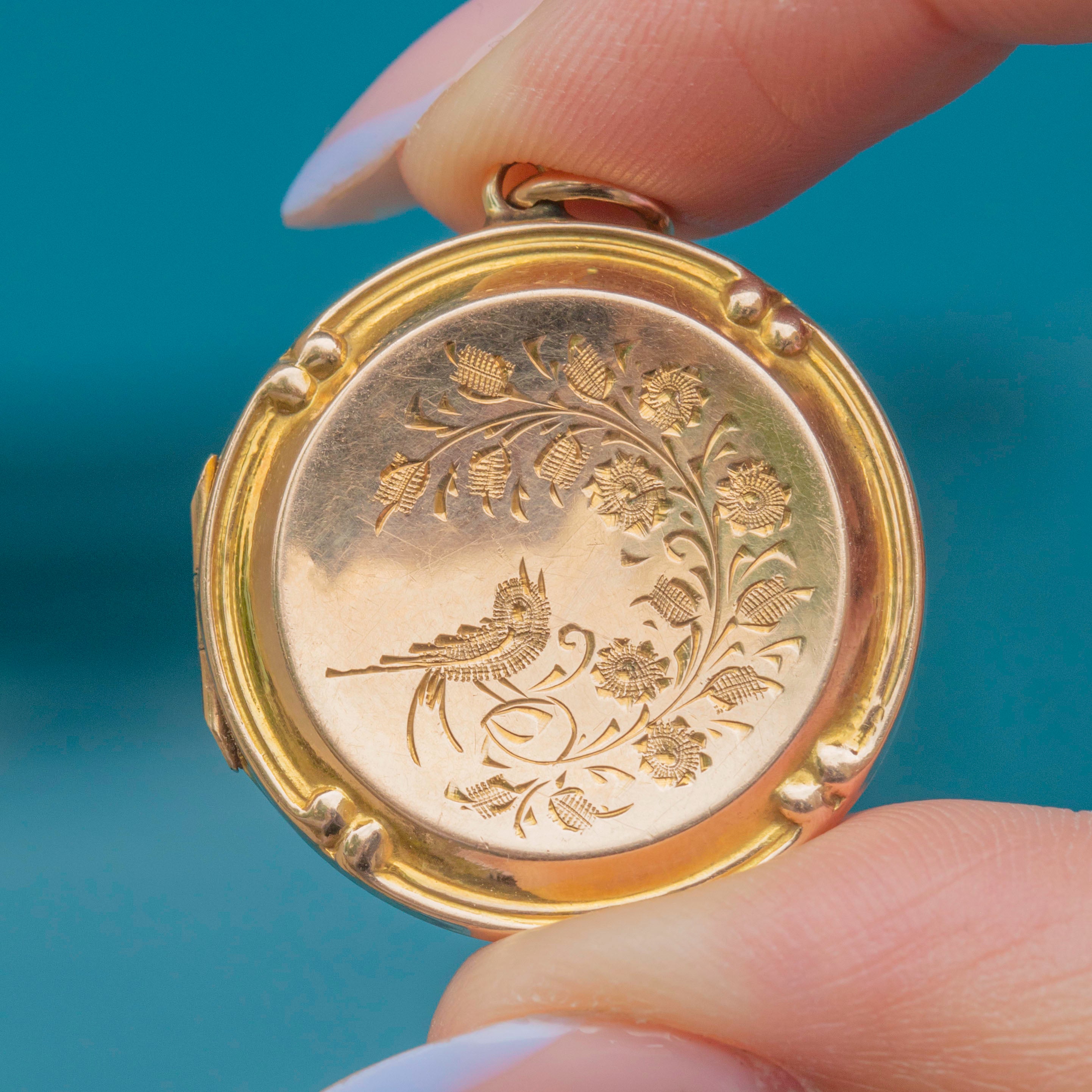 This Edwardian 9ct Gold engraved bird in flight round locket is as pretty as a picture! Intricately engraved with swallows and floral motifs, this antique locket is steeped in romantic sentiment.