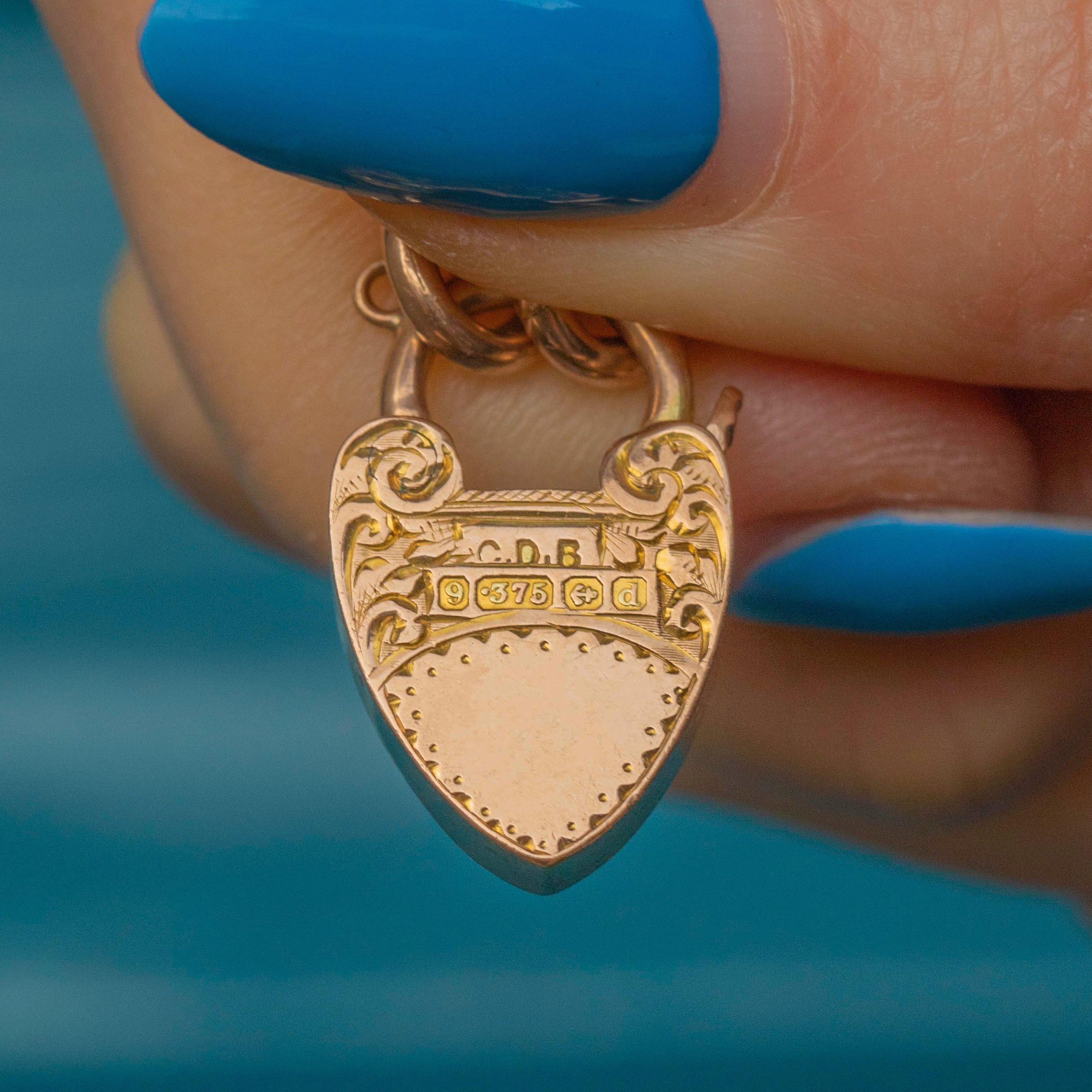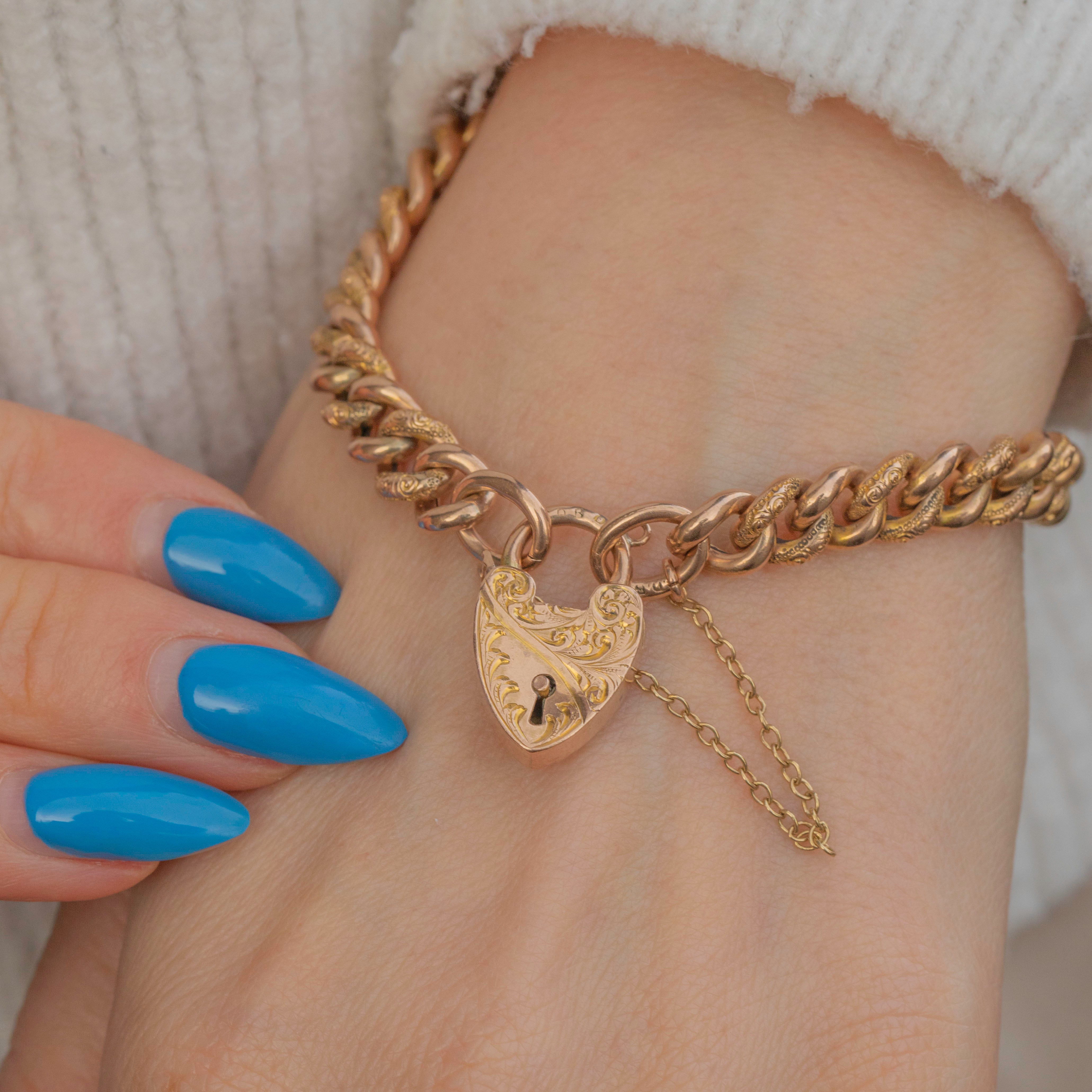 This Edwardian 9ct Gold engraved curb link bracelet is simply stunning! Crafted from 15 grams of solid 9ct Gold, this antique bracelet showcases an engraved heart-shaped padlock as her centrepiece.