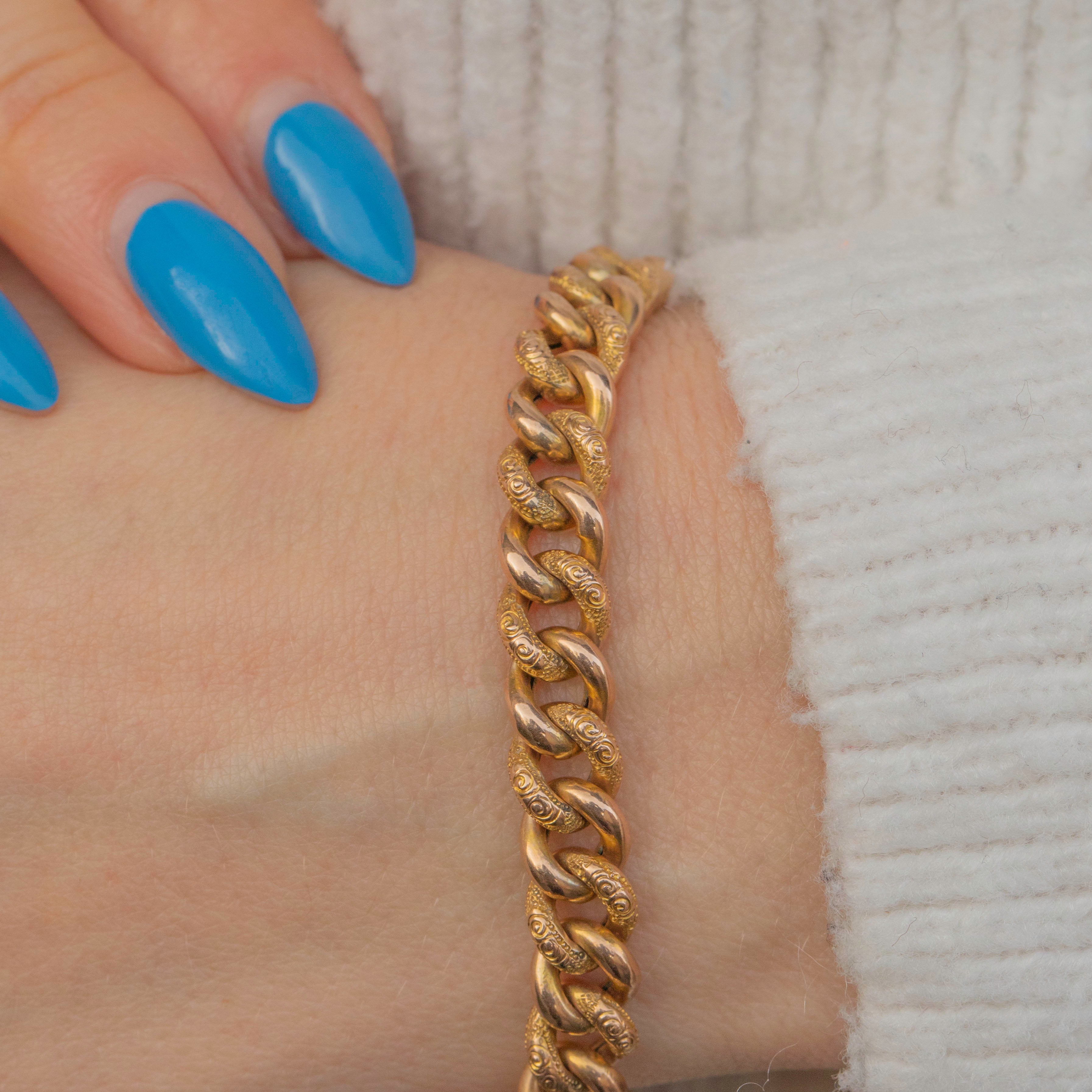 VERY GOOD-EXCELLENT. This Edwardian 9ct Gold engraved curb link bracelet is in lovely condition. The links and padlock are beautifully detailed and the engravings have remained crisp. There are a couple of minor dings on the back of the padlock, however this is not visible during wear. The bracelet has been finished with a Gold safety chain for extra reassurance allowing you to wear her confidently all day long!
