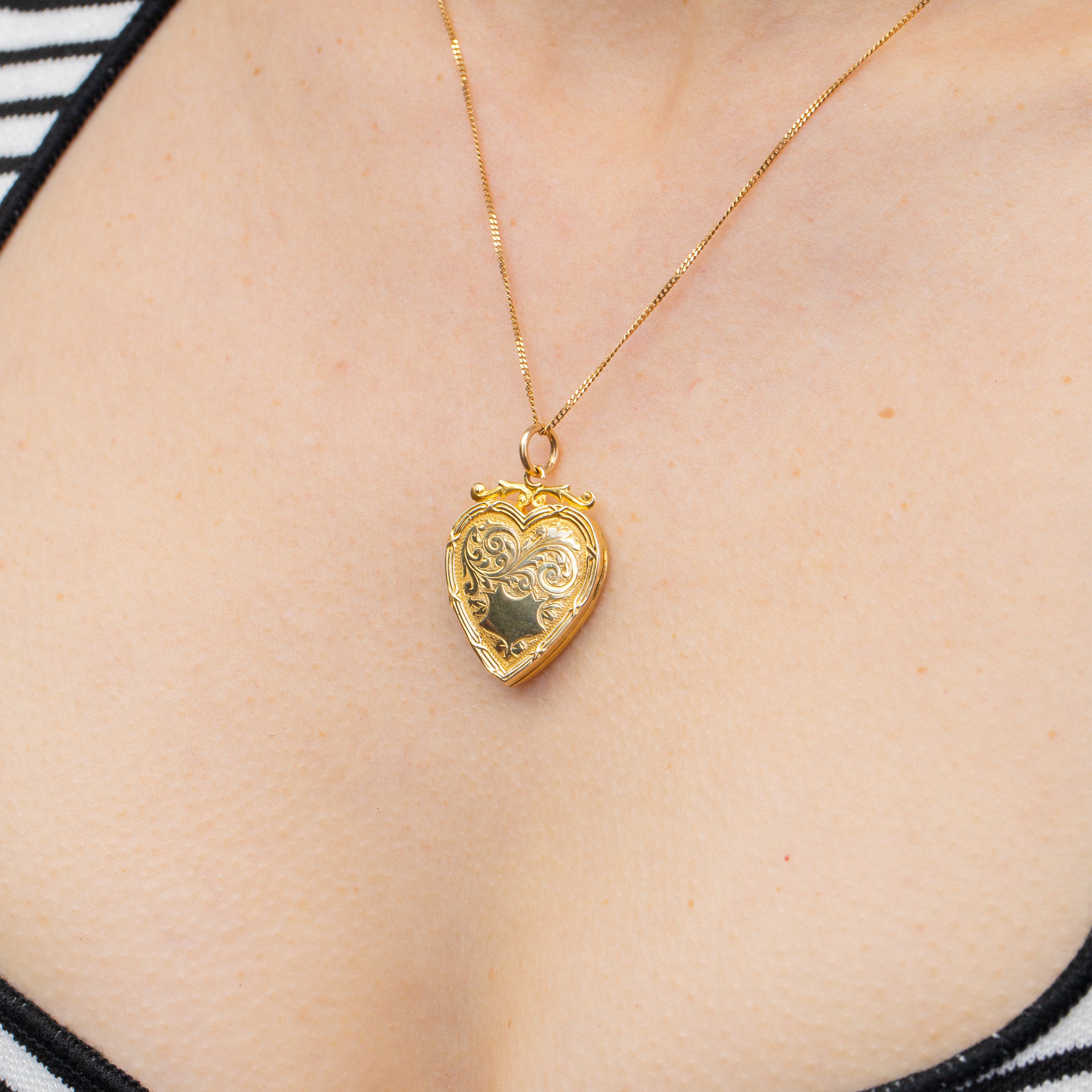 How delicious is this Edwardian 9ct Gold engraved heart locket! Engraved acanthus leaves adorn her front and her back boasts ivy leaves, both with a history of romantic symbolism. Crafted from rich 9ct Gold, the light bounces off of her, with a spectrum of sunny hues gleaming from front to back.