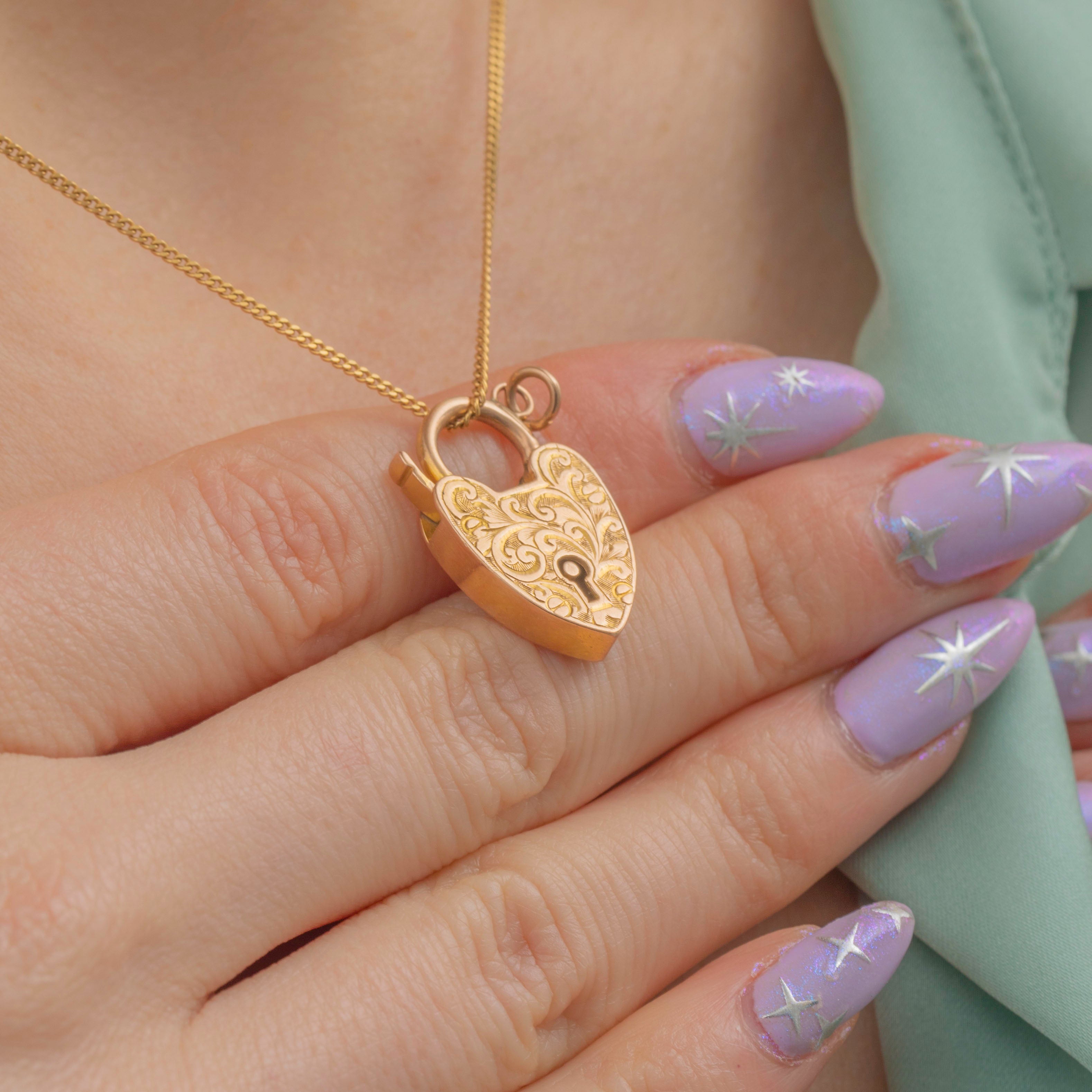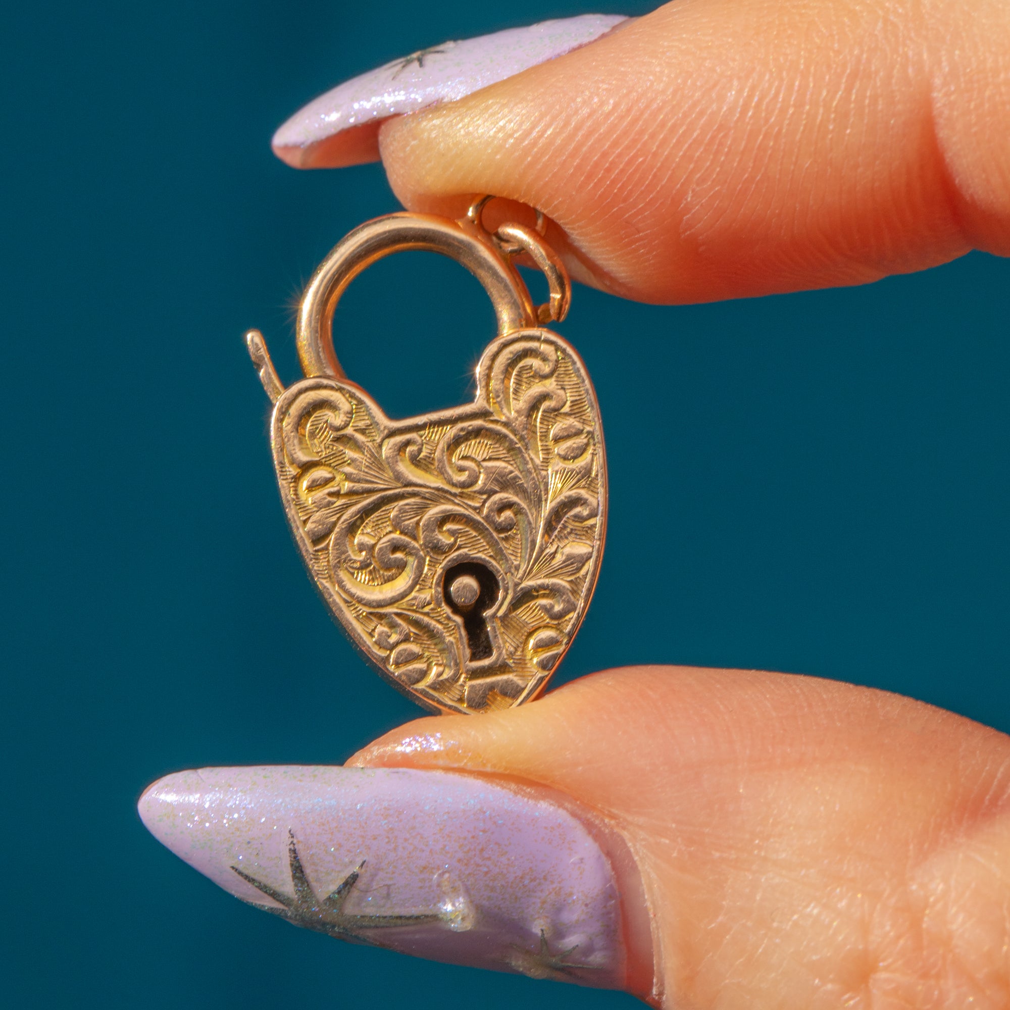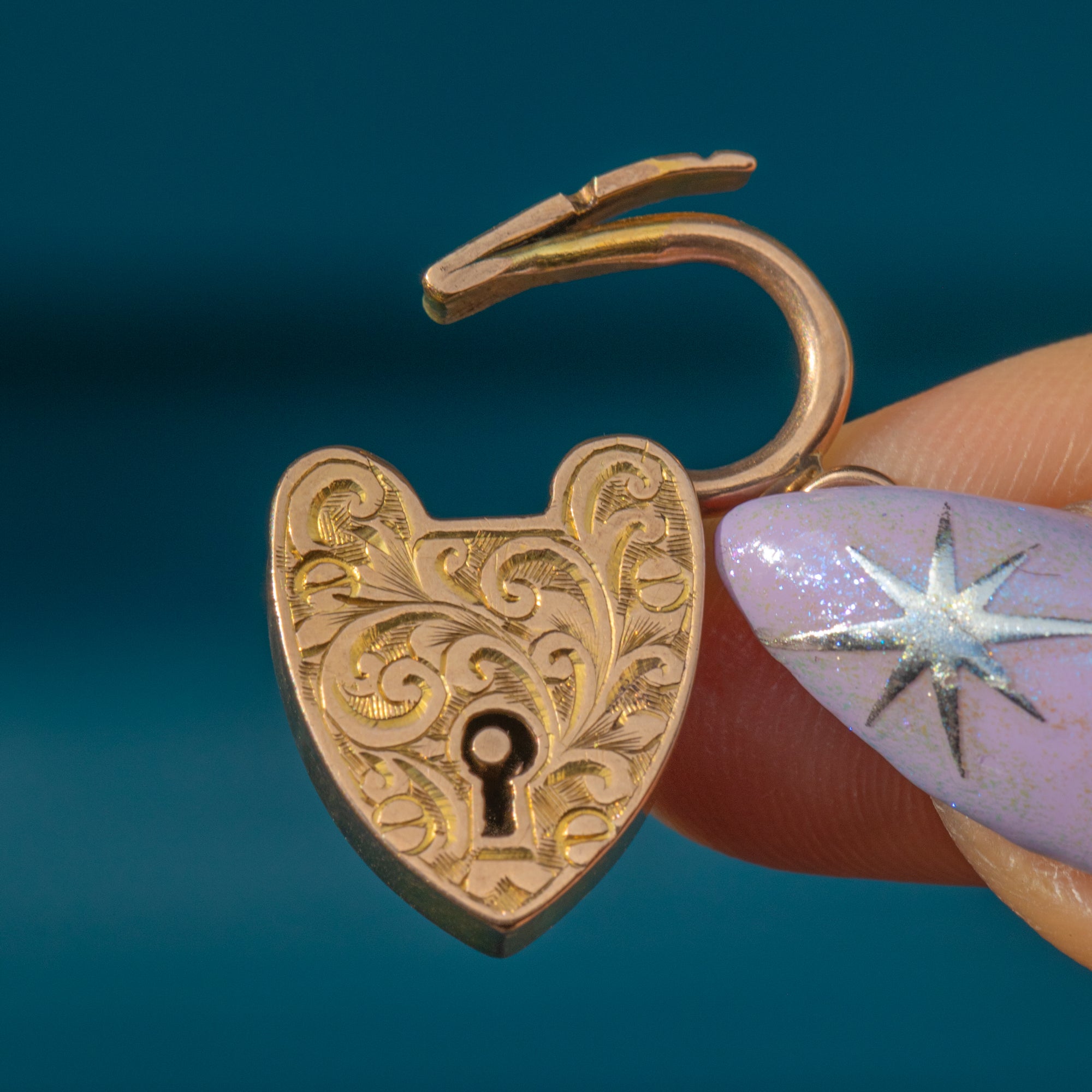 EXCELLENT. This Edwardian 9ct Gold engraved heart padlock pendant is in excellent condition. The Gold is buttery and the engraved details have all remained defined, catching the light beautifully. There is some minor wear on the sides of the pendant, commensurate with age, which in no way detracts from the beauty or functionality of the piece. The locking mechanism works perfectly, allowing you to confidently suspend this antique heart padlock from a chain or bracelet of your choice!